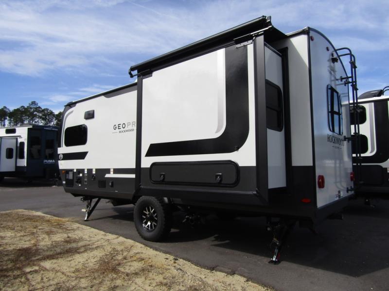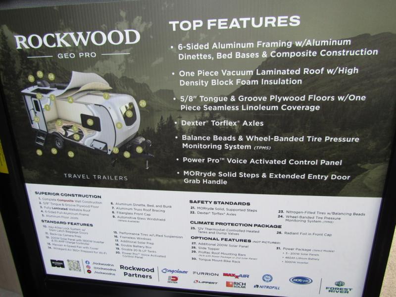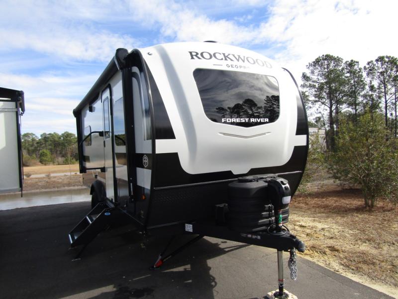 With any Rockwood GEO Pro travel trailer by Forest River you will enjoy easy towing, durable construction, and off-road capabilities with larger laminated roof! Each model is constructed with complete composite wall construction for added strength and durability, and Dexter® axles that will make towing easier than ever. Inside, you'll find sleek back up camera prep for added security, a refrigerator and a microwave, plus many other interior amenities that will make you feel at home on the road.