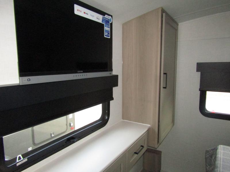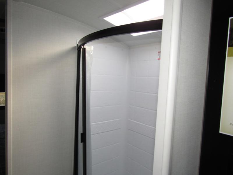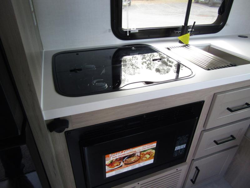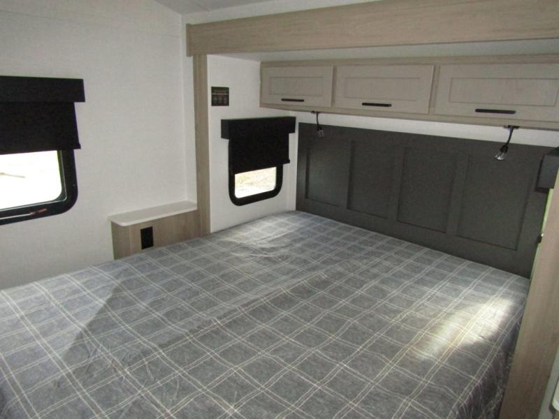 This travel trailer will feel more like home with its front bedroom and walk-around full-size bed. You'll enjoy the 12V TV as you relax on the 72" sofa with a table and cupholders. The full rear bath includes a spacious shower to clean up in each day and there is a linen closet for clean towels. When you're ready to prepare dinner you'll have a three burner cooktop and microwave oven indoors! And don't forget the exterior storage allows you to bring along beach toys and tackle boxes. The optional Power Package available on this model includes three 200W solar panels, a side solar plug-in, a 3kW 160A inverter, and more off-grid features!