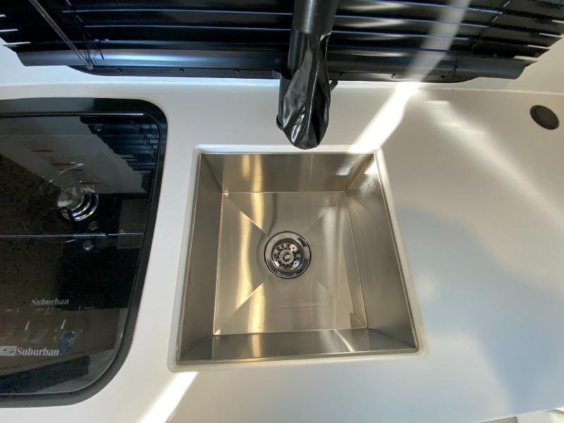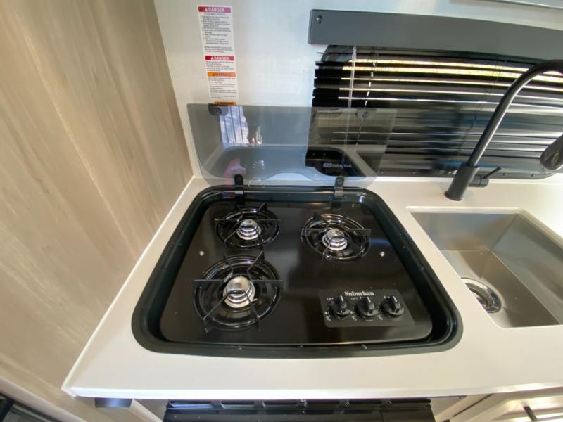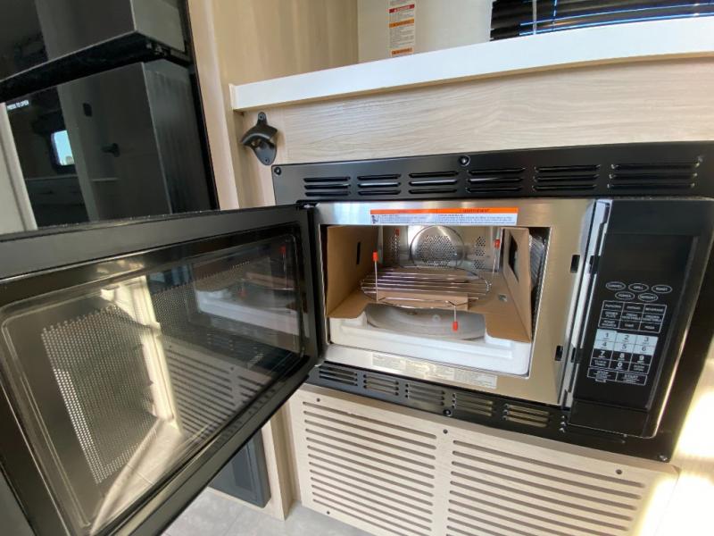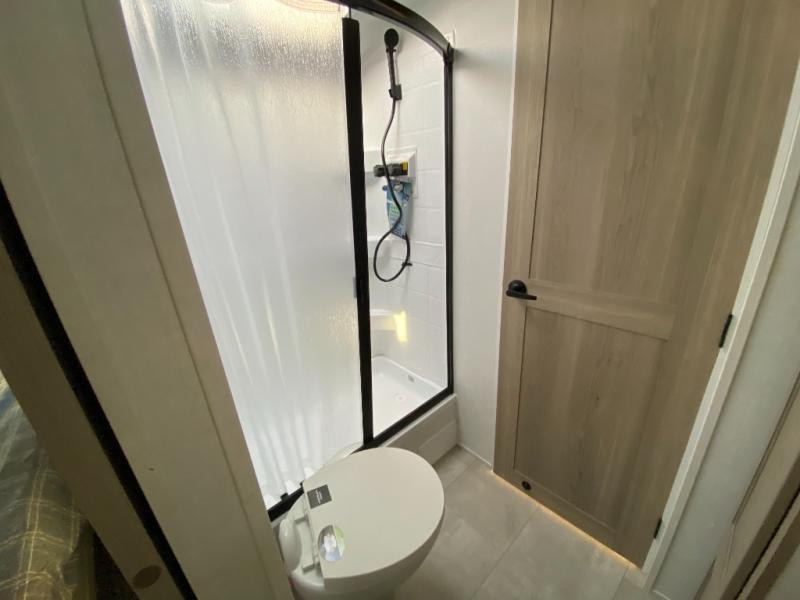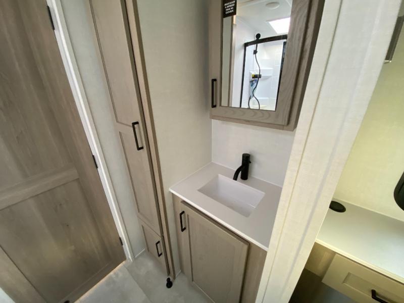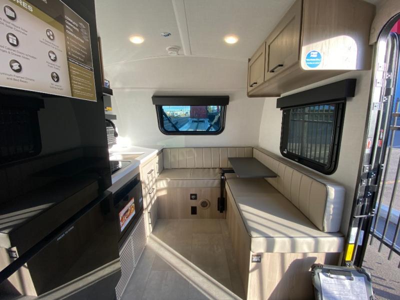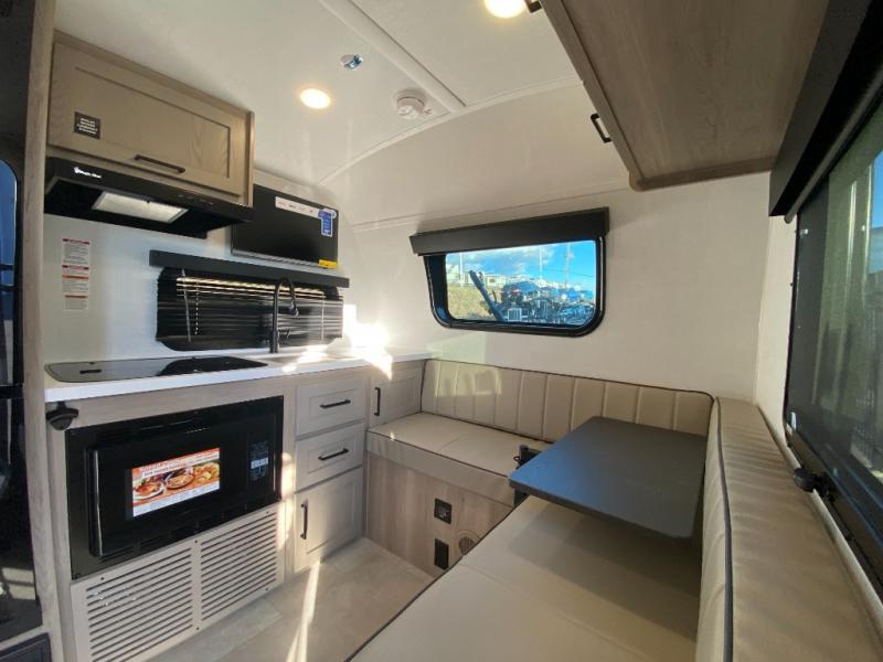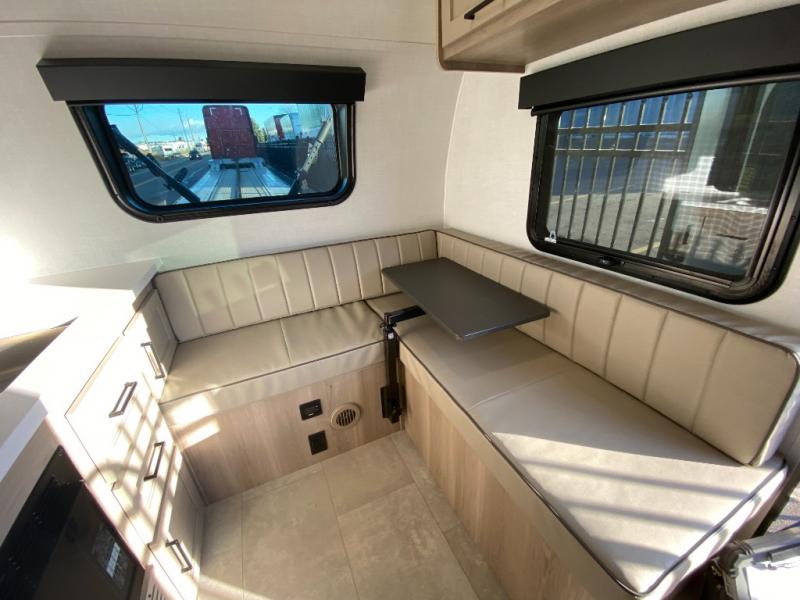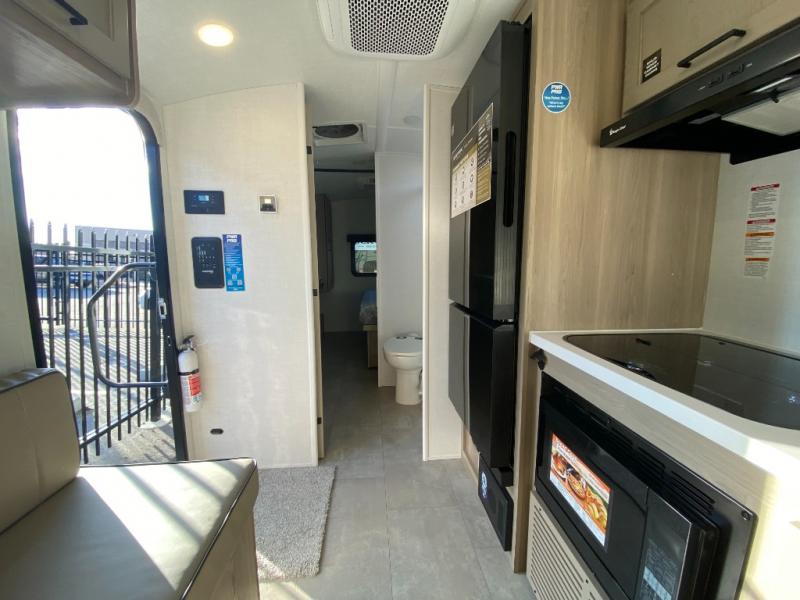 Starting at the rear, this trailer offers a spacious bedroom featuring a 60" x 74" queen bed housed in a slide-out, giving you both room to stretch out and added comfort. Across from the bed, a wardrobe provides ample storage for clothing, while a built-in desk with a TV makes it easy to catch up on work or unwind on the road. Moving toward the center, the full bathroom offers convenience with a proper shower and toilet on one side, paired with a sink and a large linen closet perfect for storing towels and toiletries. At the front, the compact but capable kitchen includes a refrigerator, sink, and microwave everything you need to prepare a satisfying meal. Rounding out the space, a cozy corner dinette gives you a comfortable place to enjoy meals or play board games after a long day of adventure.