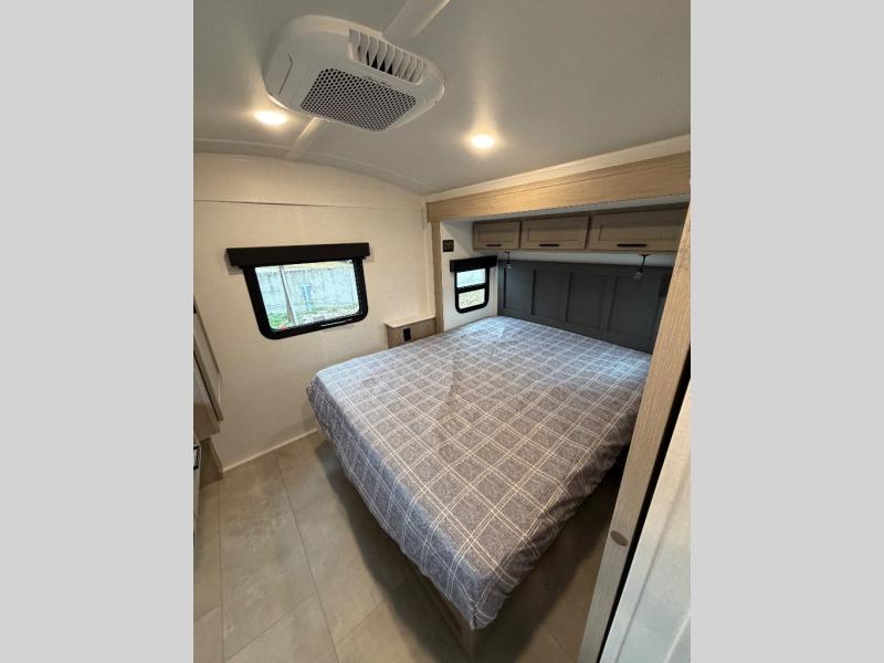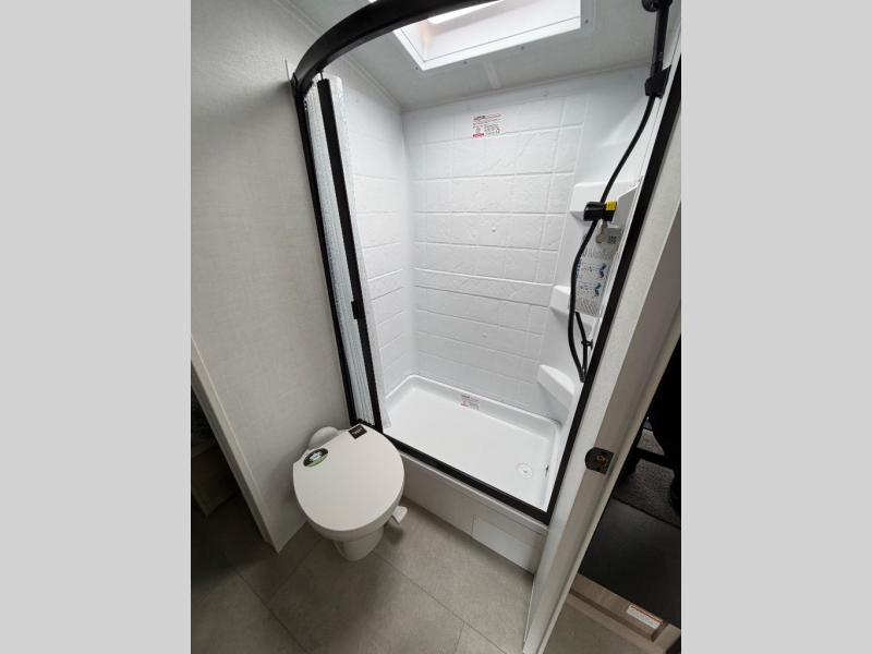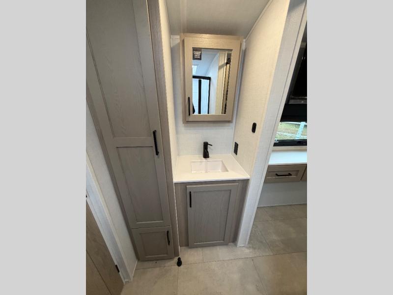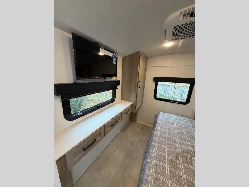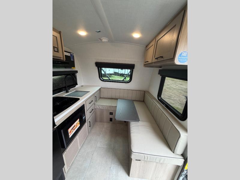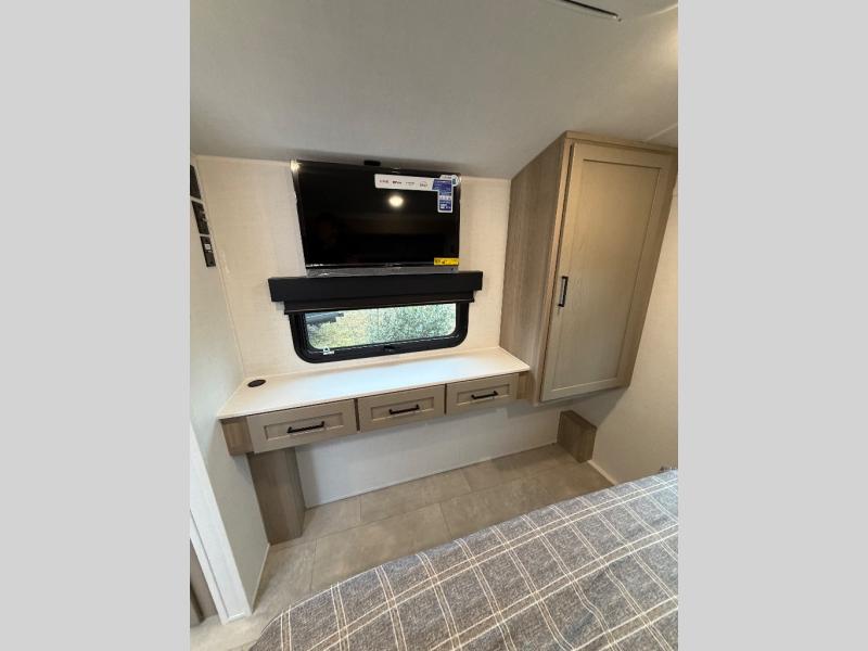 Starting at the rear, this trailer offers a spacious bedroom featuring a 60" x 74" queen bed housed in a slide-out, giving you both room to stretch out and added comfort. Across from the bed, a wardrobe provides ample storage for clothing, while a built-in desk with a TV makes it easy to catch up on work or unwind on the road. Moving toward the center, the full bathroom offers convenience with a proper shower and toilet on one side, paired with a sink and a large linen closet perfect for storing towels and toiletries. At the front, the compact but capable kitchen includes a refrigerator, sink, and microwave everything you need to prepare a satisfying meal. Rounding out the space, a cozy corner dinette gives you a comfortable place to enjoy meals or play board games after a long day of adventure.