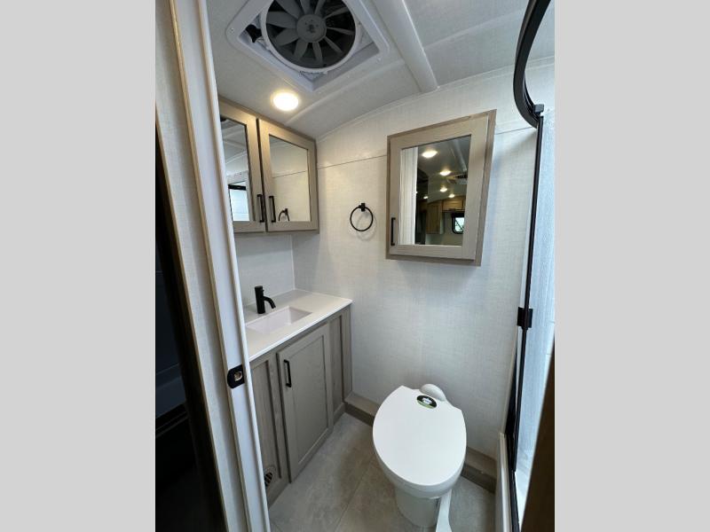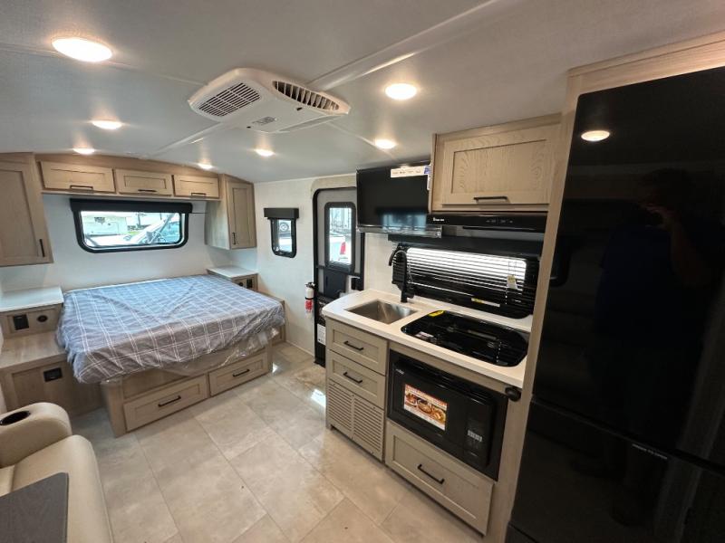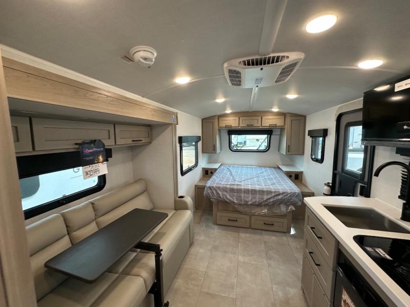 This travel trailer will feel more like home with its front bedroom and walk-around full-size bed. You'll enjoy the 32" 12V TV as you relax on the 72" sofa with a table and cupholders. The full rear bath includes a spacious shower to clean up in each day and there is a linen closet for clean towels. When you're ready to prepare dinner you'll have a three burner cooktop and microwave oven indoors, and a griddle outdoors! And don't forget the exterior storage allows you to bring along beach toys and tackle boxes. The optional Power Package available on this model includes three 200W solar panels, a side solar plug-in, a 3kW 160A inverter, and more off-grid features!