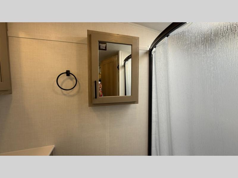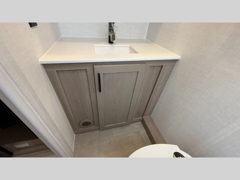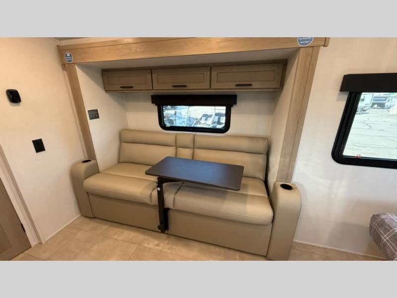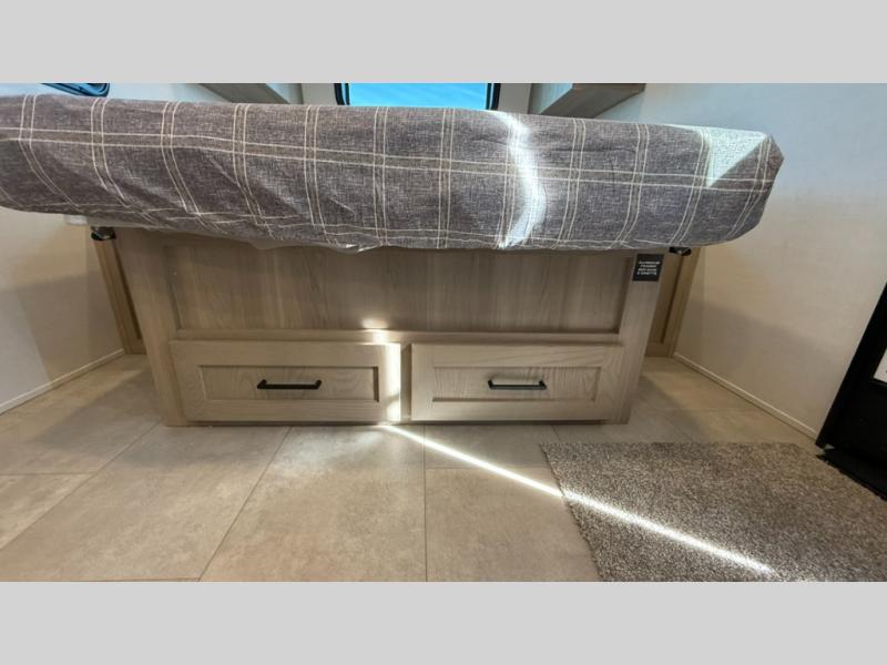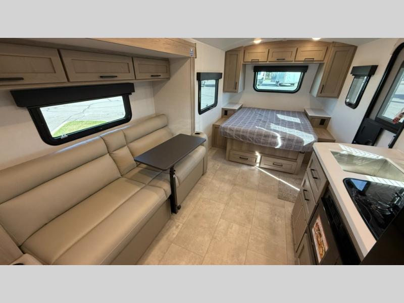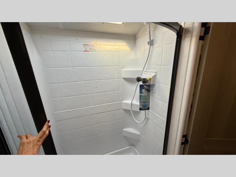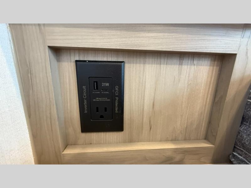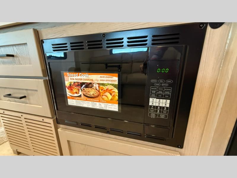 This travel trailer will feel more like home with its front bedroom and walk-around full-size bed. You'll enjoy the 32" 12V TV as you relax on the 72" sofa with a table and cupholders. The full rear bath includes a spacious shower to clean up in each day and there is a linen closet for clean towels. When you're ready to prepare dinner you'll have a three burner cooktop and microwave oven indoors, and a griddle outdoors! And don't forget the exterior storage allows you to bring along beach toys and tackle boxes. The optional Power Package available on this model includes three 200W solar panels, a side solar plug-in, a 3kW 160A inverter, and more off-grid features!