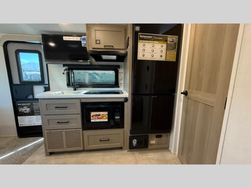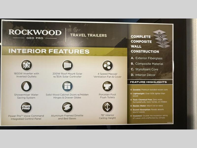 With any Rockwood GEO Pro travel trailer by Forest River you will enjoy easy towing, durable construction, and off-road capabilities with larger 15" tires and a lift kit! Each model is constructed with complete composite wall construction for added strength and durability, and the torsion axle, Rubber-Ryde suspension will make towing easier than ever. Inside, you'll find sleek roller shades for added privacy, a 12V refrigerator and a microwave, plus a 20,000 BTU furnace to keep you warm during the colder camping months.