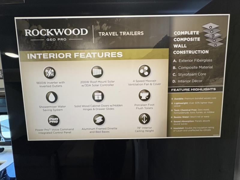 With any Rockwood GEO Pro travel trailer by Forest River you will enjoy easy towing, durable construction, and off-road capabilities with larger 15" tires and a lift kit! Each model is constructed with complete composite wall construction for added strength and durability, and the torsion axle, Rubber-Ryde suspension will make towing easier than ever. Inside, you'll find sleek roller shades for added privacy, a 12V refrigerator and a microwave, plus a 20,000 BTU furnace to keep you warm during the colder camping months.