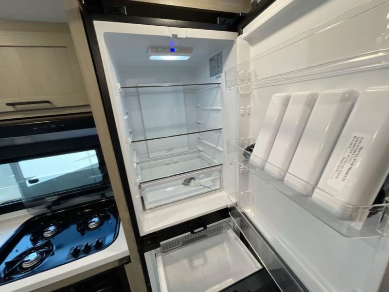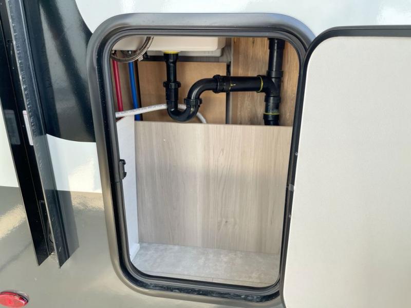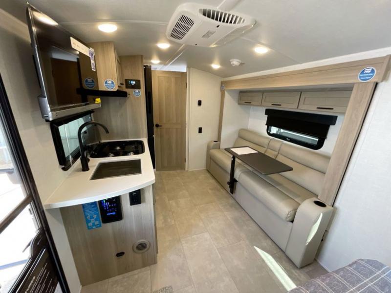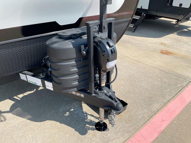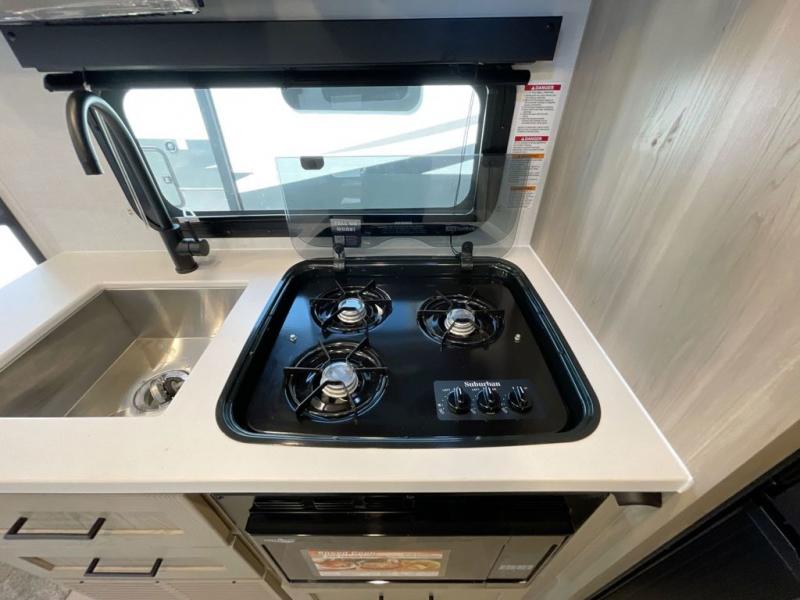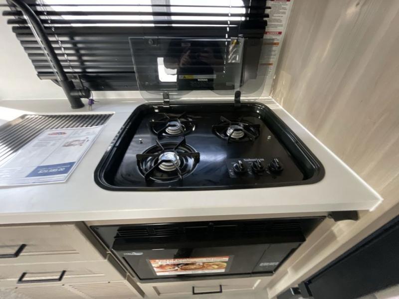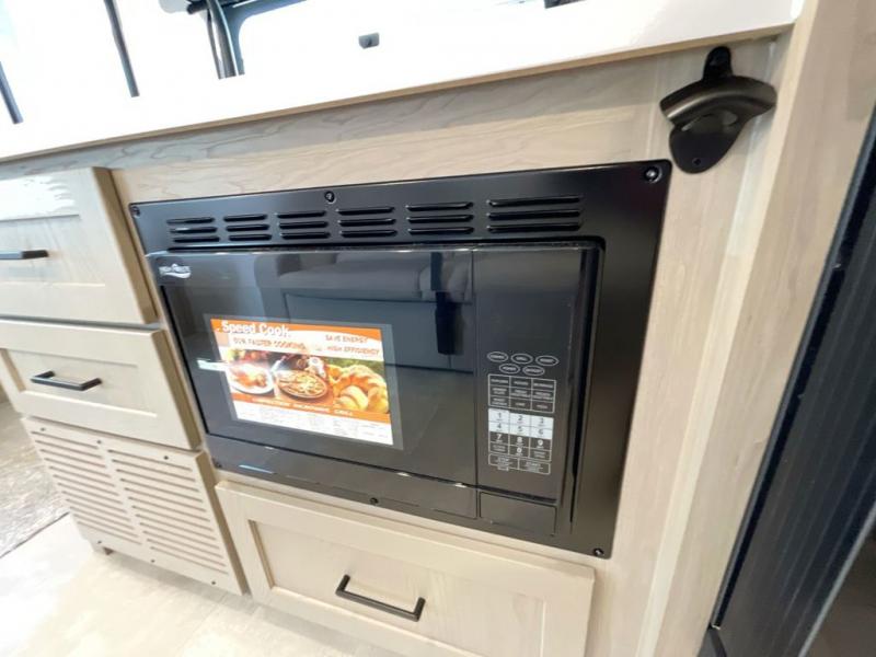 This travel trailer will feel more like home with its front bedroom and walk-around full-size bed. You'll enjoy the 32" 12V TV as you relax on the 72" sofa with a table and cupholders. The full rear bath includes a spacious shower to clean up in each day and there is a linen closet for clean towels. When you're ready to prepare dinner you'll have a three burner cooktop and microwave oven indoors, and a griddle outdoors! And don't forget the exterior storage allows you to bring along beach toys and tackle boxes. The optional Power Package available on this model includes three 200W solar panels, a side solar plug-in, a 3kW 160A inverter, and more off-grid features!