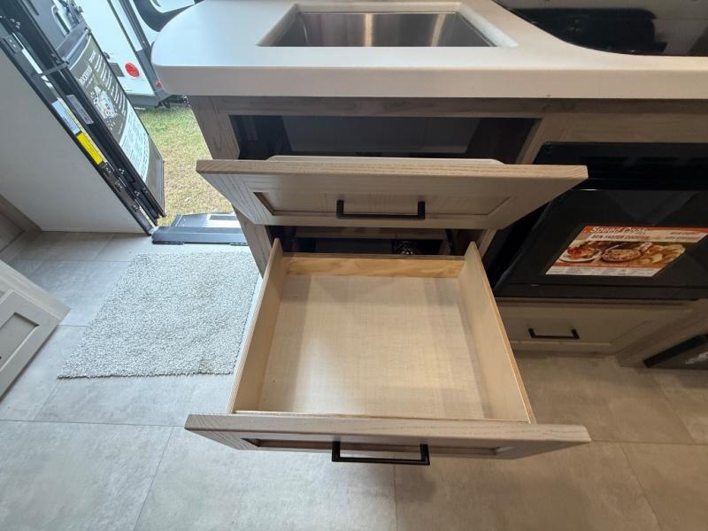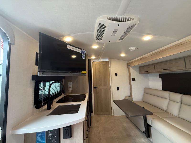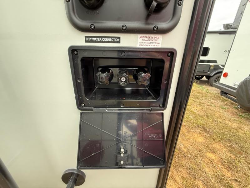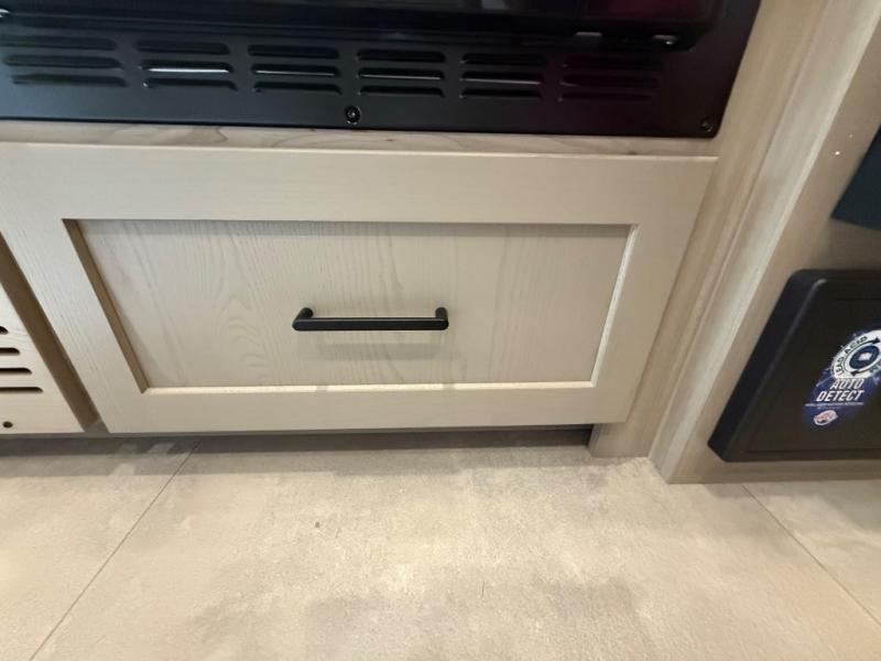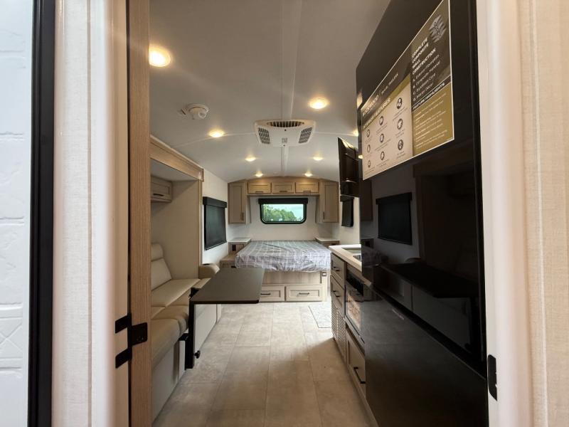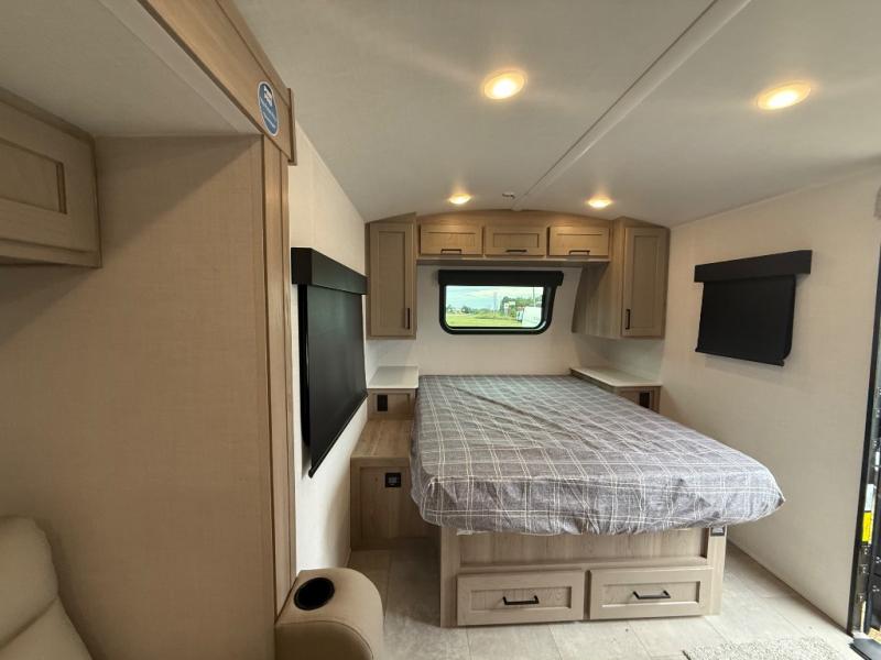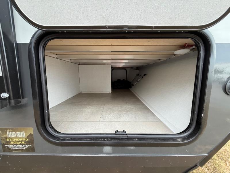 This travel trailer will feel more like home with its front bedroom and walk-around full-size bed. You'll enjoy the 12V TV as you relax on the 72" sofa with a table and cupholders. The full rear bath includes a spacious shower to clean up in each day and there is a linen closet for clean towels. When you're ready to prepare dinner you'll have a three burner cooktop and microwave oven indoors! And don't forget the exterior storage allows you to bring along beach toys and tackle boxes. The optional Power Package available on this model includes three 200W solar panels, a side solar plug-in, a 3kW 160A inverter, and more off-grid features!
