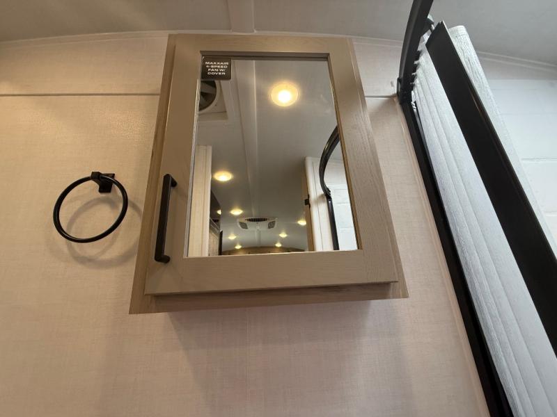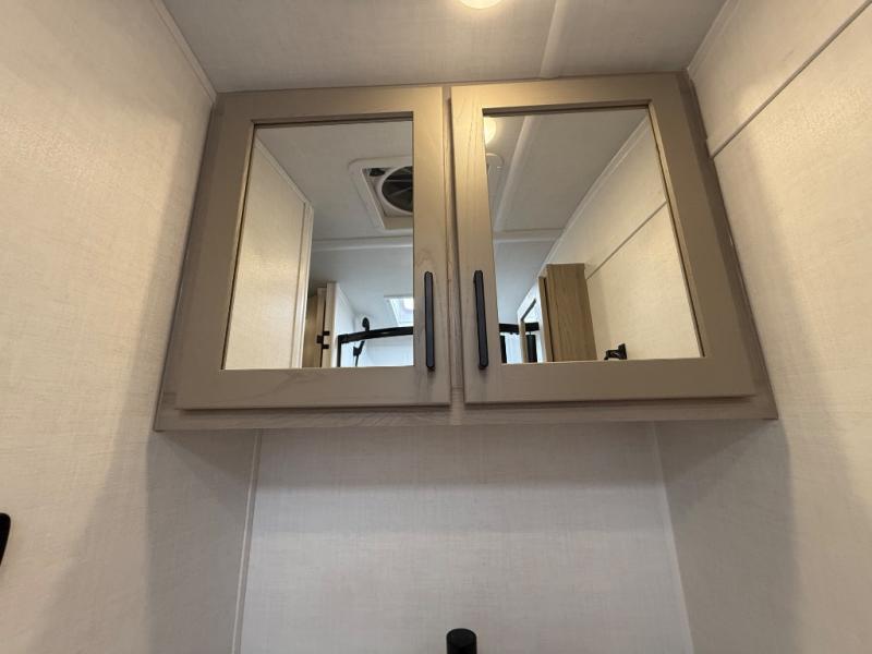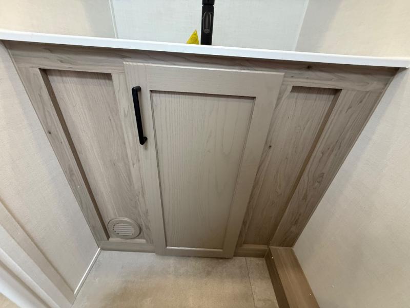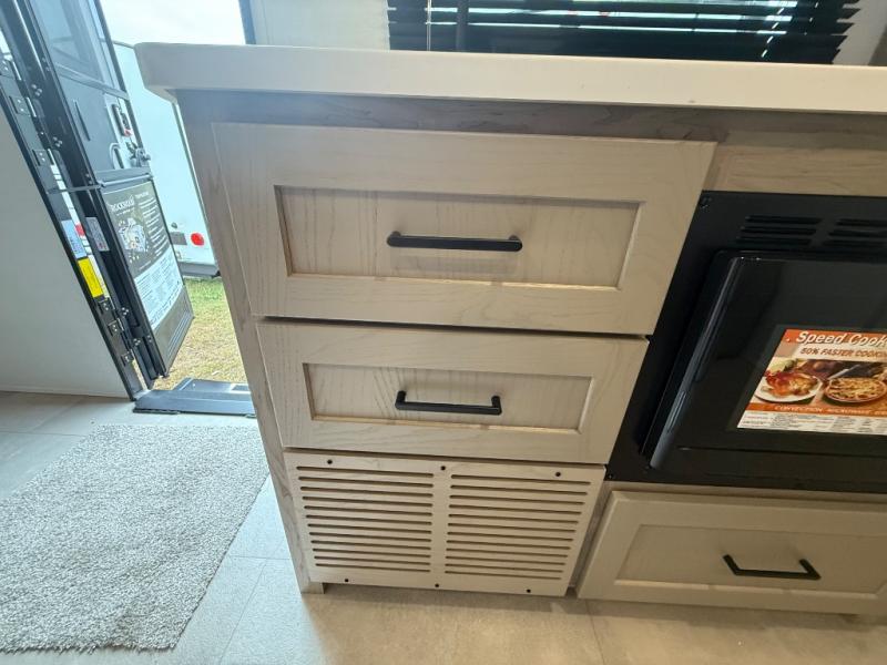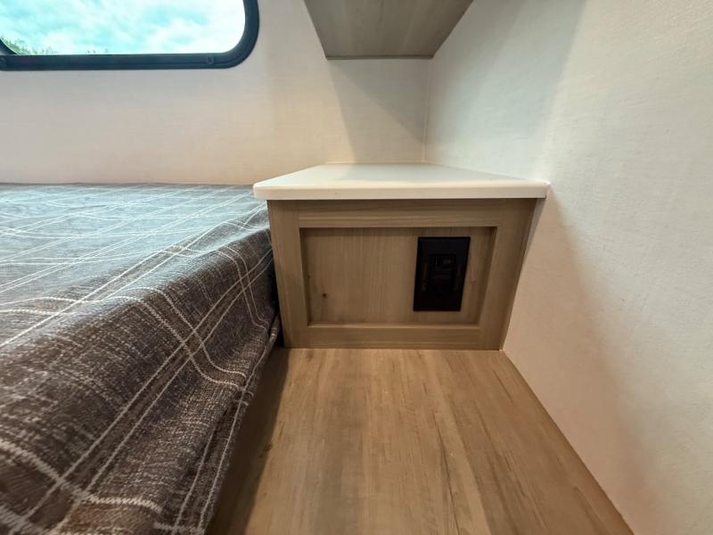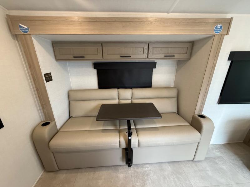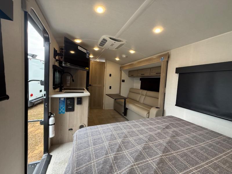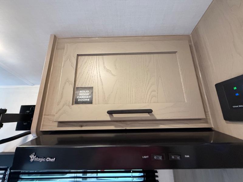 This travel trailer will feel more like home with its front bedroom and walk-around full-size bed. You'll enjoy the 12V TV as you relax on the 72" sofa with a table and cupholders. The full rear bath includes a spacious shower to clean up in each day and there is a linen closet for clean towels. When you're ready to prepare dinner you'll have a three burner cooktop and microwave oven indoors! And don't forget the exterior storage allows you to bring along beach toys and tackle boxes. The optional Power Package available on this model includes three 200W solar panels, a side solar plug-in, a 3kW 160A inverter, and more off-grid features!