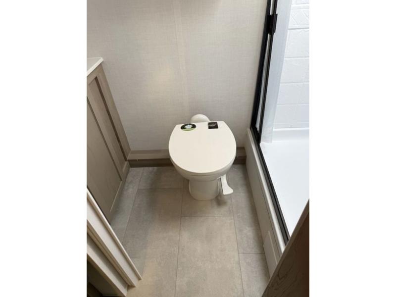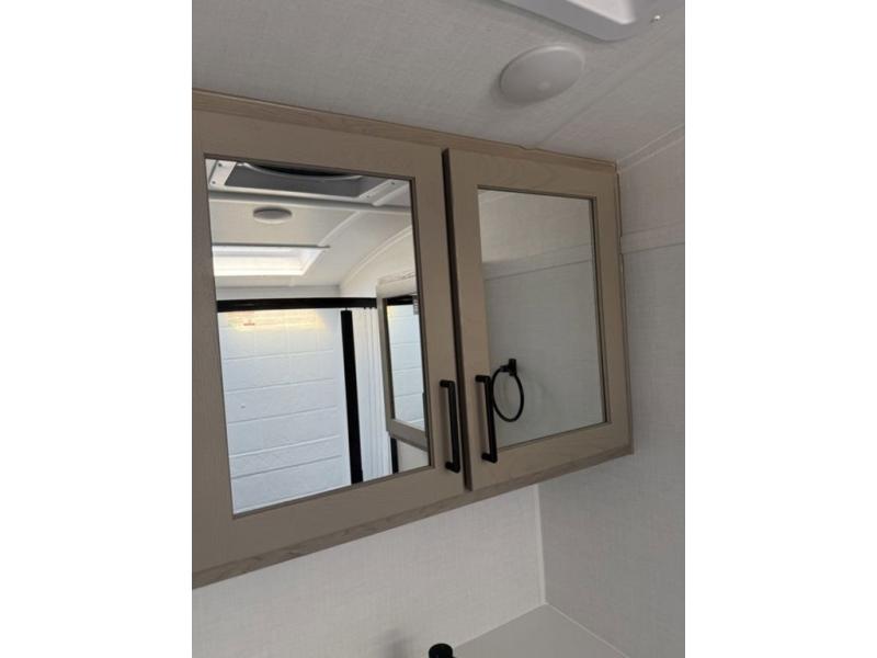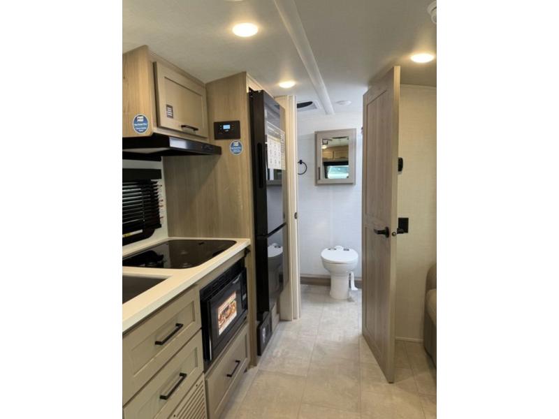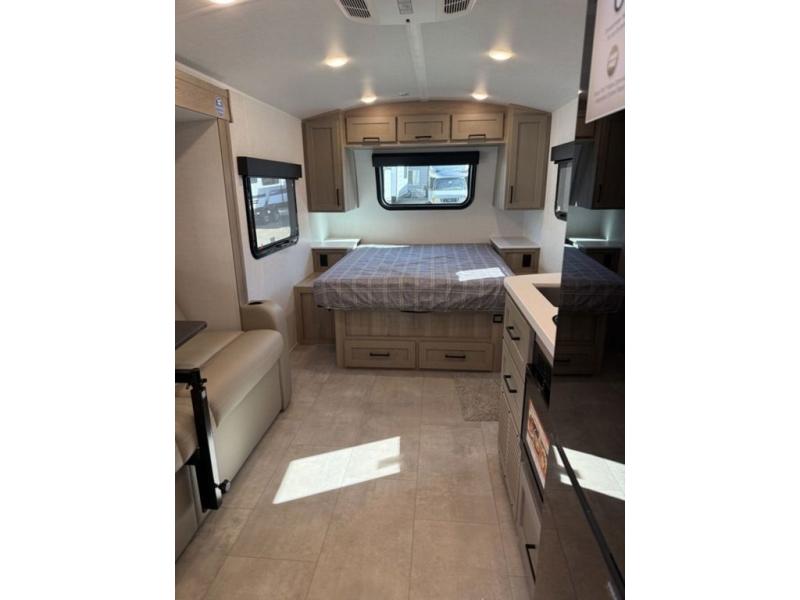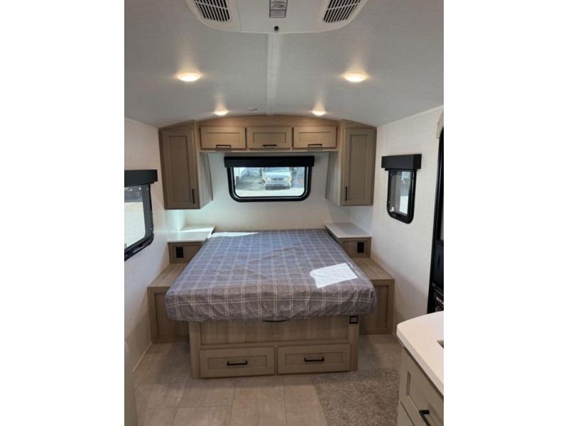 This travel trailer will feel more like home with its front bedroom and walk-around full-size bed. You'll enjoy the 12V TV as you relax on the 72" sofa with a table and cupholders. The full rear bath includes a spacious shower to clean up in each day and there is a linen closet for clean towels. When you're ready to prepare dinner you'll have a three burner cooktop and microwave oven indoors! And don't forget the exterior storage allows you to bring along beach toys and tackle boxes. The optional Power Package available on this model includes three 200W solar panels, a side solar plug-in, a 3kW 160A inverter, and more off-grid features!