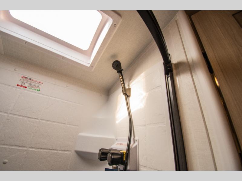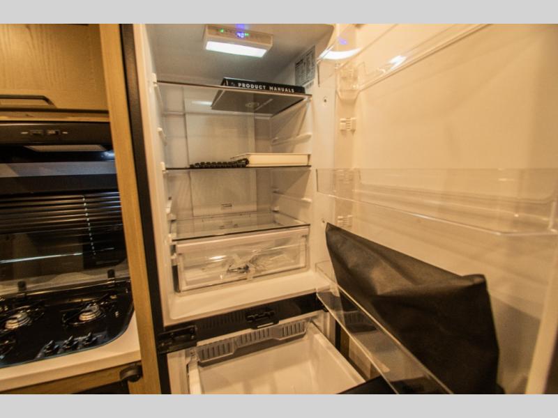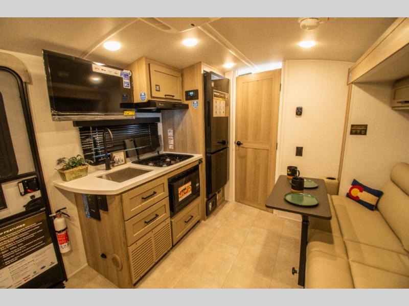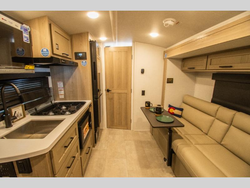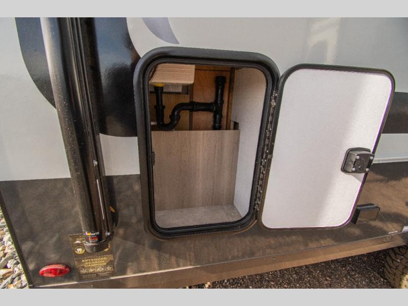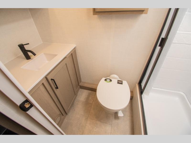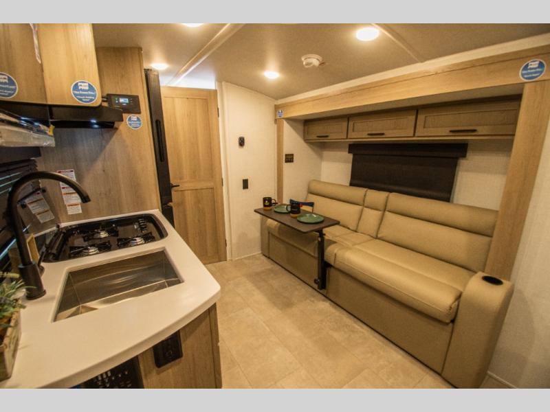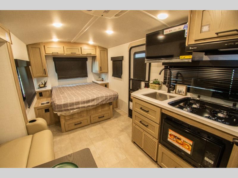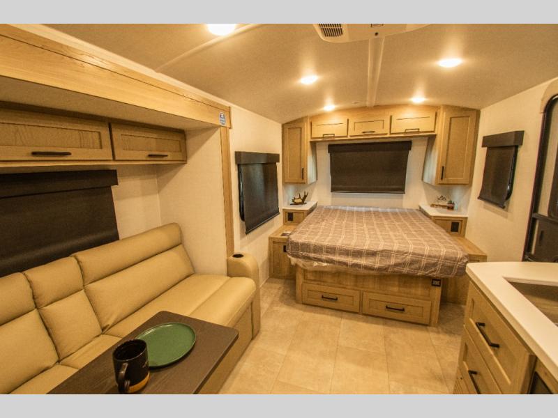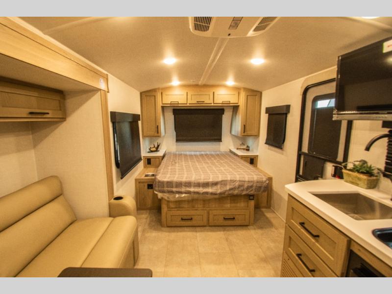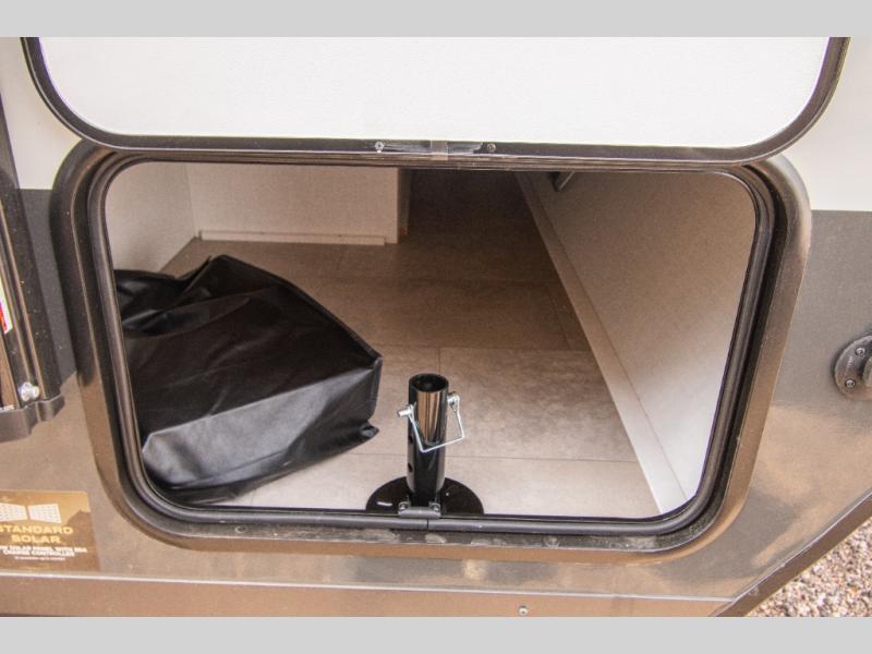 This travel trailer will feel more like home with its front bedroom and walk-around full-size bed. You'll enjoy the 12V TV as you relax on the 72" sofa with a table and cupholders. The full rear bath includes a spacious shower to clean up in each day and there is a linen closet for clean towels. When you're ready to prepare dinner you'll have a three burner cooktop and microwave oven indoors! And don't forget the exterior storage allows you to bring along beach toys and tackle boxes. The optional Power Package available on this model includes three 200W solar panels, a side solar plug-in, a 3kW 160A inverter, and more off-grid features!