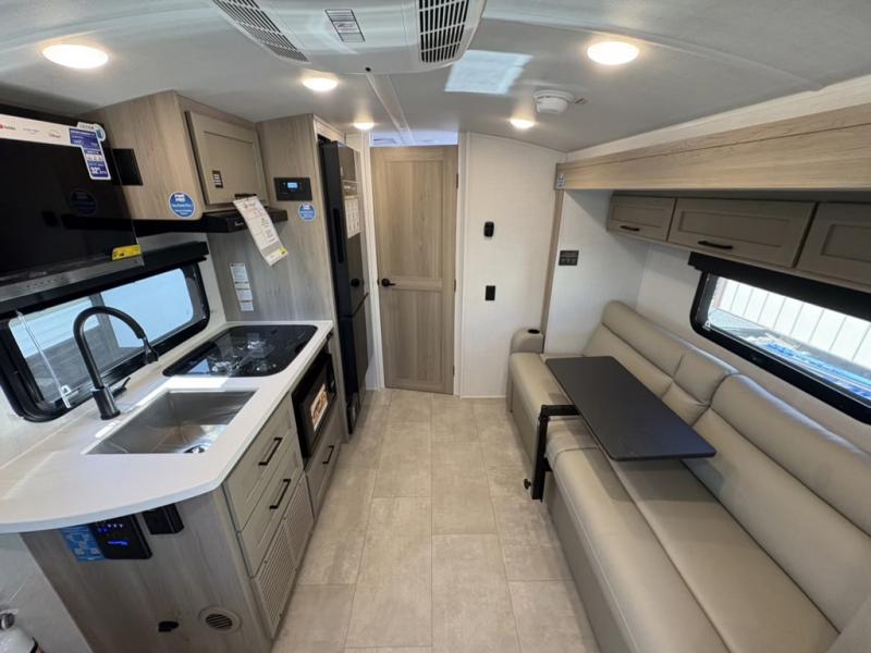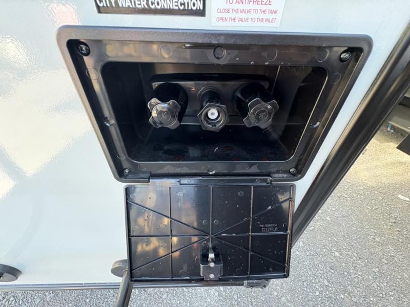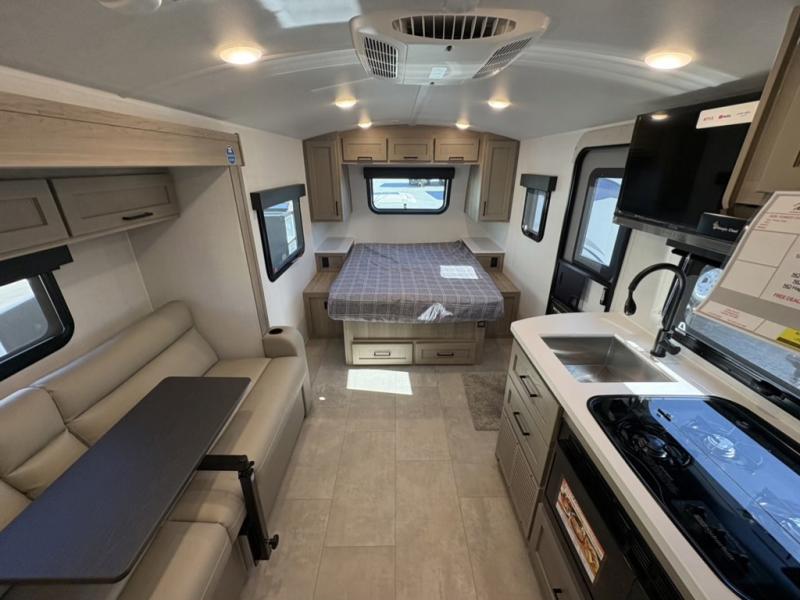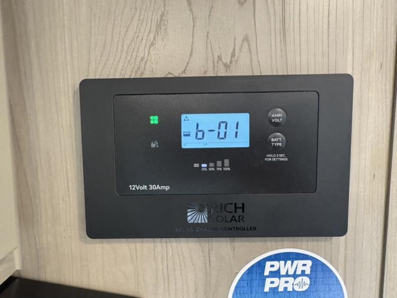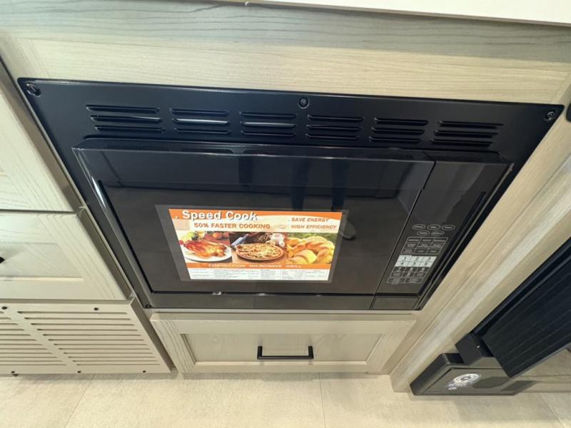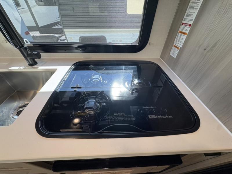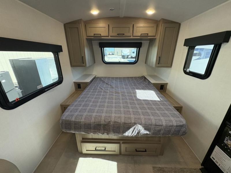 This travel trailer will feel more like home with its front bedroom and walk-around full-size bed. You'll enjoy the 12V TV as you relax on the 72" sofa with a table and cupholders. The full rear bath includes a spacious shower to clean up in each day and there is a linen closet for clean towels. When you're ready to prepare dinner you'll have a three burner cooktop and microwave oven indoors! And don't forget the exterior storage allows you to bring along beach toys and tackle boxes. The optional Power Package available on this model includes three 200W solar panels, a side solar plug-in, a 3kW 160A inverter, and more off-grid features!
