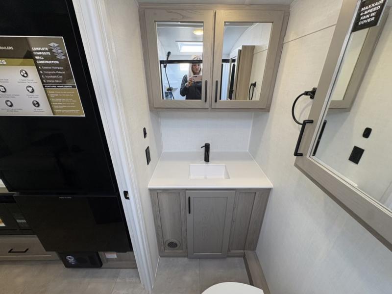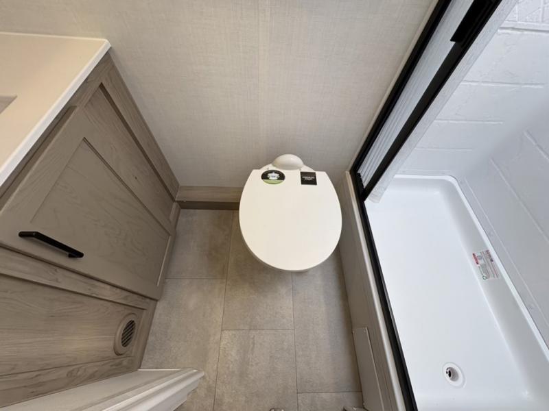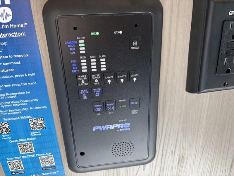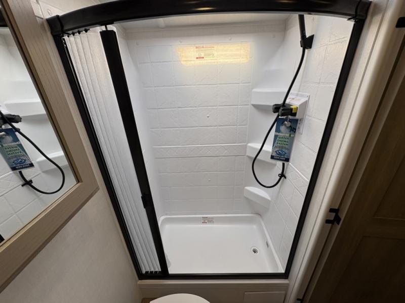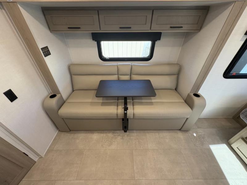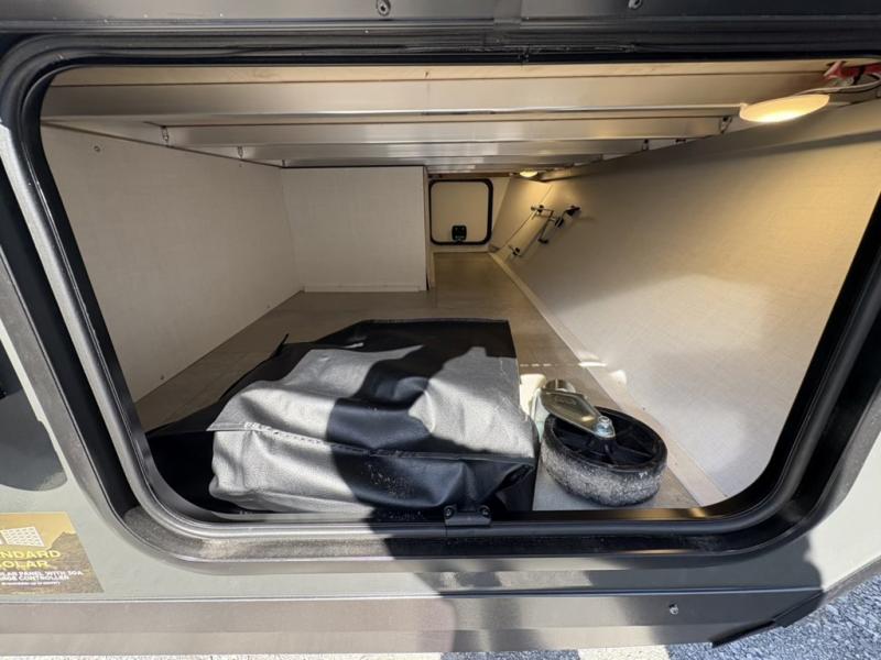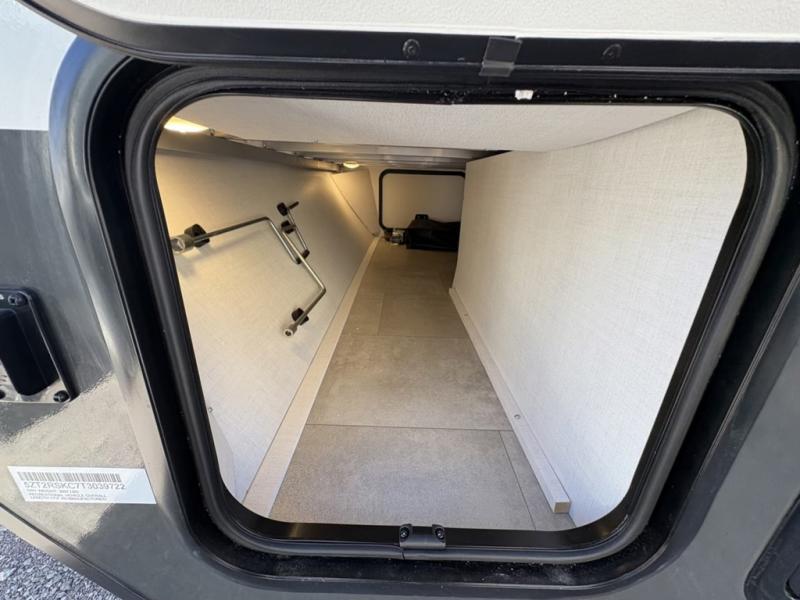 This travel trailer will feel more like home with its front bedroom and walk-around full-size bed. You'll enjoy the 12V TV as you relax on the 72" sofa with a table and cupholders. The full rear bath includes a spacious shower to clean up in each day and there is a linen closet for clean towels. When you're ready to prepare dinner you'll have a three burner cooktop and microwave oven indoors! And don't forget the exterior storage allows you to bring along beach toys and tackle boxes. The optional Power Package available on this model includes three 200W solar panels, a side solar plug-in, a 3kW 160A inverter, and more off-grid features!