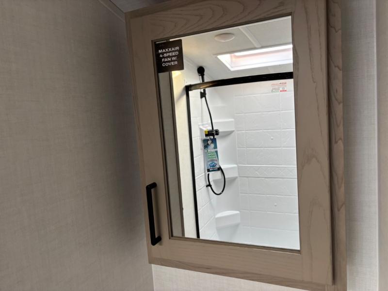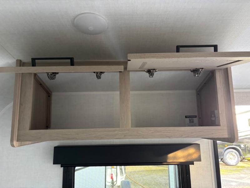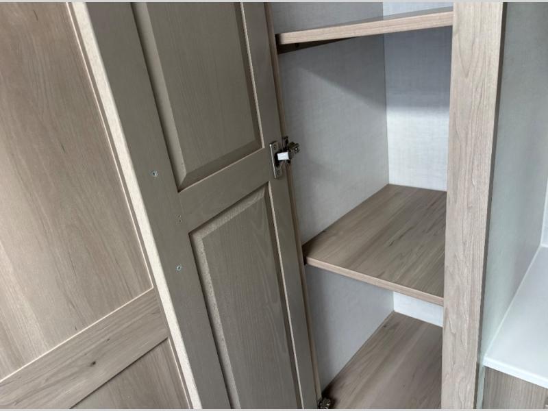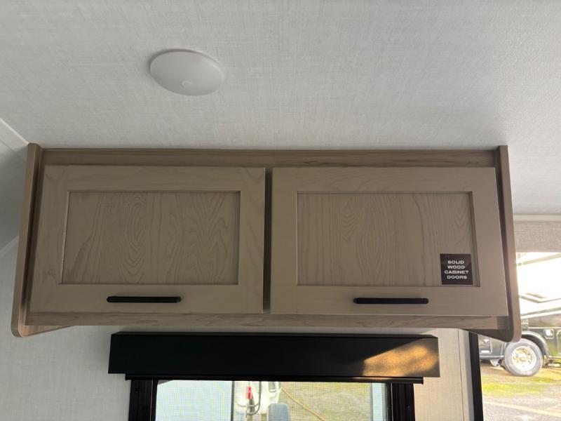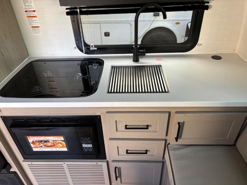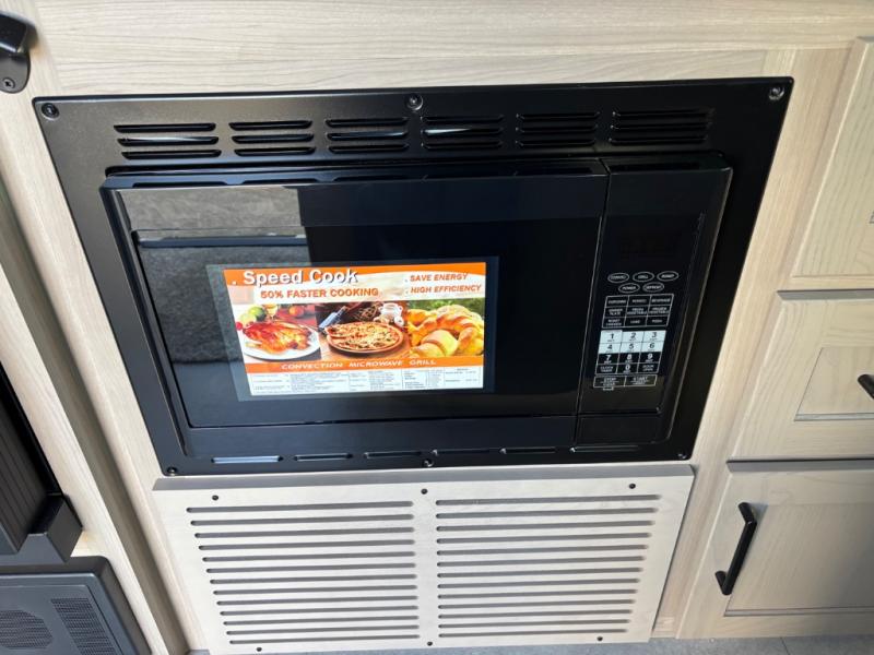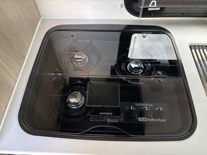 This travel trailer will feel more like home with its front bedroom and walk-around full-size bed. You'll enjoy the 12V TV as you relax on the 72" sofa with a table and cupholders. The full rear bath includes a spacious shower to clean up in each day and there is a linen closet for clean towels. When you're ready to prepare dinner you'll have a three burner cooktop and microwave oven indoors! And don't forget the exterior storage allows you to bring along beach toys and tackle boxes. The optional Power Package available on this model includes three 200W solar panels, a side solar plug-in, a 3kW 160A inverter, and more off-grid features!