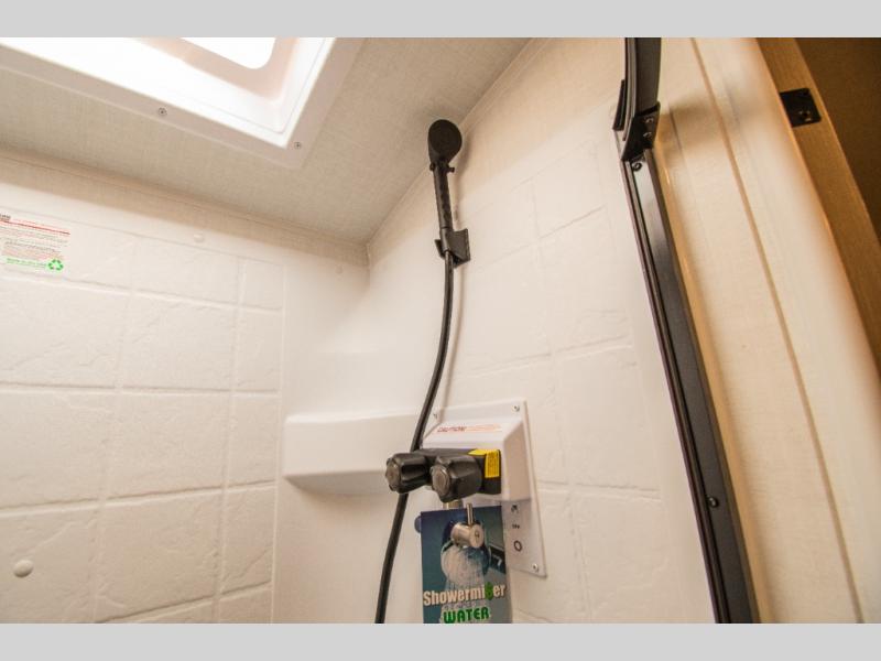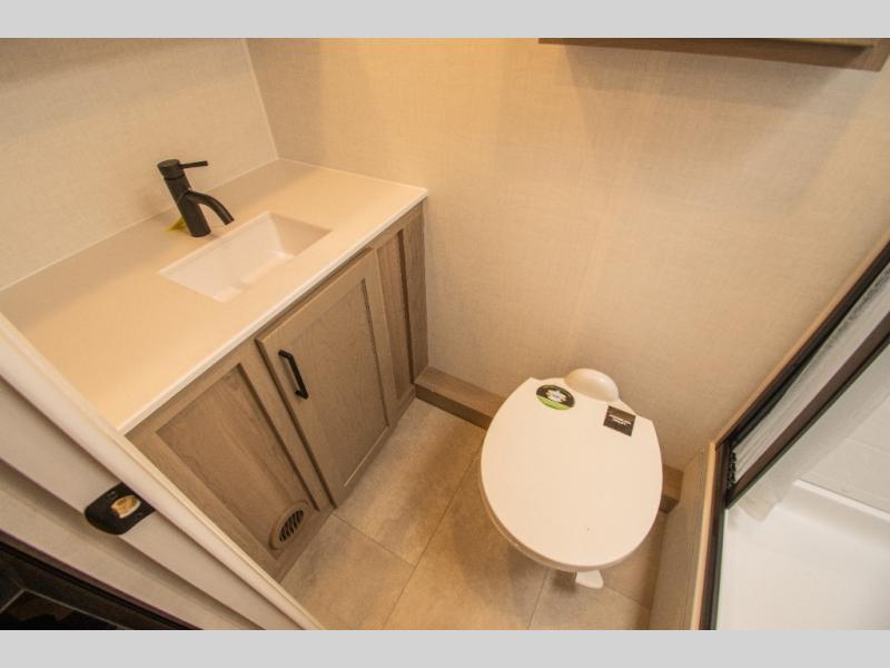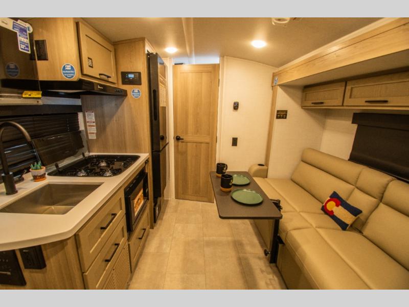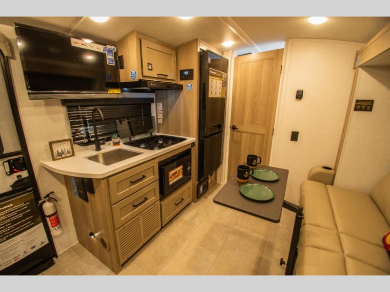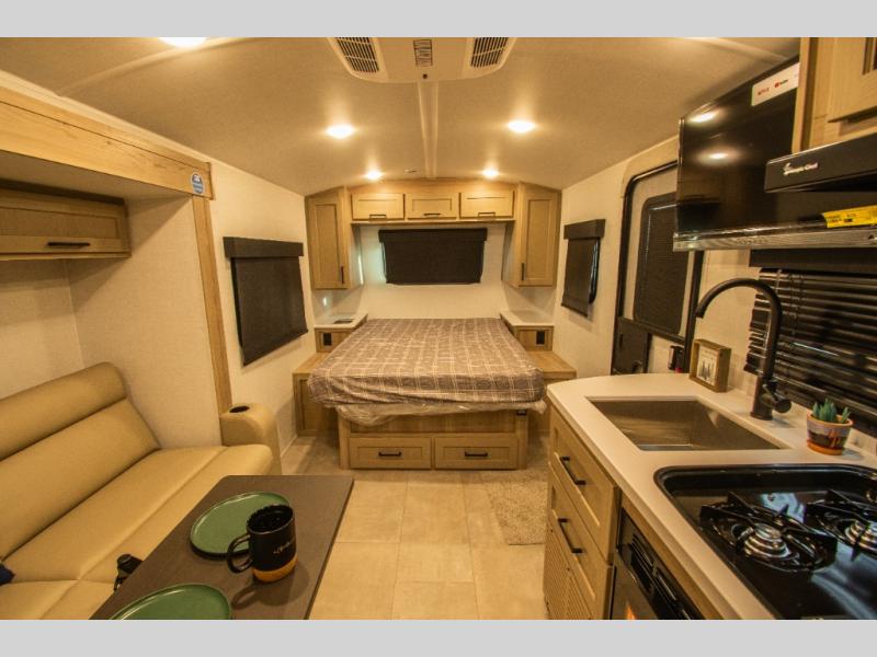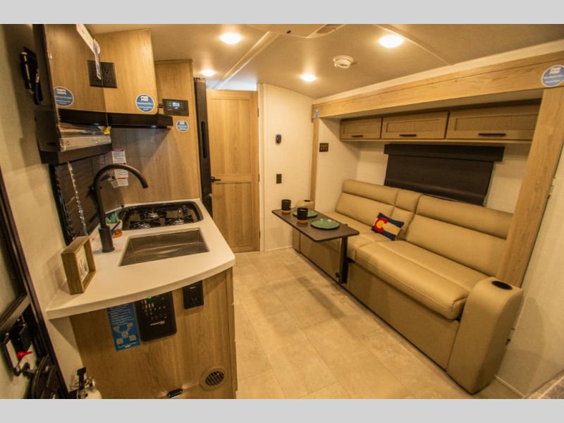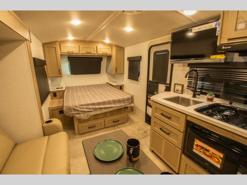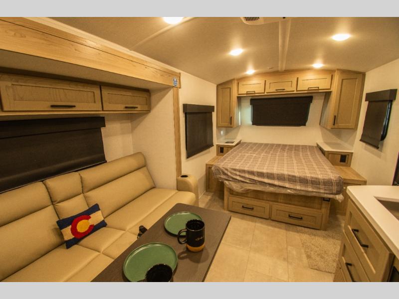 This travel trailer will feel more like home with its front bedroom and walk-around full-size bed. You'll enjoy the 12V TV as you relax on the 72" sofa with a table and cupholders. The full rear bath includes a spacious shower to clean up in each day and there is a linen closet for clean towels. When you're ready to prepare dinner you'll have a three burner cooktop and microwave oven indoors! And don't forget the exterior storage allows you to bring along beach toys and tackle boxes. The optional Power Package available on this model includes three 200W solar panels, a side solar plug-in, a 3kW 160A inverter, and more off-grid features!