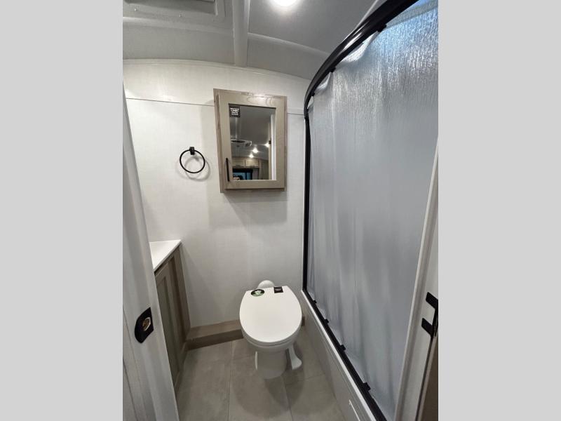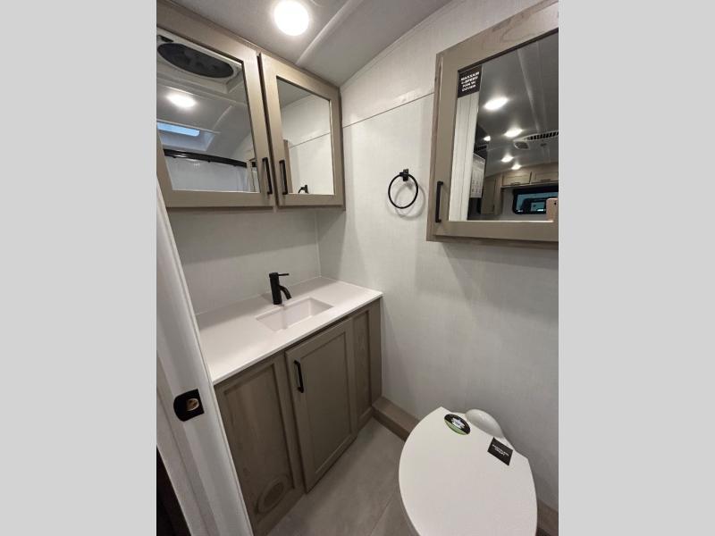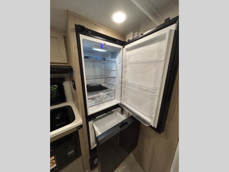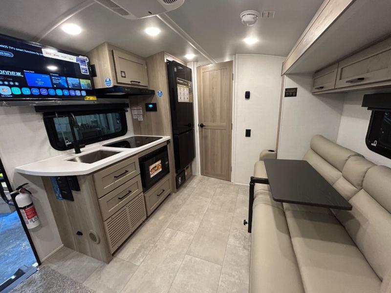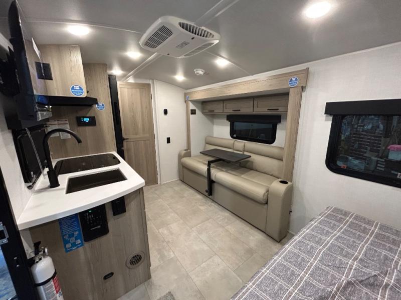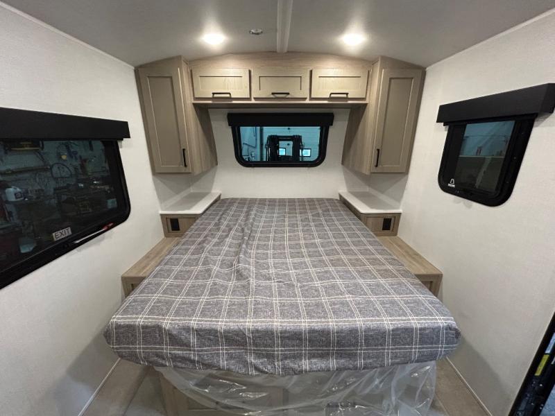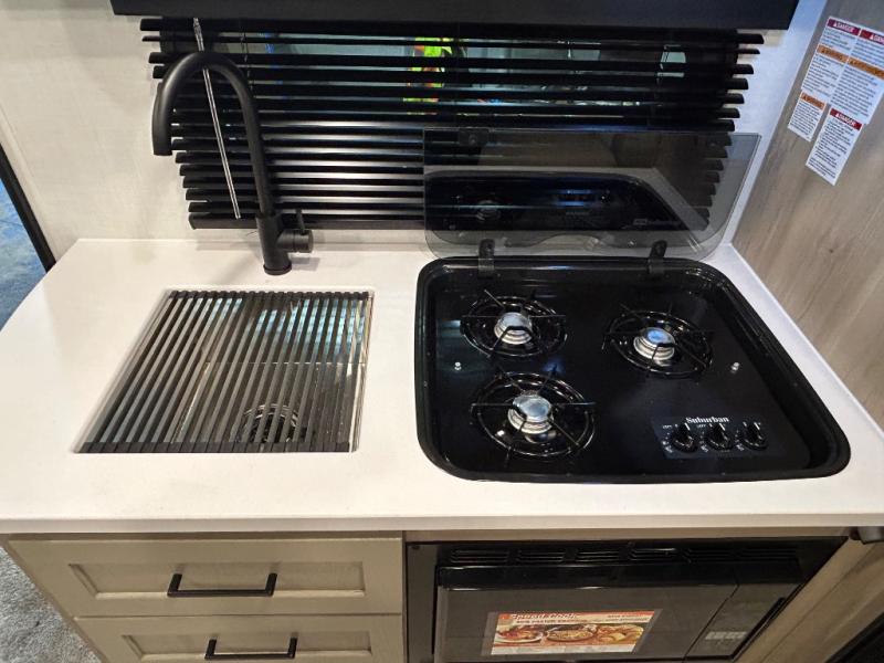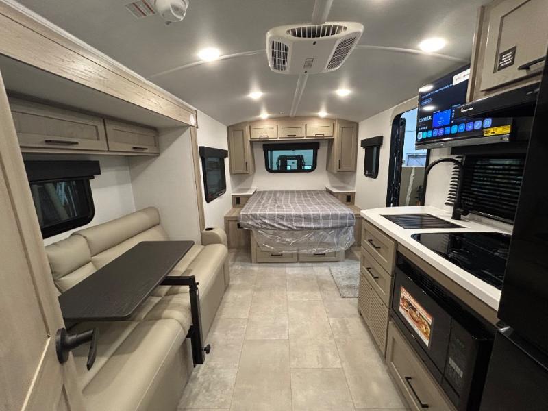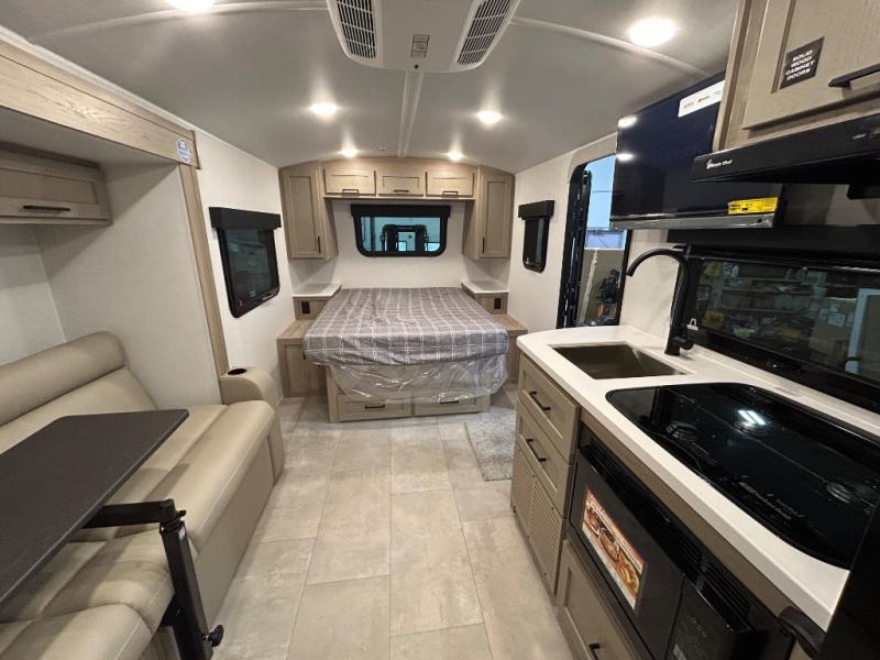 This travel trailer will feel more like home with its front bedroom and walk-around full-size bed. You'll enjoy the 12V TV as you relax on the 72" sofa with a table and cupholders. The full rear bath includes a spacious shower to clean up in each day and there is a linen closet for clean towels. When you're ready to prepare dinner you'll have a three burner cooktop and microwave oven indoors! And don't forget the exterior storage allows you to bring along beach toys and tackle boxes. The optional Power Package available on this model includes three 200W solar panels, a side solar plug-in, a 3kW 160A inverter, and more off-grid features!