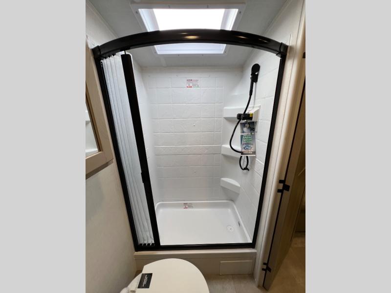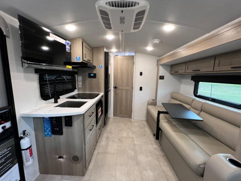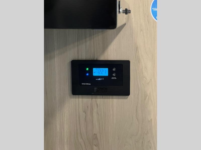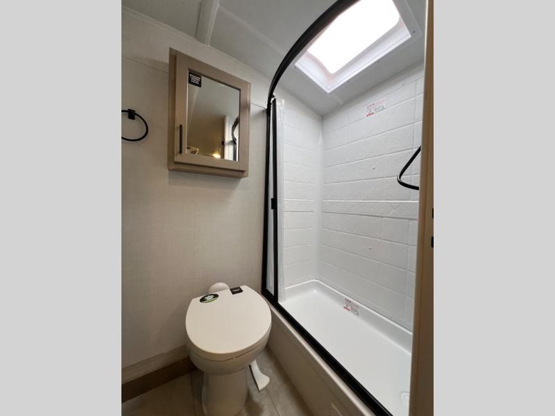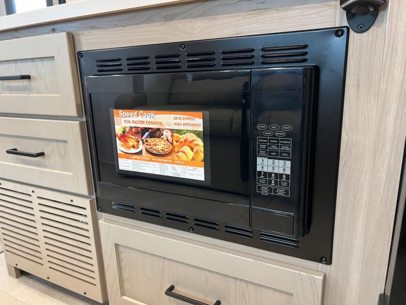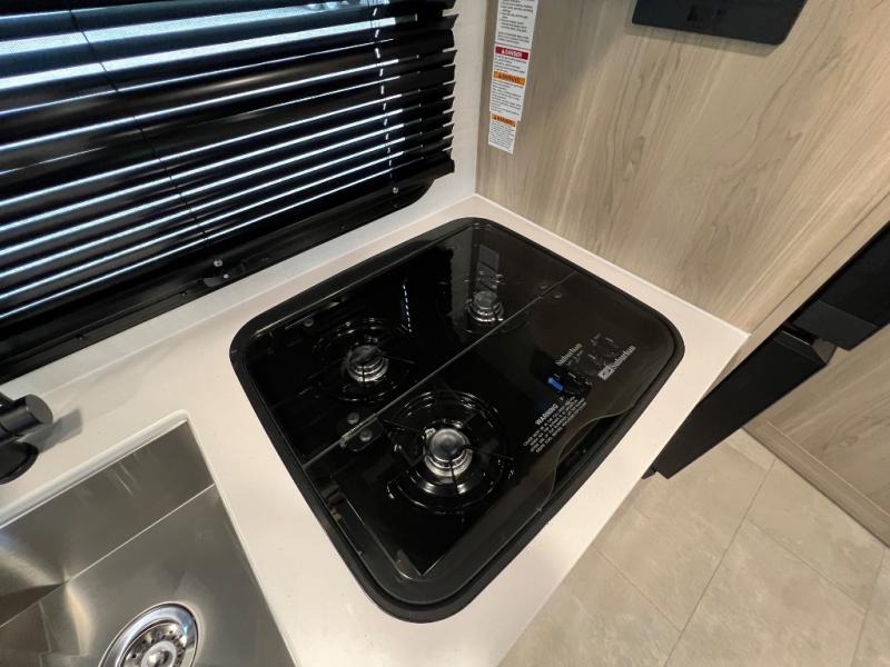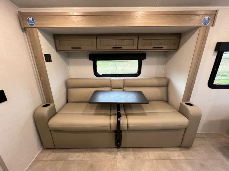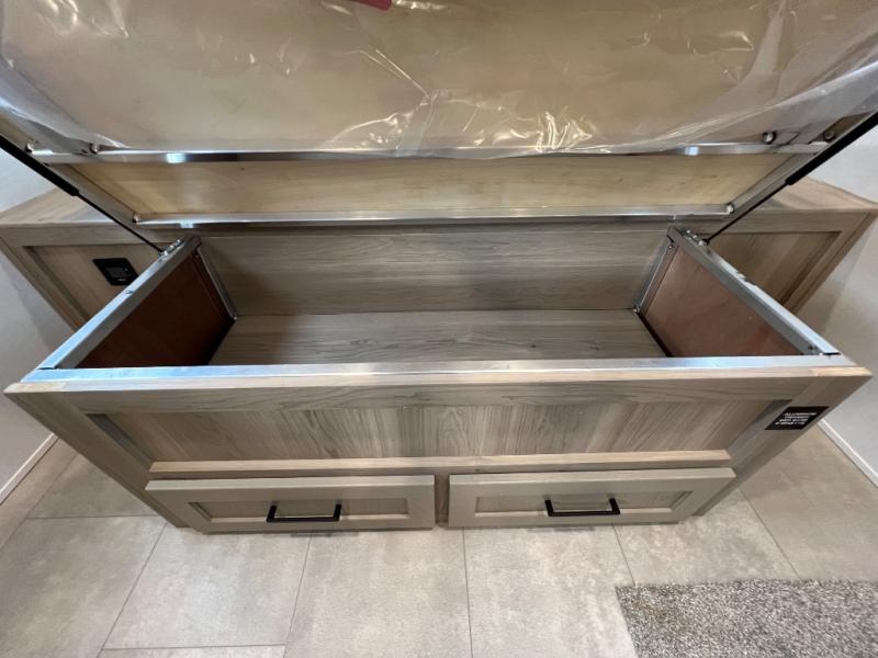 This travel trailer will feel more like home with its front bedroom and walk-around full-size bed. You'll enjoy the 12V TV as you relax on the 72" sofa with a table and cupholders. The full rear bath includes a spacious shower to clean up in each day and there is a linen closet for clean towels. When you're ready to prepare dinner you'll have a three burner cooktop and microwave oven indoors! And don't forget the exterior storage allows you to bring along beach toys and tackle boxes. The optional Power Package available on this model includes three 200W solar panels, a side solar plug-in, a 3kW 160A inverter, and more off-grid features!