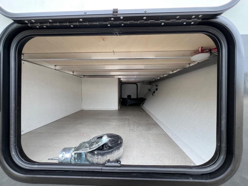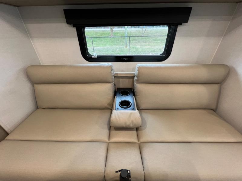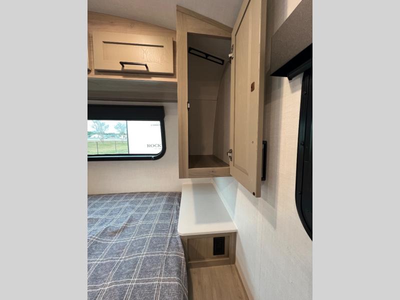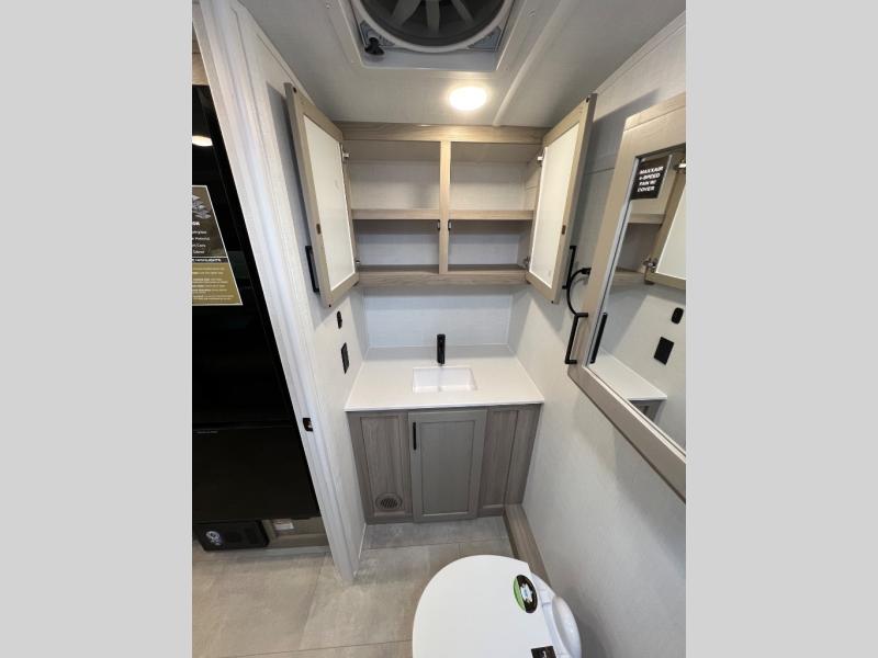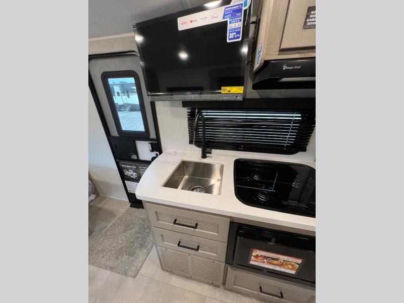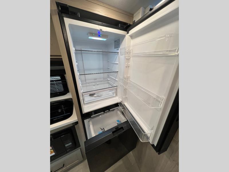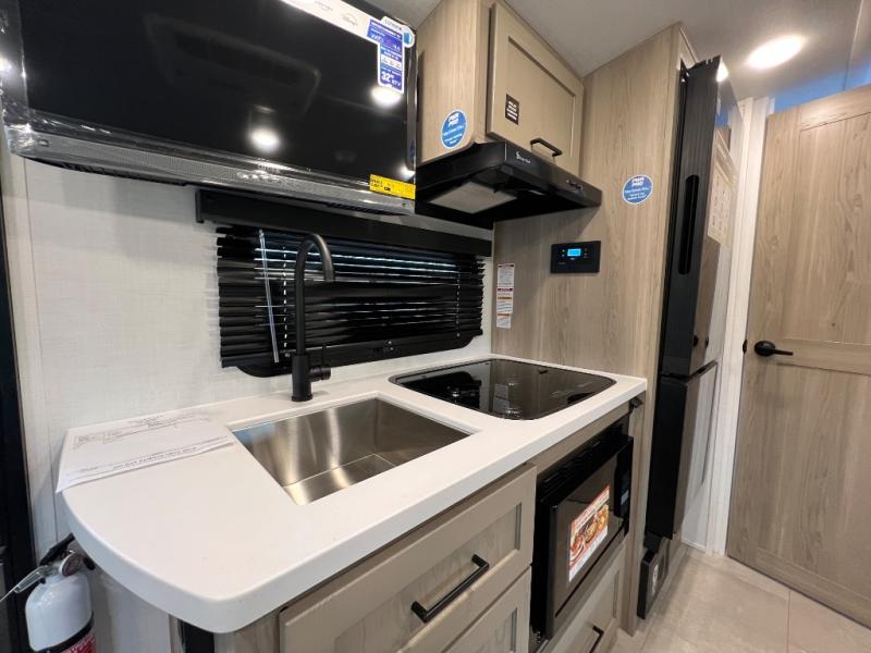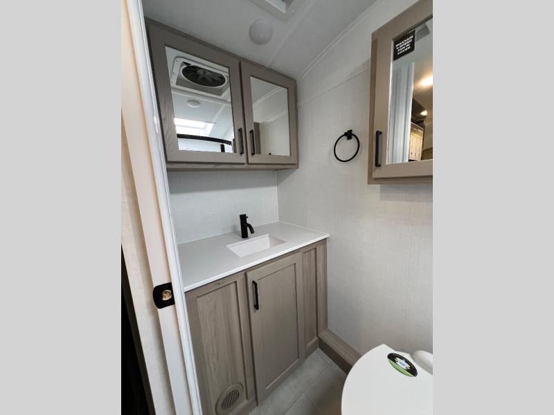 This travel trailer will feel more like home with its front bedroom and walk-around full-size bed. You'll enjoy the 12V TV as you relax on the 72" sofa with a table and cupholders. The full rear bath includes a spacious shower to clean up in each day and there is a linen closet for clean towels. When you're ready to prepare dinner you'll have a three burner cooktop and microwave oven indoors! And don't forget the exterior storage allows you to bring along beach toys and tackle boxes. The optional Power Package available on this model includes three 200W solar panels, a side solar plug-in, a 3kW 160A inverter, and more off-grid features!