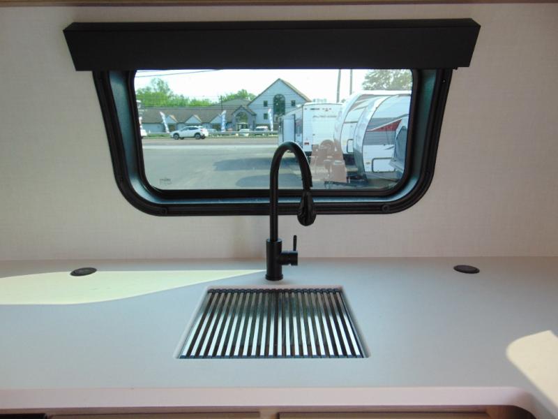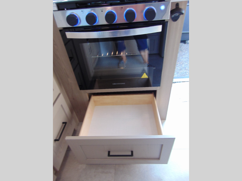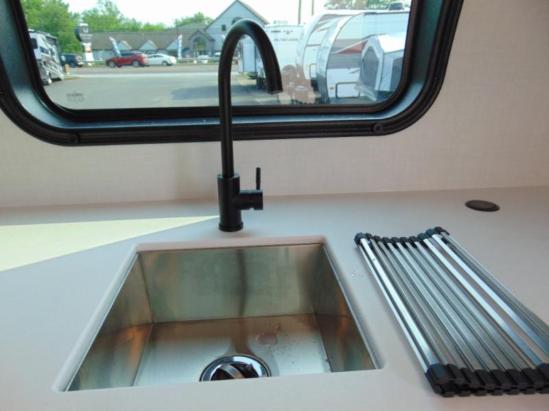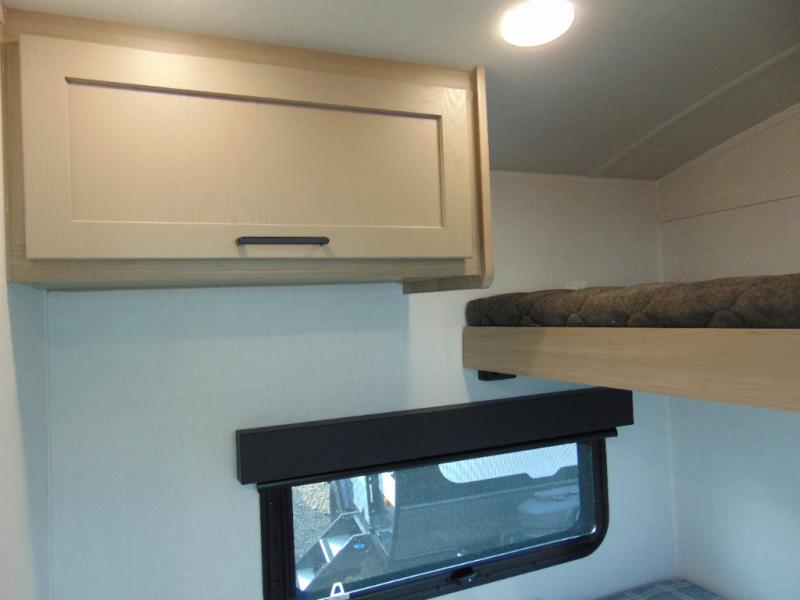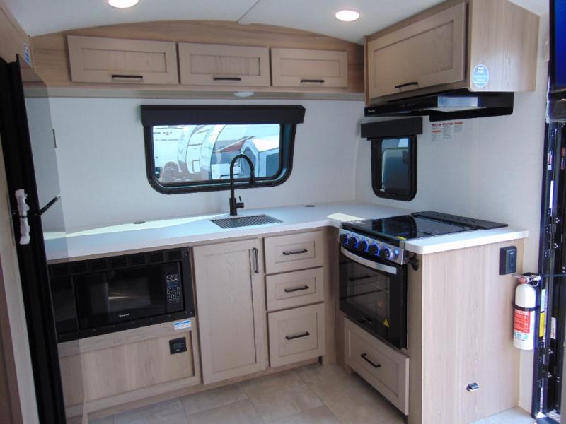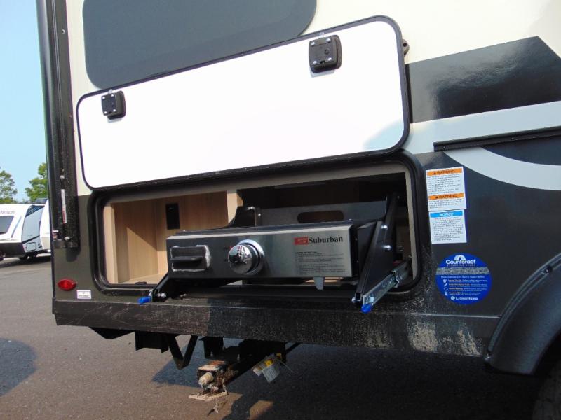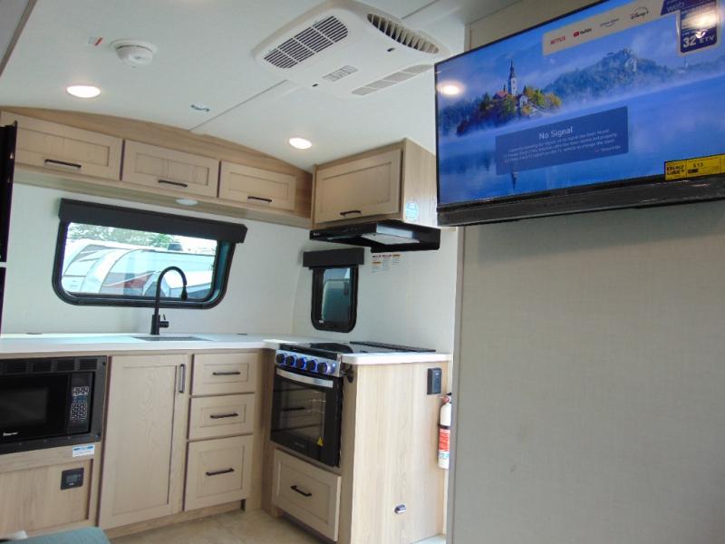Are you looking for a lightweight trailer with at-home comforts? Take a look at this single slide out unit that can sleep three to four each night. There is a queen-size bed in the back with a 26" x 80" flip-up bunk for cozy sleeping space, a 72" sofa with cupholders to relax on, plus a 32" 12V TV for movie nights! The front kitchen includes a 12V refrigerator to store food, plus a microwave oven and a gas oven to cook meals each day.