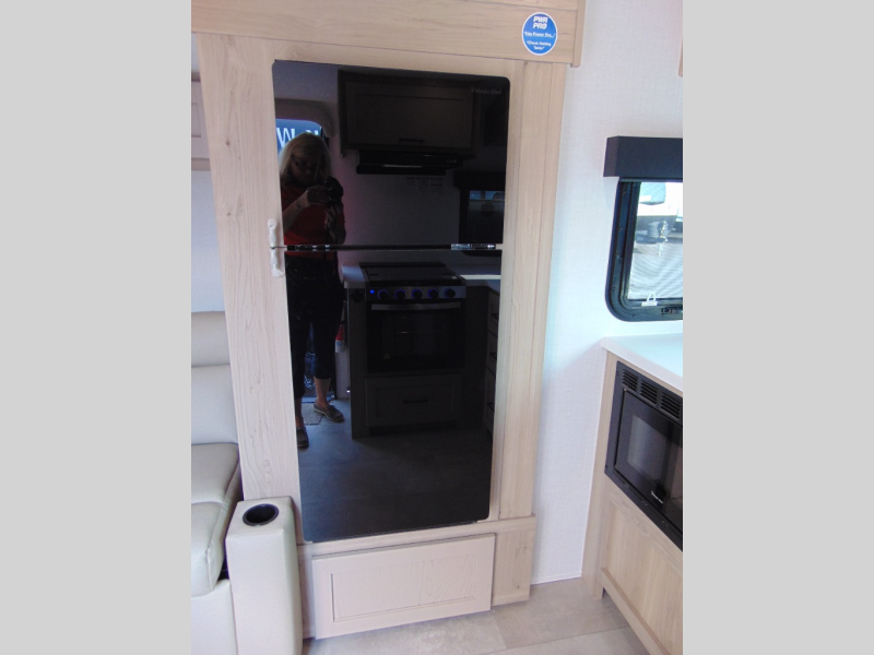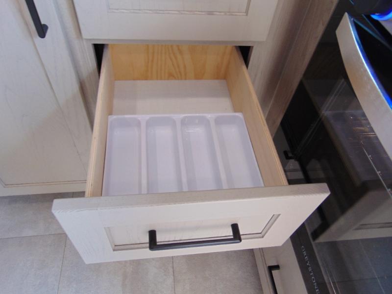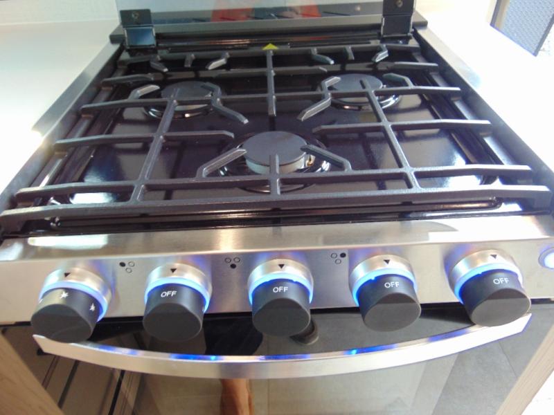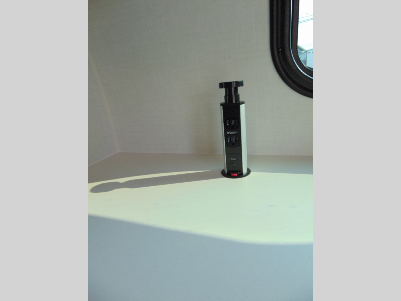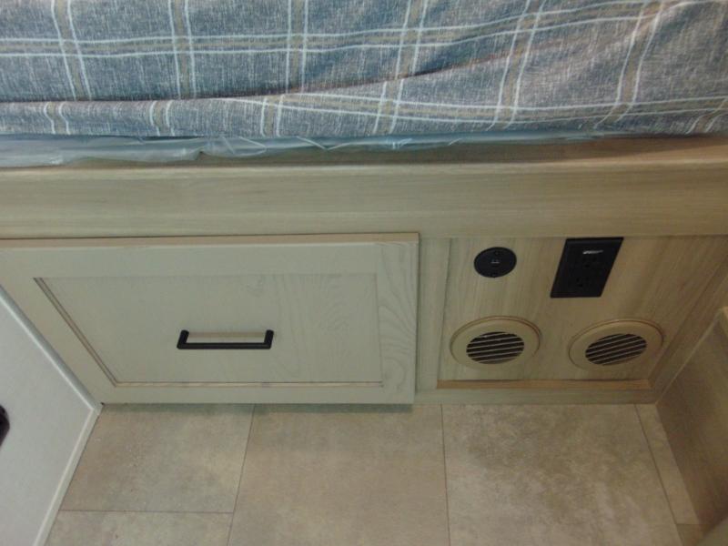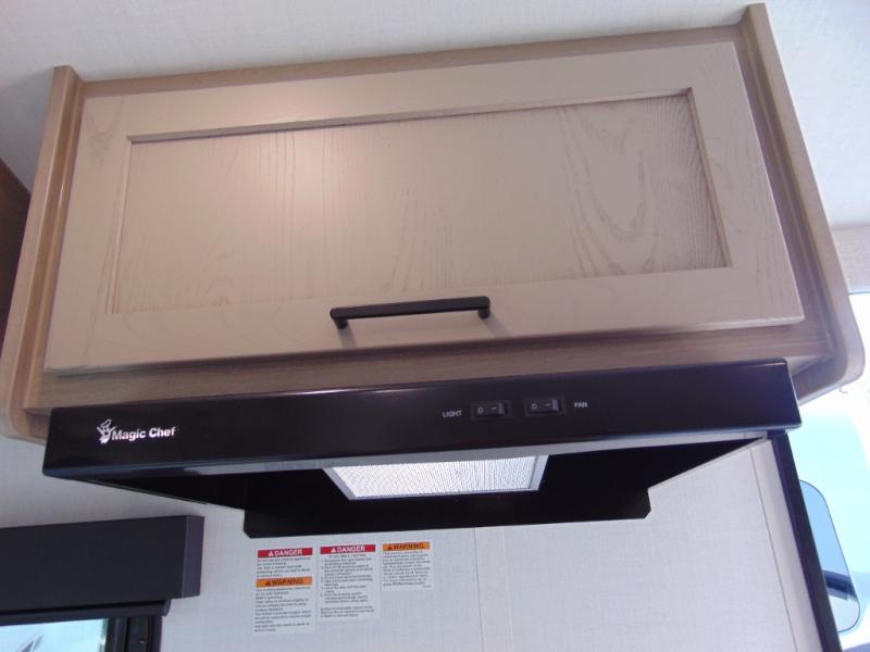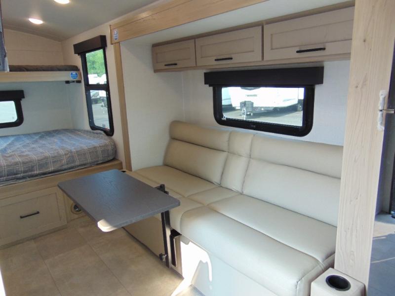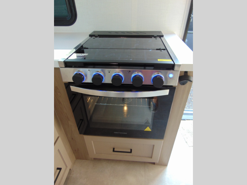 Are you looking for a lightweight trailer with at-home comforts? Take a look at this single slide out unit that can sleep three to four each night. There is a queen-size bed in the back with a 26" x 80" flip-up bunk for cozy sleeping space, a 72" sofa with cupholders to relax on, plus a 32" 12V TV for movie nights! The front kitchen includes a 12V refrigerator to store food, plus a microwave oven and a gas oven to cook meals each day.