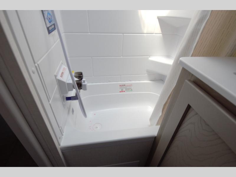 The slide out sofa provides space to relax and includes built in cupholders. Enjoy movie nights with the 32 inch 12V TV. The front kitchen features a 12V refrigerator, microwave, gas oven, and plenty of prep space for daily meals. The full rear bath gives you privacy and convenience on every trip.