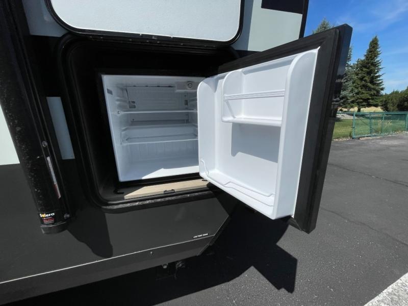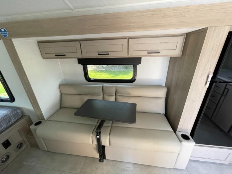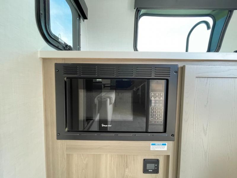 Are you looking for a lightweight trailer with at-home comforts? Take a look at this single slide out unit that can sleep three to four each night. There is a queen-size bed in the back with a 26" x 80" flip-up bunk for cozy sleeping space, a 72" sofa with cupholders to relax on, plus a 32" 12V TV for movie nights! The front kitchen includes a 12V refrigerator to store food, plus a microwave oven and a gas oven to cook meals each day.