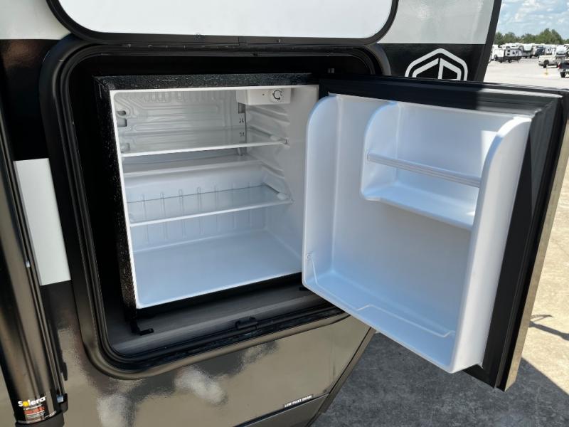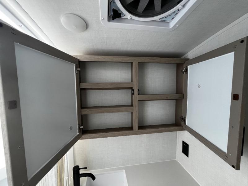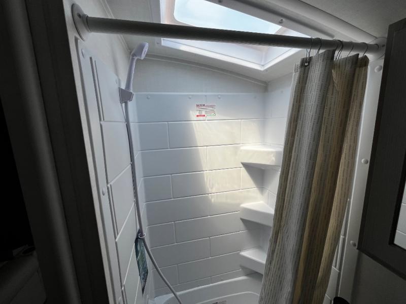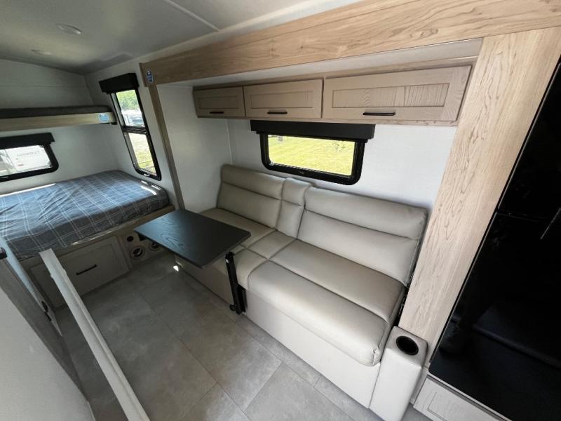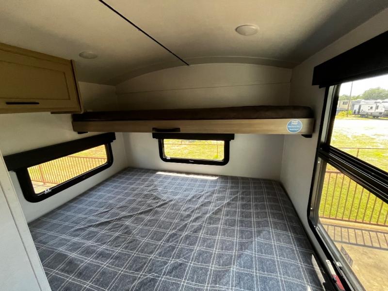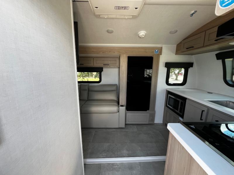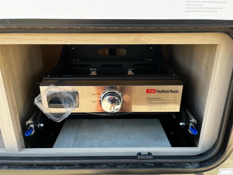 Are you looking for a lightweight trailer with at-home comforts? Take a look at this single slide out unit that can sleep three to four each night. There is a queen-size bed in the back with a 26" x 80" flip-up bunk for cozy sleeping space, a 72" sofa with cupholders to relax on, plus a 32" 12V TV for movie nights! The front kitchen includes a 12V refrigerator to store food, plus a microwave oven and a gas oven to cook meals each day.