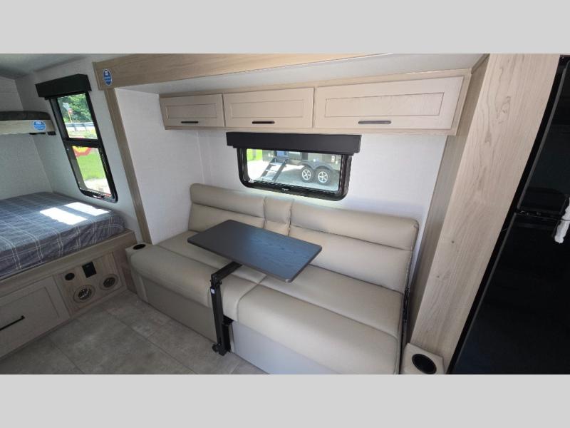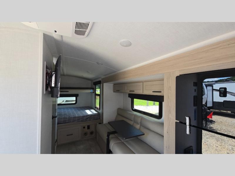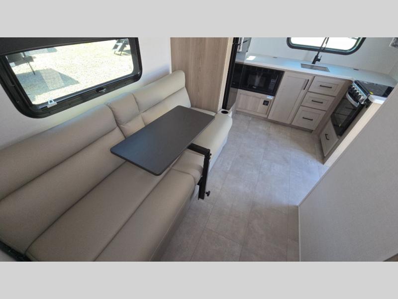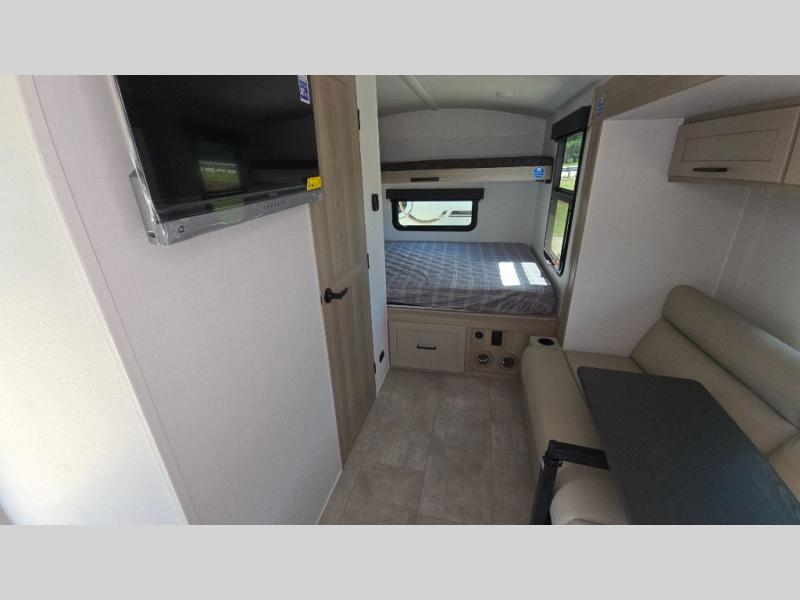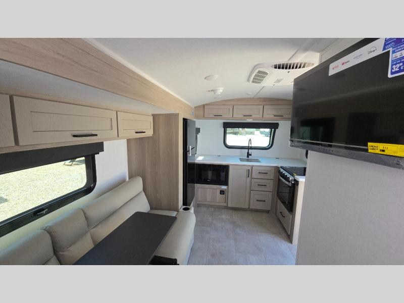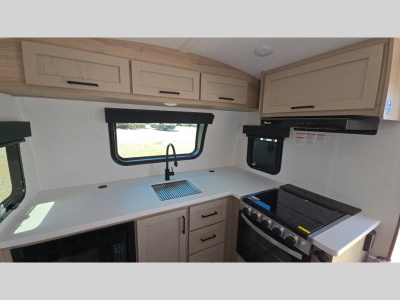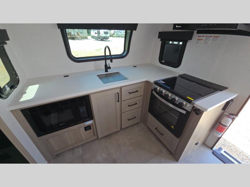Are you looking for a lightweight trailer with at-home comforts? Take a look at this single slide out unit that can sleep three to four each night. There is a queen-size bed in the back with a 26" x 80" flip-up bunk for cozy sleeping space, a 72" sofa with cupholders to relax on, plus a 32" 12V TV for movie nights! The front kitchen includes a 12V refrigerator to store food, plus a microwave oven and a gas oven to cook meals each day.