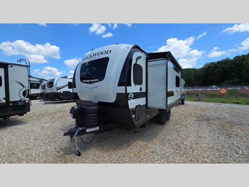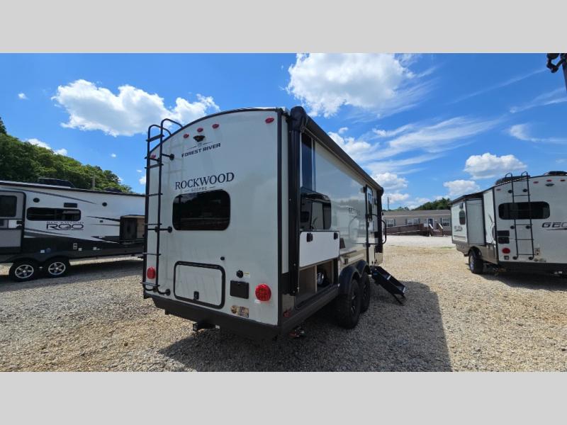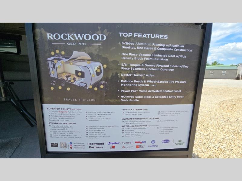 With any Rockwood GEO Pro travel trailer by Forest River you will enjoy easy towing, durable construction, and off-road capabilities with larger 15" tires and a lift kit! Each model is constructed with complete composite wall construction for added strength and durability, and the torsion axle, Rubber-Ryde suspension will make towing easier than ever. Inside, you'll find sleek roller shades for added privacy, a 12V refrigerator and a microwave, plus a 20,000 BTU furnace to keep you warm during the colder camping months.