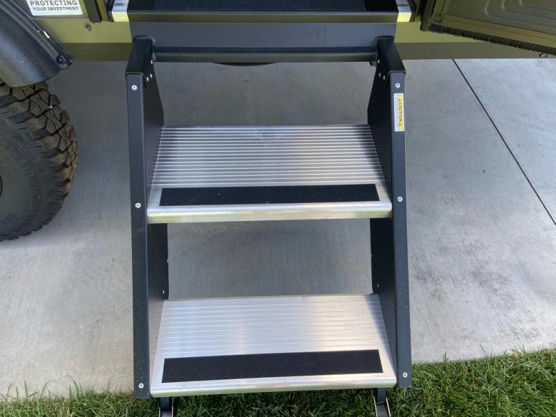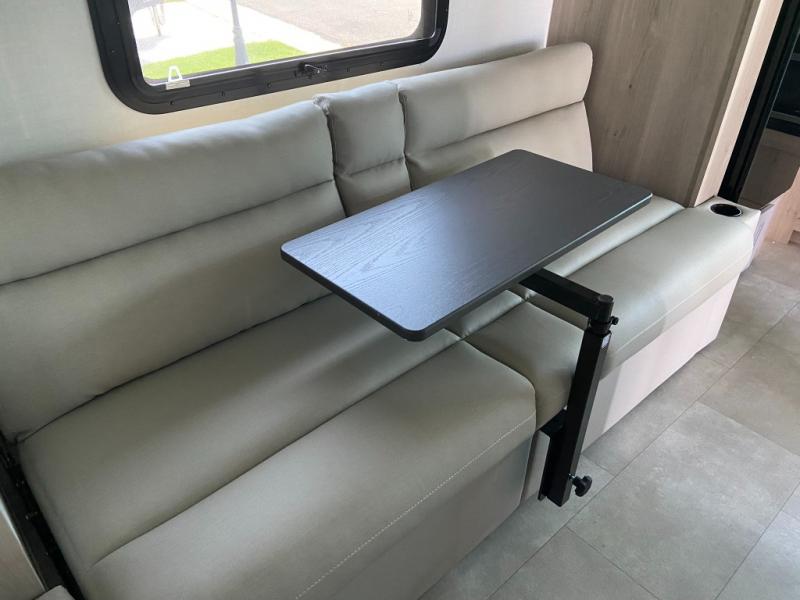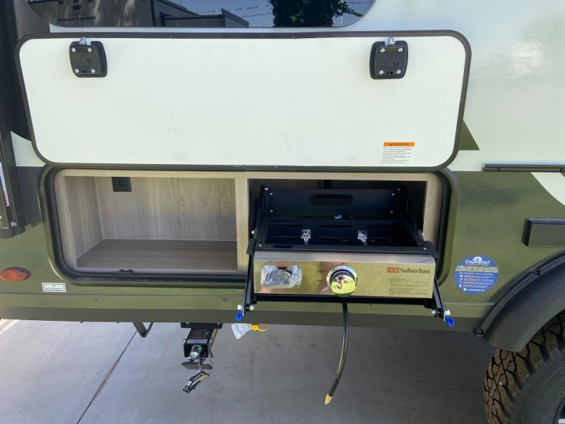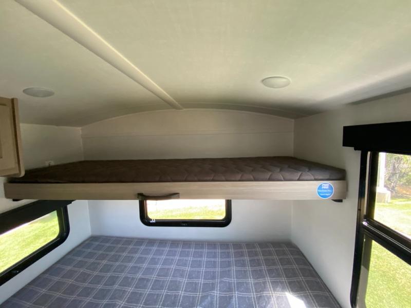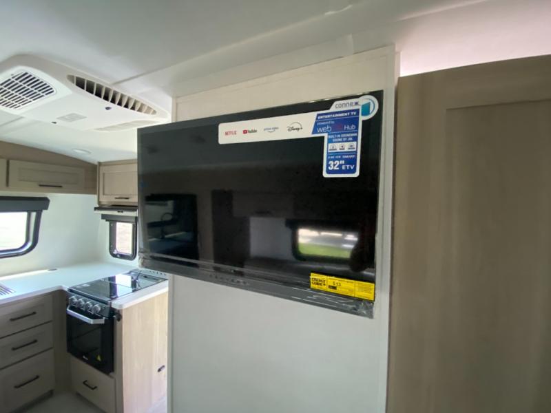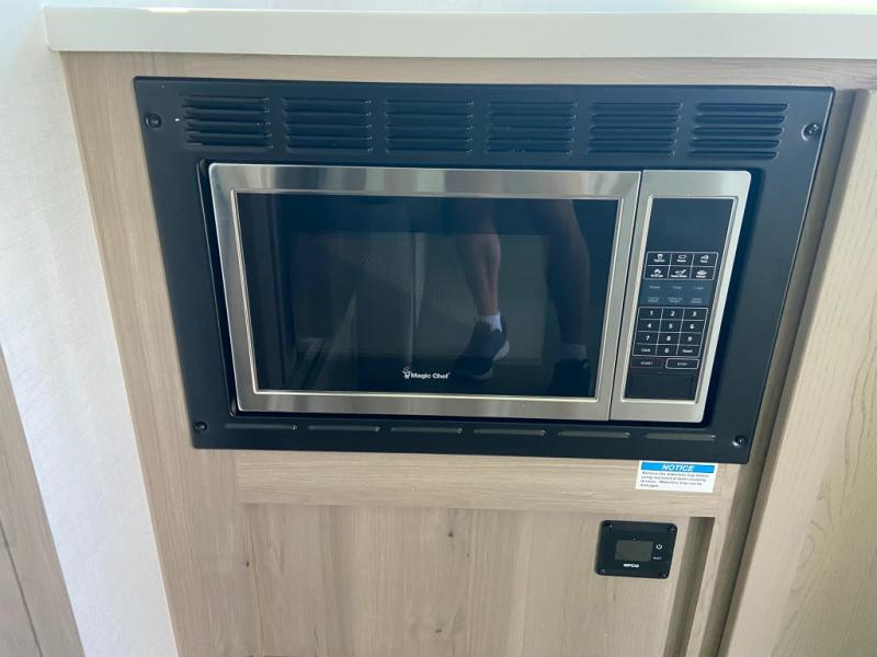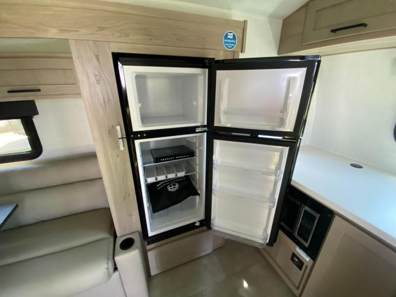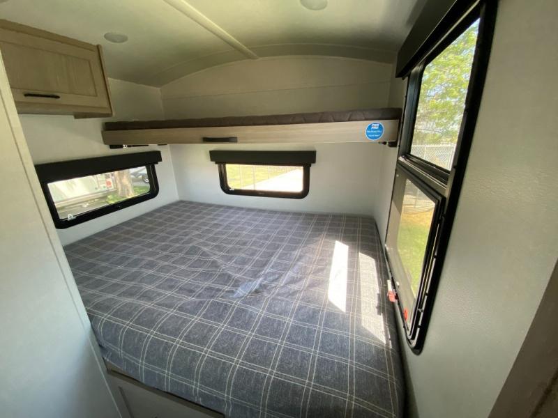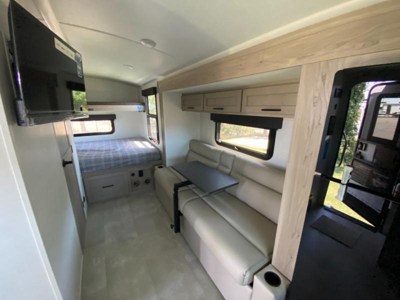 Are you looking for a lightweight trailer with at-home comforts? Take a look at this single slide out unit that can sleep three to four each night. There is a queen-size bed in the back with a 26" x 80" flip-up bunk for cozy sleeping space, a 72" sofa with cupholders to relax on, plus a 32" 12V TV for movie nights! The front kitchen includes a 12V refrigerator to store food, plus a microwave oven and a gas oven to cook meals each day.