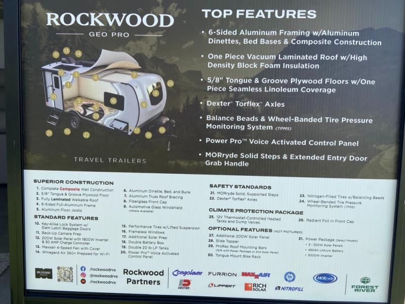 With any Rockwood GEO Pro travel trailer by Forest River you will enjoy easy towing, durable construction, and off-road capabilities with larger 15" tires and a lift kit! Each model is constructed with complete composite wall construction for added strength and durability, and the torsion axle, Rubber-Ryde suspension will make towing easier than ever. Inside, you'll find sleek roller shades for added privacy, a 12V refrigerator and a microwave, plus a 20,000 BTU furnace to keep you warm during the colder camping months.