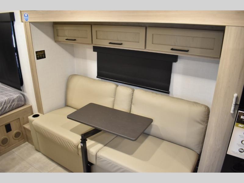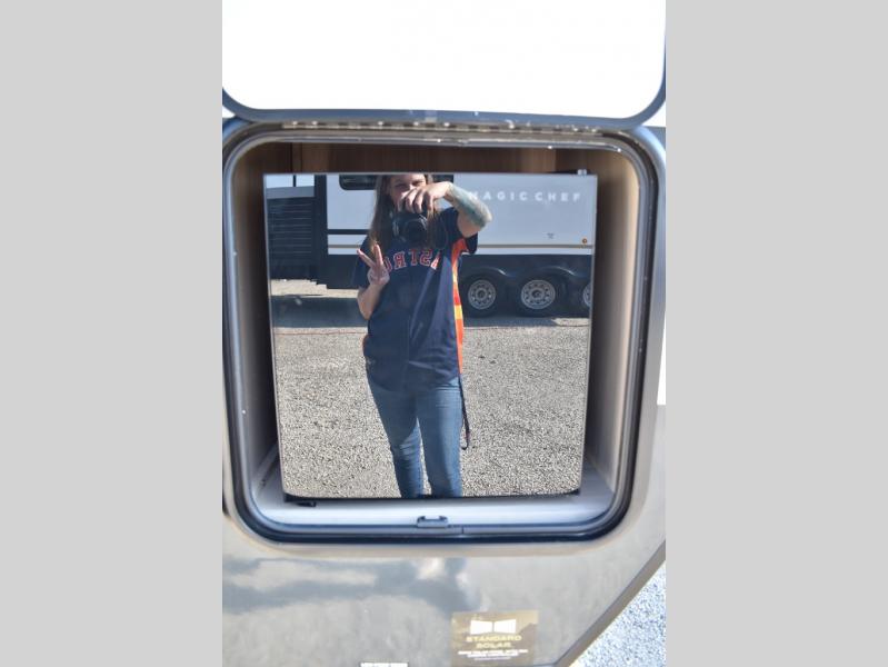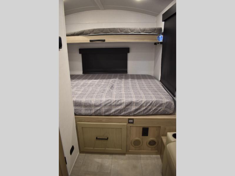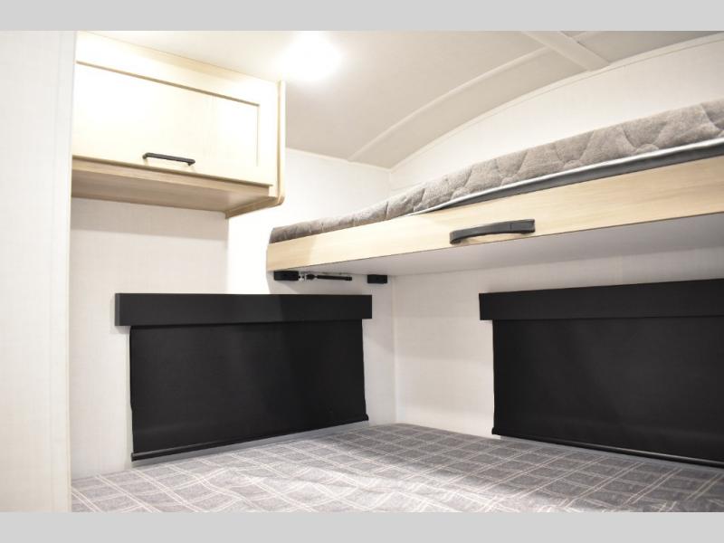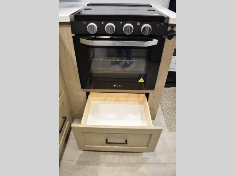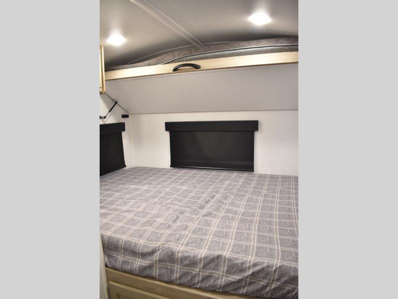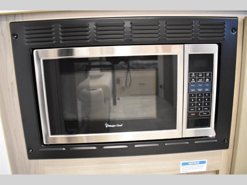Are you looking for a lightweight trailer with at-home comforts? Take a look at this single slide out unit that can sleep three to four each night. There is a queen-size bed in the back with a 26" x 80" flip-up bunk for cozy sleeping space, a 72" sofa with cupholders to relax on, plus a 32" 12V TV for movie nights! The front kitchen includes a 12V refrigerator to store food, plus a microwave oven and a gas oven to cook meals each day.