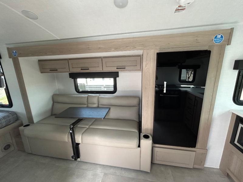 Are you looking for a lightweight trailer with at-home comforts? Take a look at this single slide out unit that can sleep three to four each night. There is a queen-size bed in the back with a 26" x 80" flip-up bunk for cozy sleeping space, a 72" sofa with cupholders to relax on, plus a 32" 12V TV for movie nights! The front kitchen includes a 12V refrigerator to store food, plus a microwave oven and a gas oven to cook meals each day.
