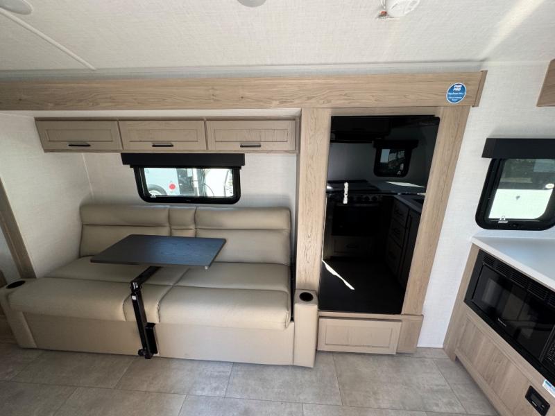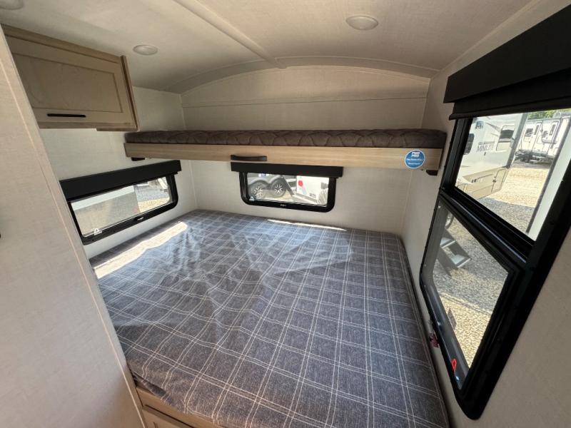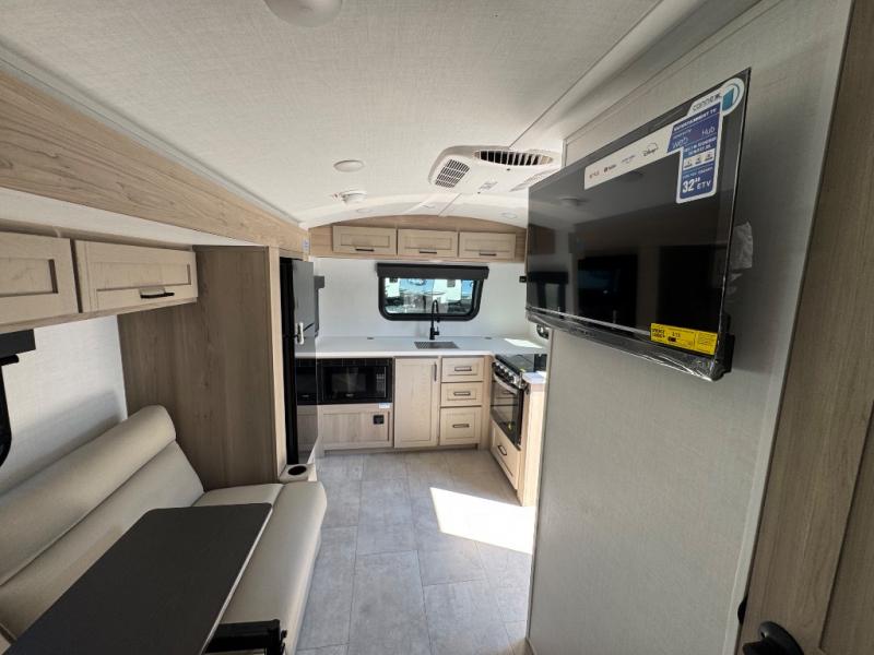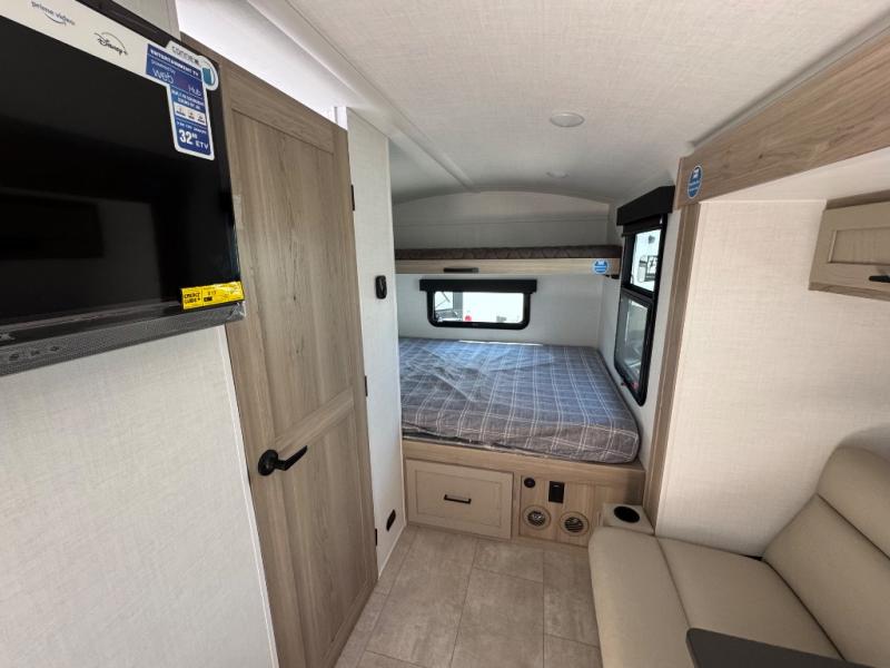 Are you looking for a lightweight trailer with at-home comforts? Take a look at this single slide out unit that can sleep three to four each night. There is a queen-size bed in the back with a 26" x 80" flip-up bunk for cozy sleeping space, a 72" sofa with cupholders to relax on, plus a 32" 12V TV for movie nights! The front kitchen includes a 12V refrigerator to store food, plus a microwave oven and a gas oven to cook meals each day.