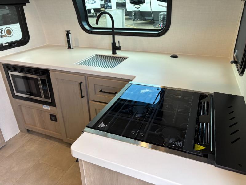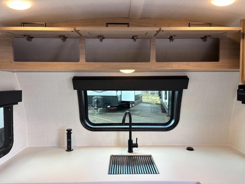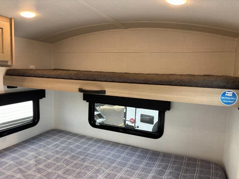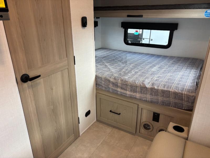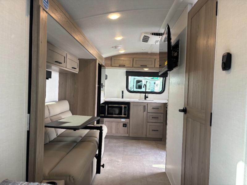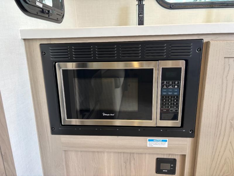 Are you looking for a lightweight trailer with at-home comforts? Take a look at this single slide out unit that can sleep three to four each night. There is a queen-size bed in the back with a 26" x 80" flip-up bunk for cozy sleeping space, a 72" sofa with cupholders to relax on, plus a 32" 12V TV for movie nights! The front kitchen includes a 12V refrigerator to store food, plus a microwave oven and a gas oven to cook meals each day.