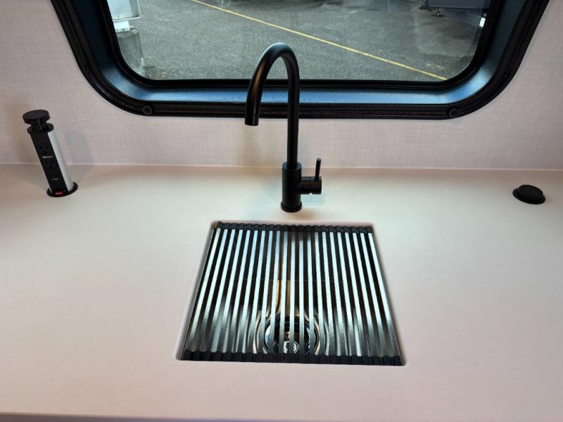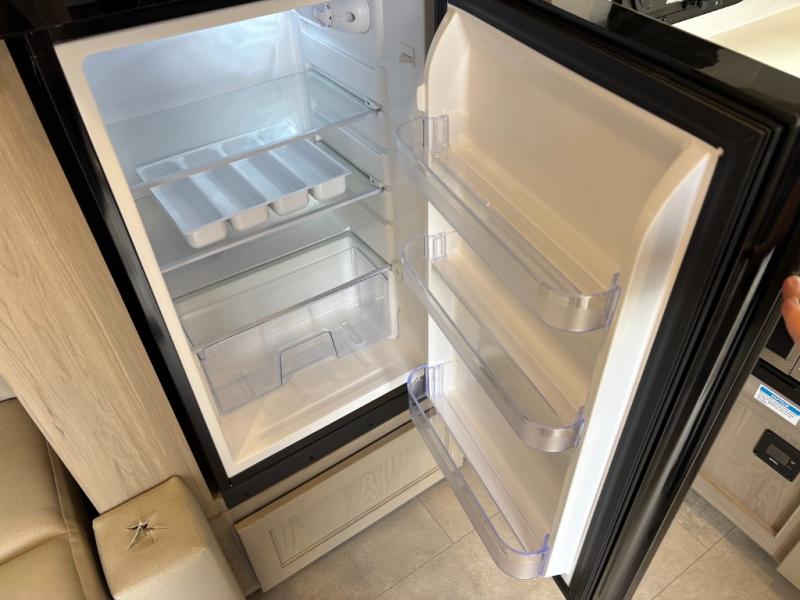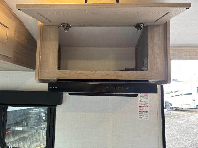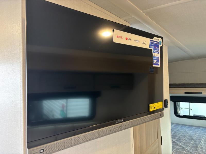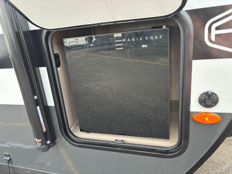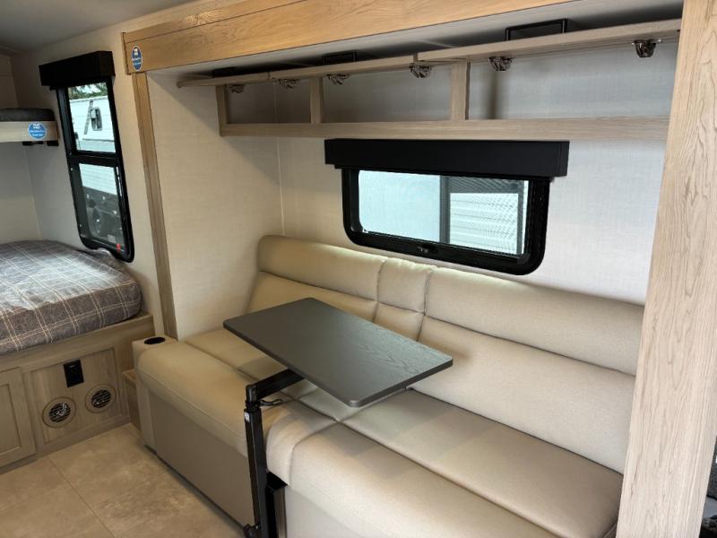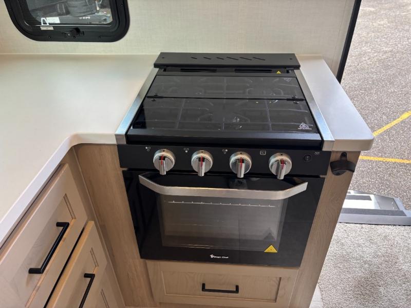 Are you looking for a lightweight trailer with at-home comforts? Take a look at this single slide out unit that can sleep three to four each night. There is a queen-size bed in the back with a 26" x 80" flip-up bunk for cozy sleeping space, a 72" sofa with cupholders to relax on, plus a 32" 12V TV for movie nights! The front kitchen includes a 12V refrigerator to store food, plus a microwave oven and a gas oven to cook meals each day.