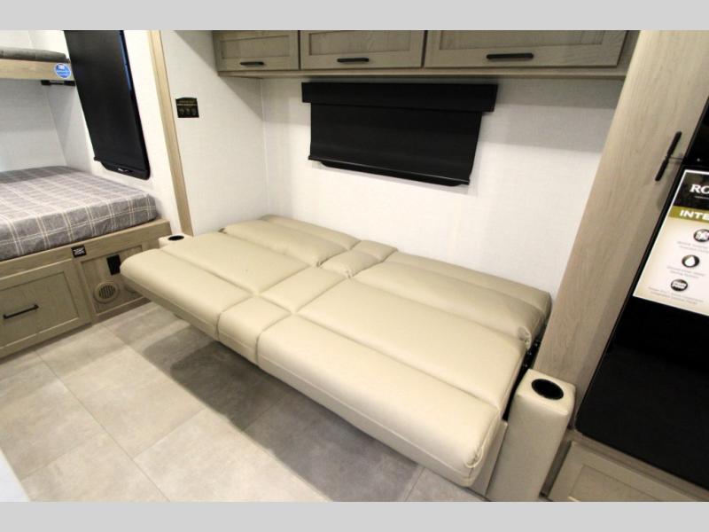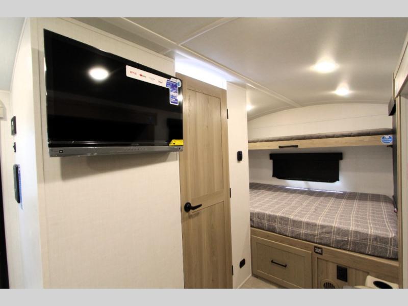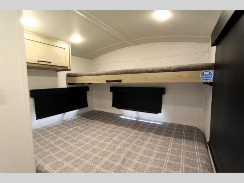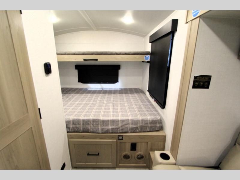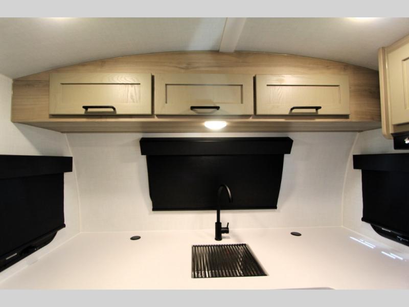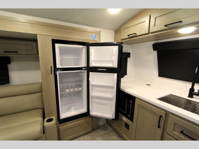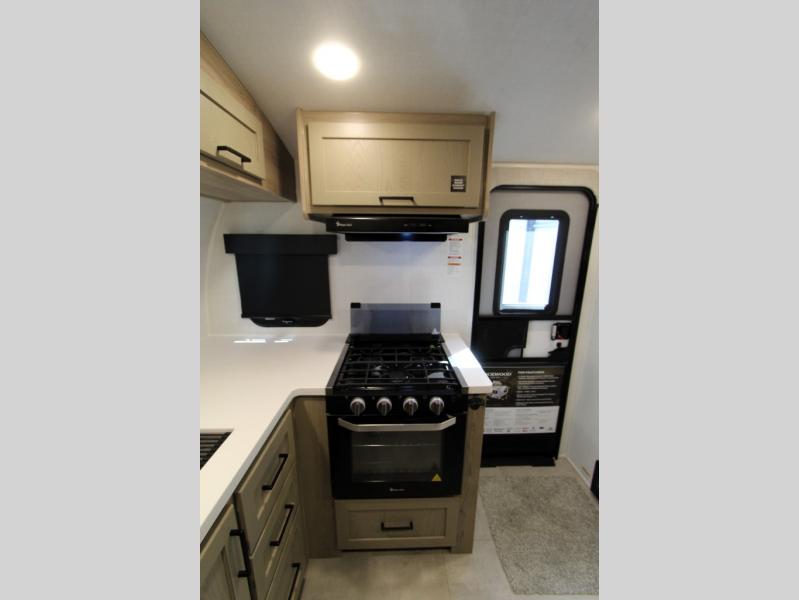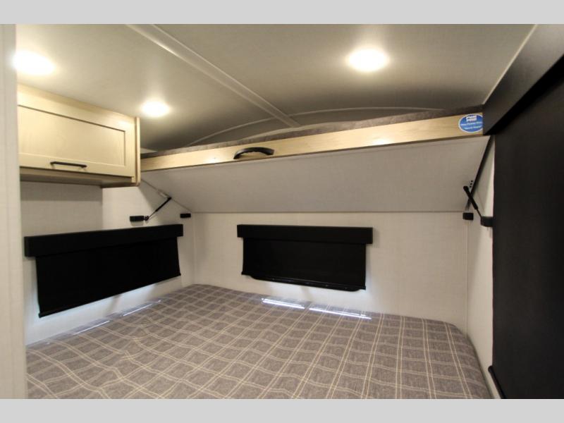 Are you looking for a lightweight trailer with at-home comforts? Take a look at this single slide out unit that can sleep three to four each night. There is a queen-size bed in the back with a 26" x 80" flip-up bunk for cozy sleeping space, a 72" sofa with cupholders to relax on, plus a 32" 12V TV for movie nights! The front kitchen includes a 12V refrigerator to store food, plus a microwave oven and a gas oven to cook meals each day.