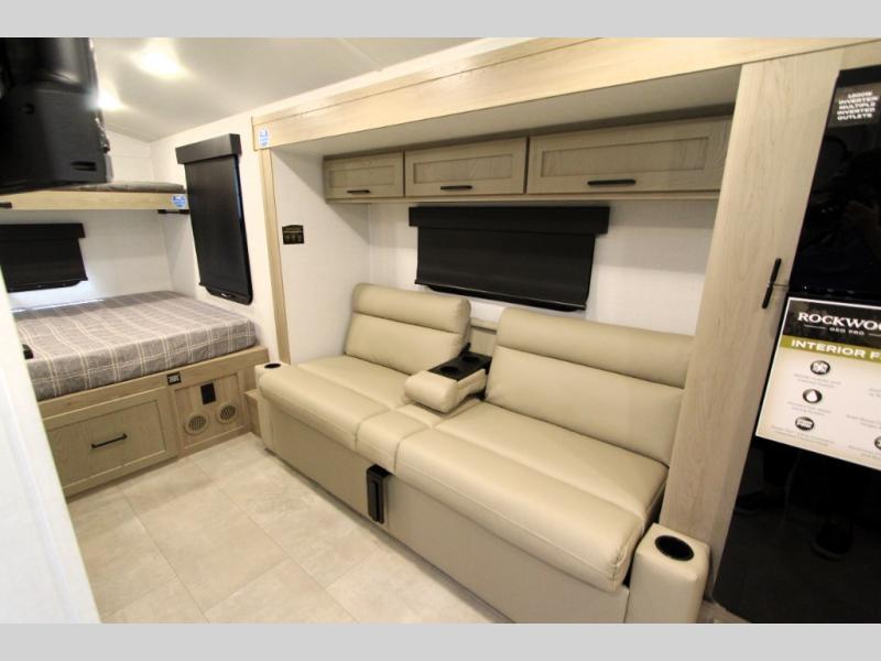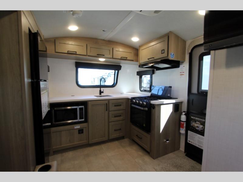 With any Rockwood GEO Pro travel trailer by Forest River you will enjoy easy towing, durable construction, and off-road capabilities with larger 15" tires and a lift kit! Each model is constructed with complete composite wall construction for added strength and durability, and the torsion axle, Rubber-Ryde suspension will make towing easier than ever. Inside, you'll find sleek roller shades for added privacy, a 12V refrigerator and a microwave, plus a 20,000 BTU furnace to keep you warm during the colder camping months.