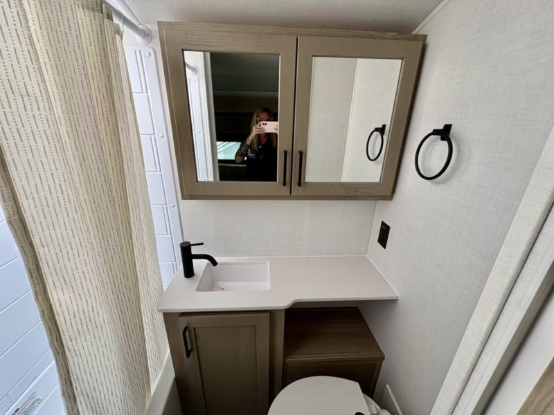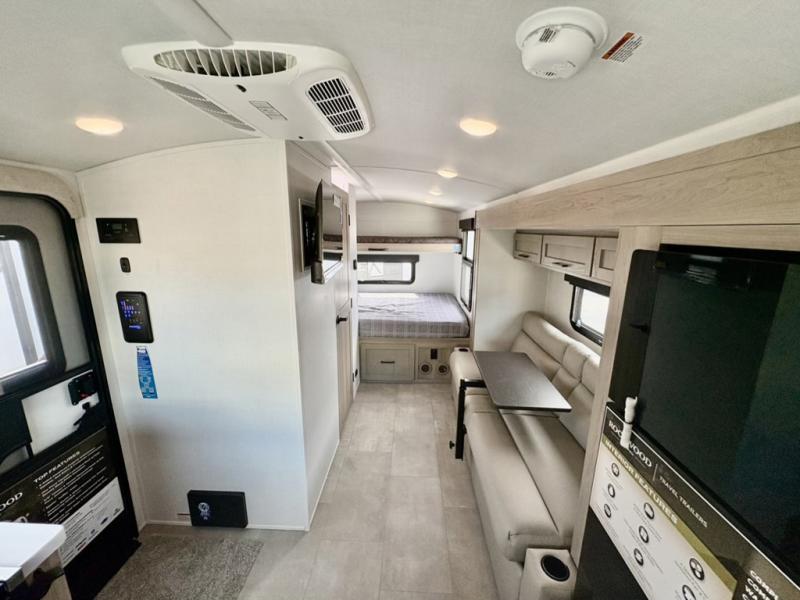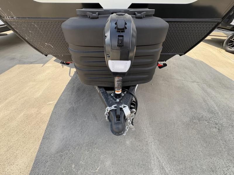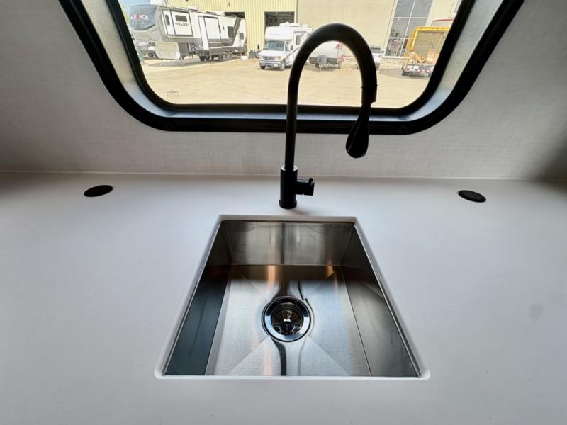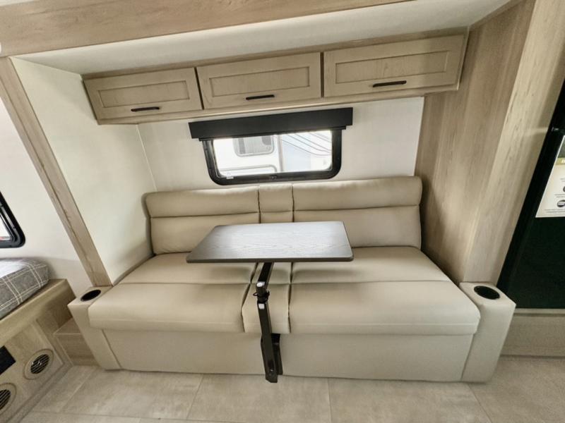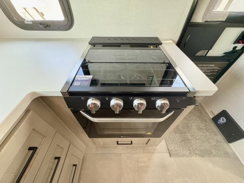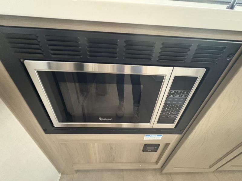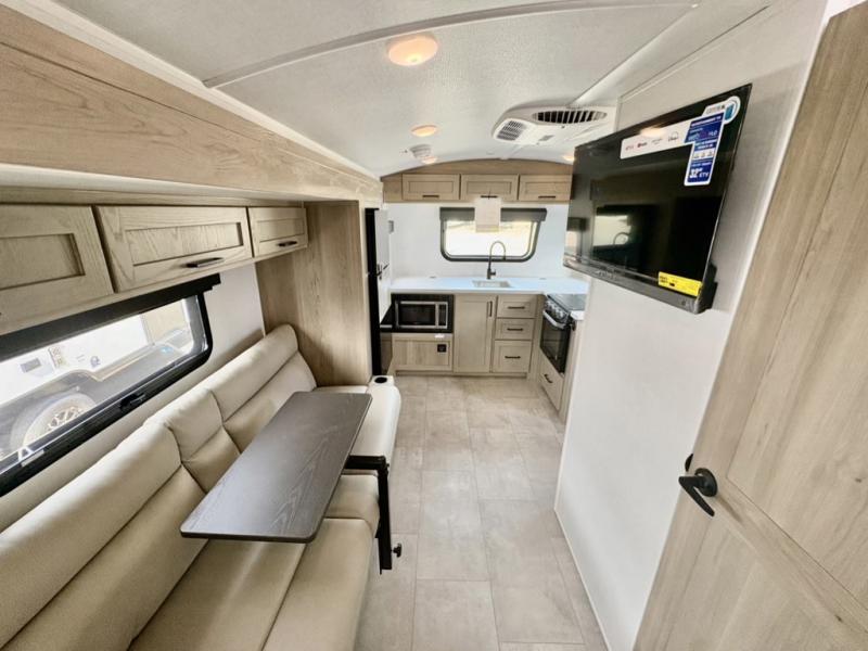 Are you looking for a lightweight trailer with at-home comforts? Take a look at this single slide out unit that can sleep three to four each night. There is a queen-size bed in the back with a 26" x 80" flip-up bunk for cozy sleeping space, a 72" sofa with cupholders to relax on, plus a 32" 12V TV for movie nights! The front kitchen includes a 12V refrigerator to store food, plus a microwave oven and a gas oven to cook meals each day.
