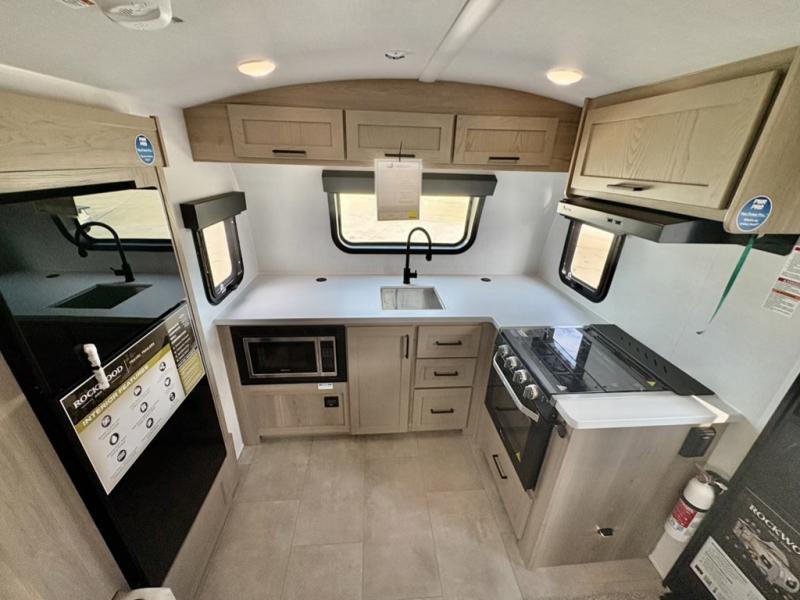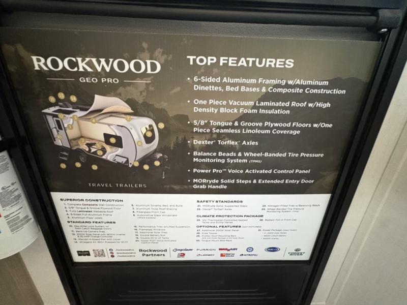 With any Rockwood GEO Pro travel trailer by Forest River you will enjoy easy towing, durable construction, and off-road capabilities with larger 15" tires and a lift kit! Each model is constructed with complete composite wall construction for added strength and durability, and the torsion axle, Rubber-Ryde suspension will make towing easier than ever. Inside, you'll find sleek roller shades for added privacy, a 12V refrigerator and a microwave, plus a 20,000 BTU furnace to keep you warm during the colder camping months.