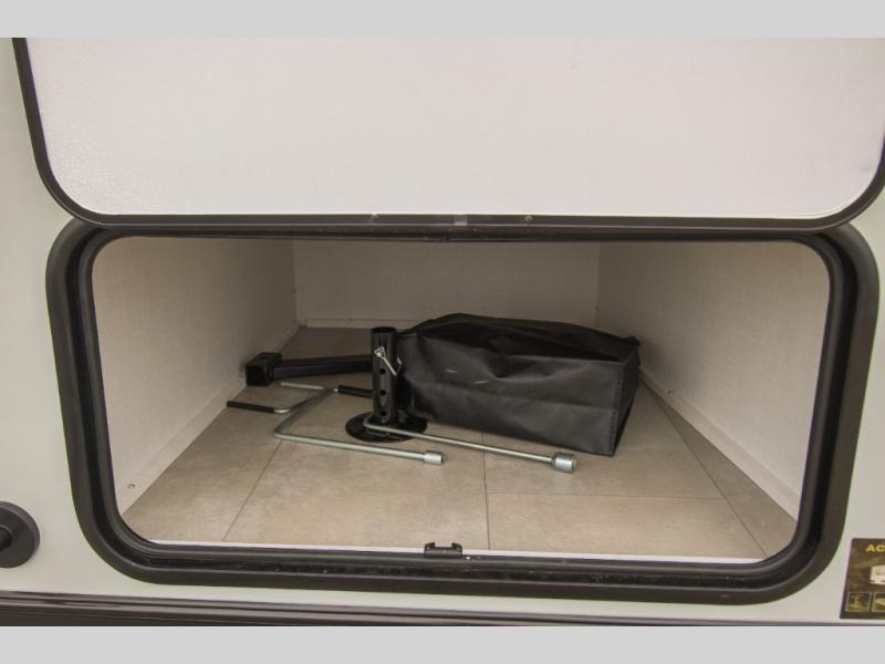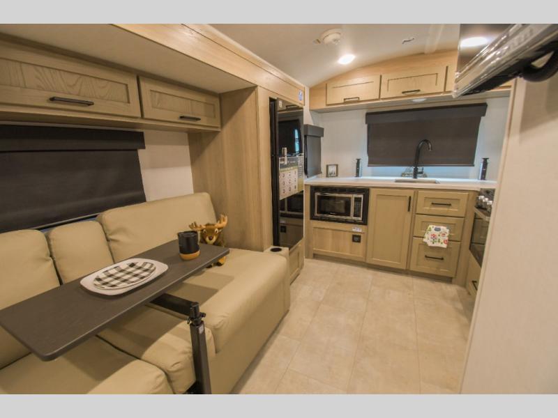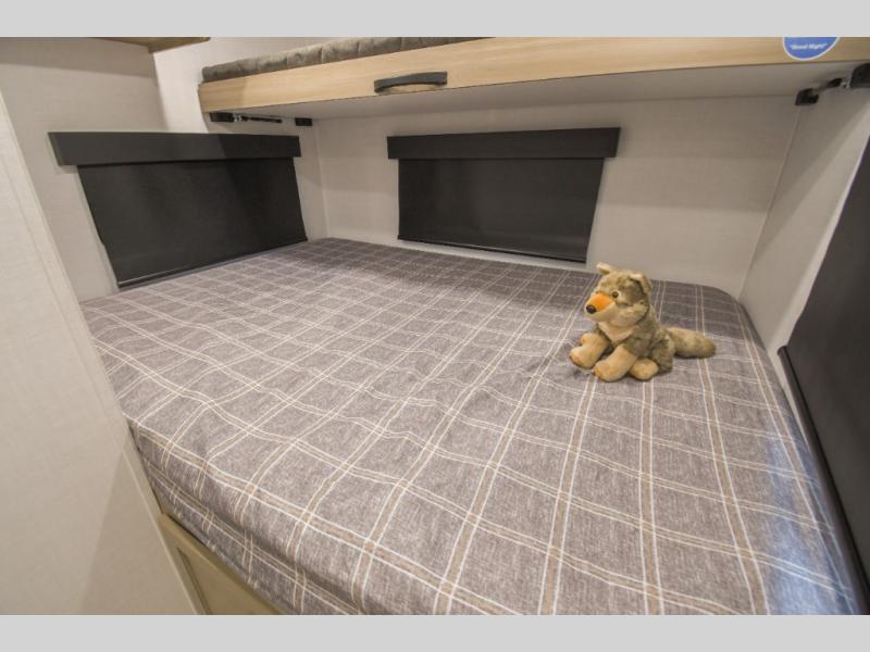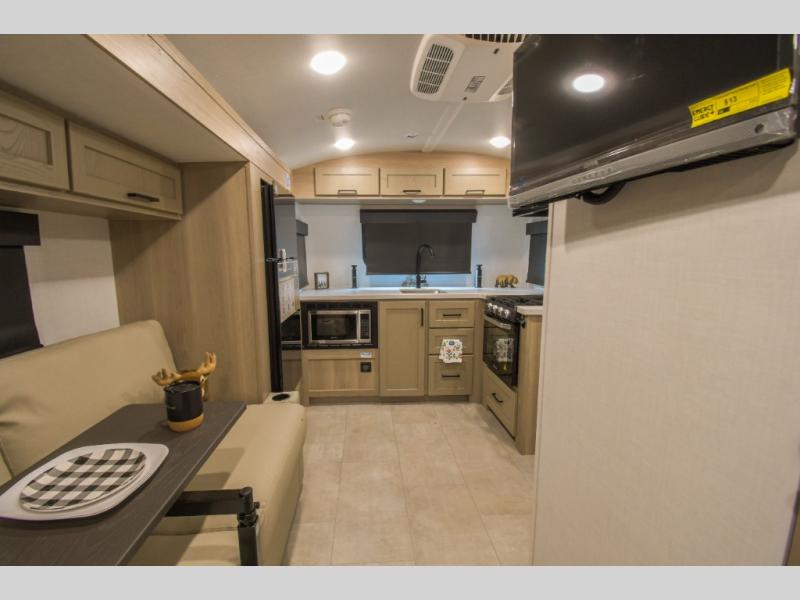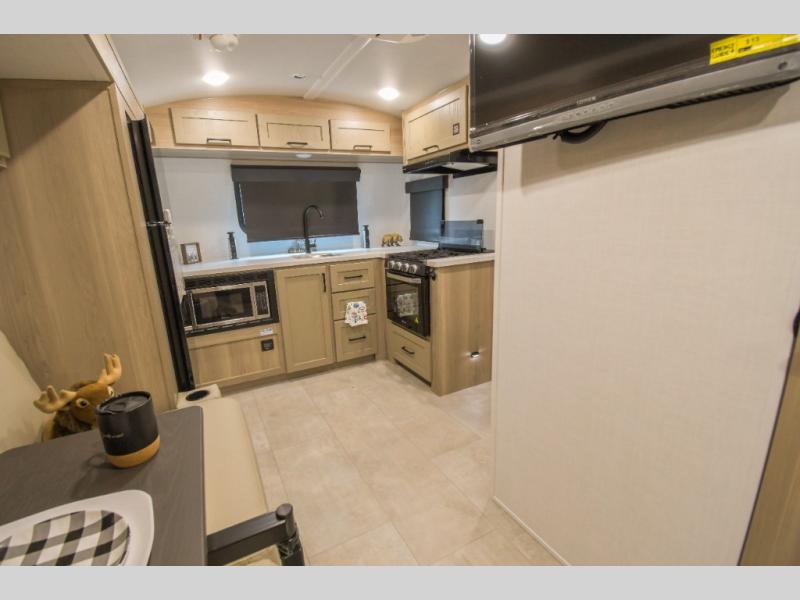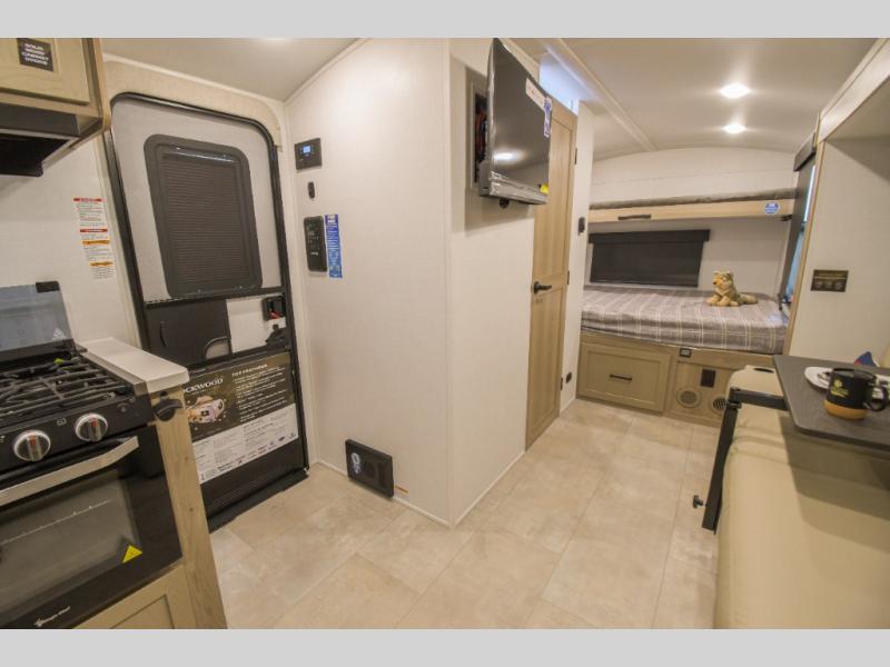 Are you looking for a lightweight trailer with at-home comforts? Take a look at this single slide out unit that can sleep three to four each night. There is a queen-size bed in the back with a 26" x 80" flip-up bunk for cozy sleeping space, a 72" sofa with cupholders to relax on, plus a 32" 12V TV for movie nights! The front kitchen includes a 12V refrigerator to store food, plus a microwave oven and a gas oven to cook meals each day.