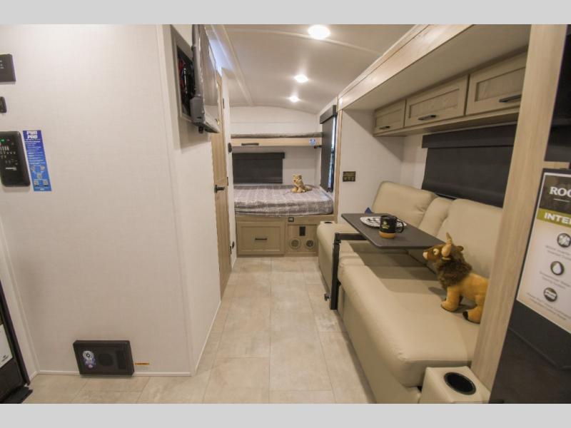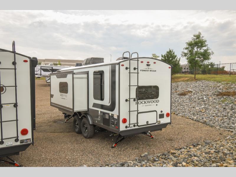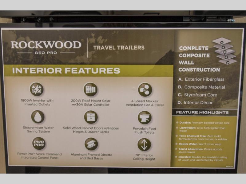 With any Rockwood GEO Pro travel trailer by Forest River you will enjoy easy towing, durable construction, and off-road capabilities with larger 15" tires and a lift kit! Each model is constructed with complete composite wall construction for added strength and durability, and the torsion axle, Rubber-Ryde suspension will make towing easier than ever. Inside, you'll find sleek roller shades for added privacy, a 12V refrigerator and a microwave, plus a 20,000 BTU furnace to keep you warm during the colder camping months.