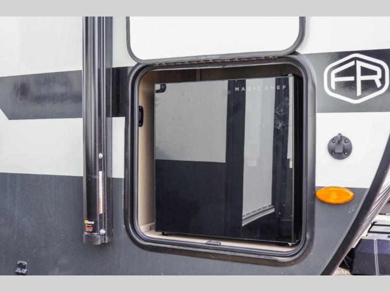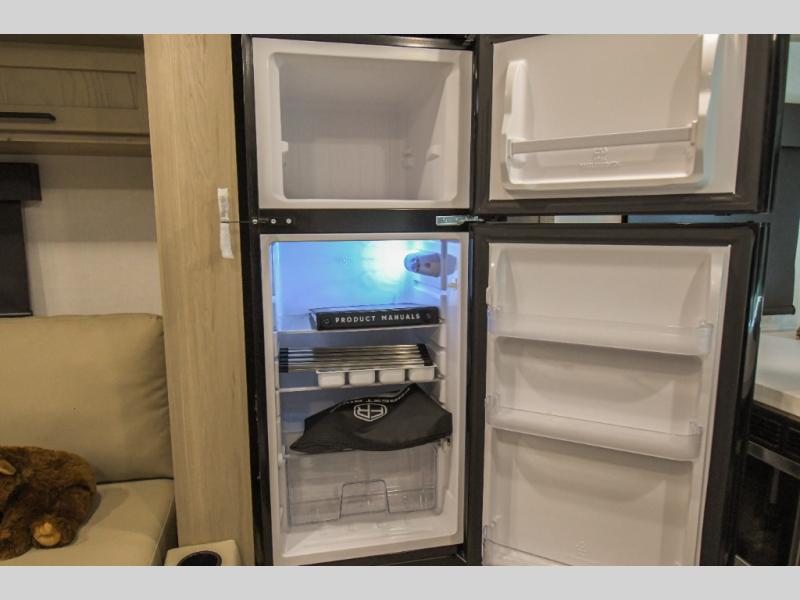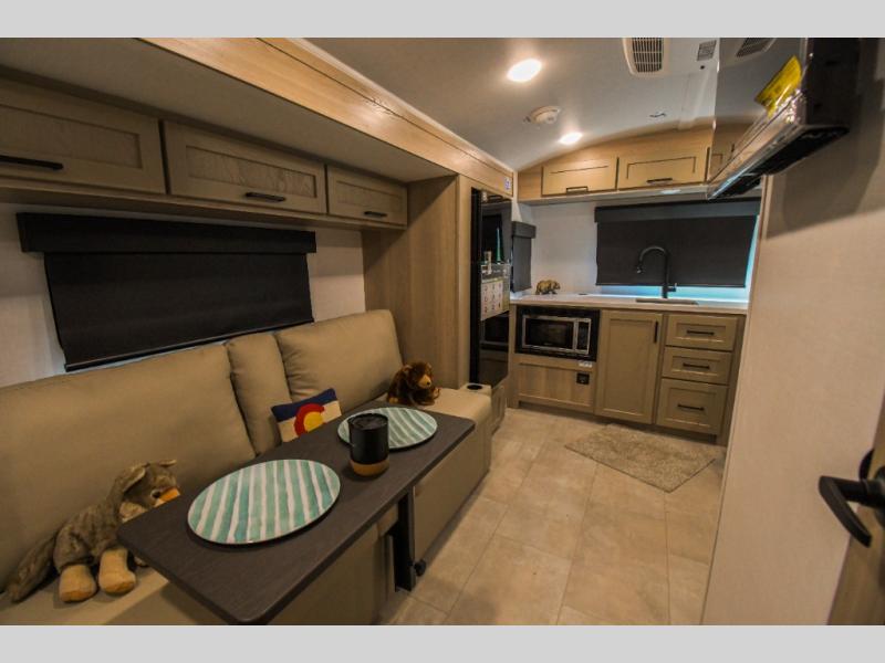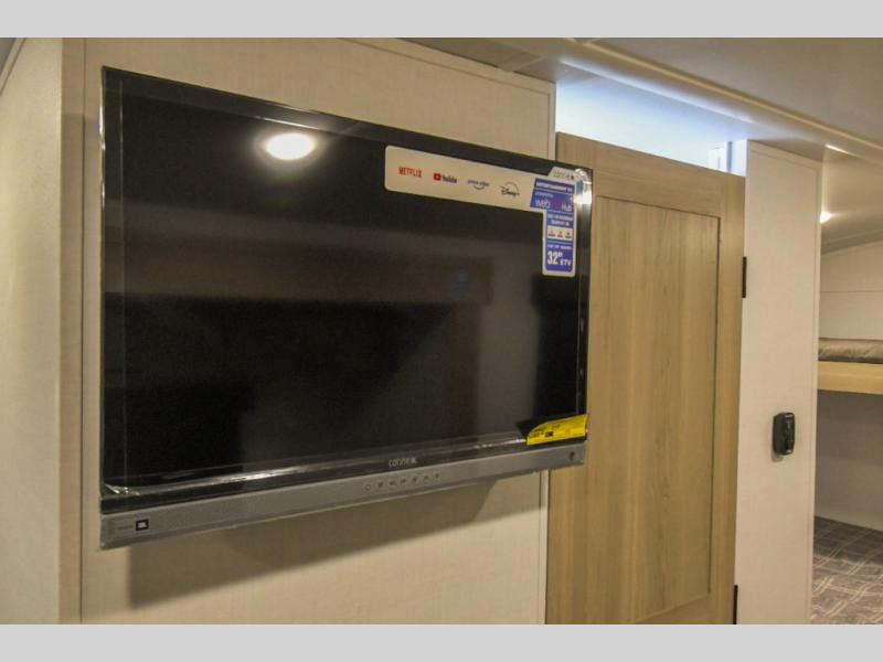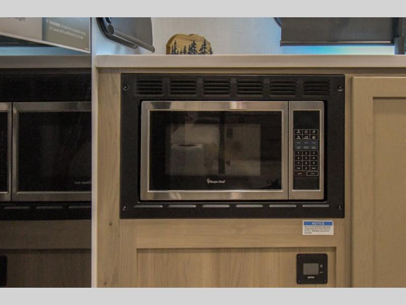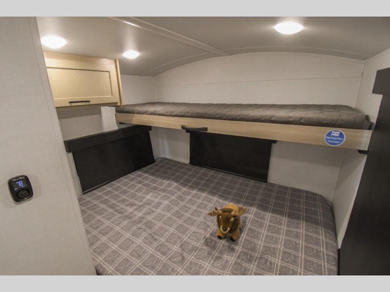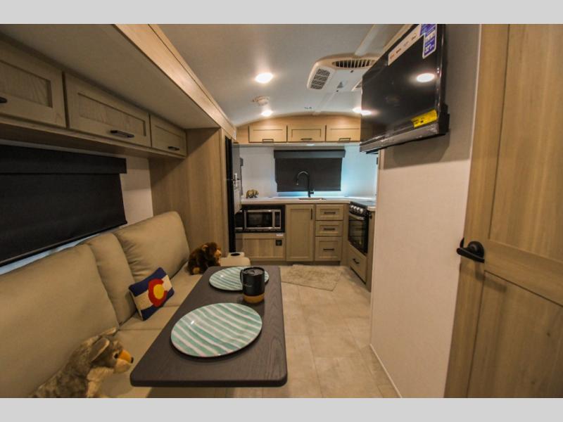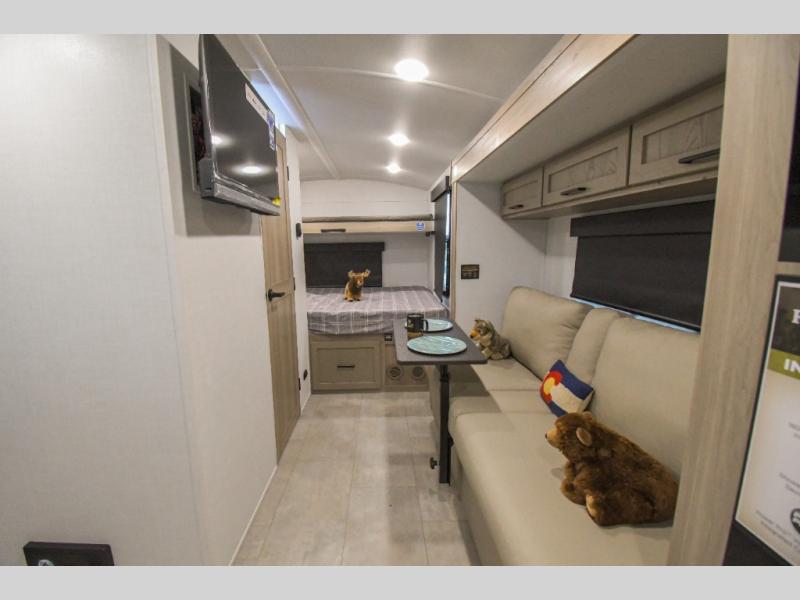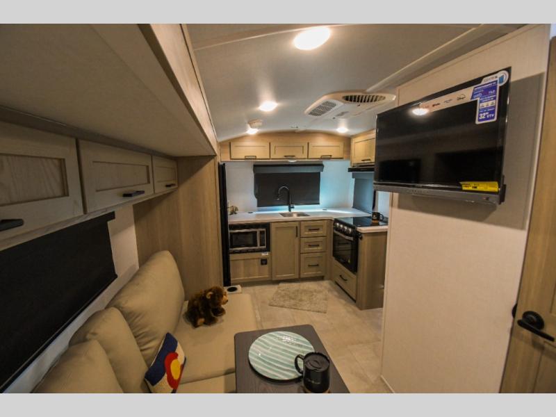 Are you looking for a lightweight trailer with at-home comforts? Take a look at this single slide out unit that can sleep three to four each night. There is a queen-size bed in the back with a 26" x 80" flip-up bunk for cozy sleeping space, a 72" sofa with cupholders to relax on, plus a 32" 12V TV for movie nights! The front kitchen includes a 12V refrigerator to store food, plus a microwave oven and a gas oven to cook meals each day.