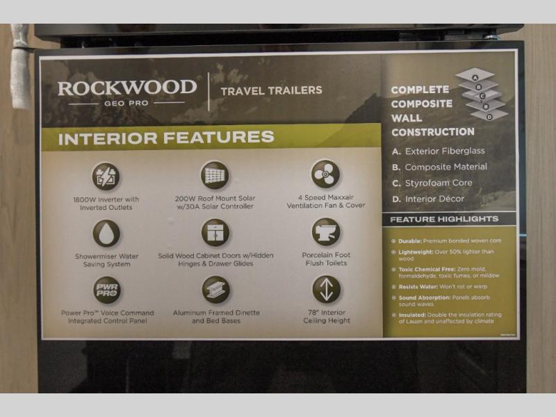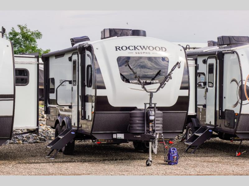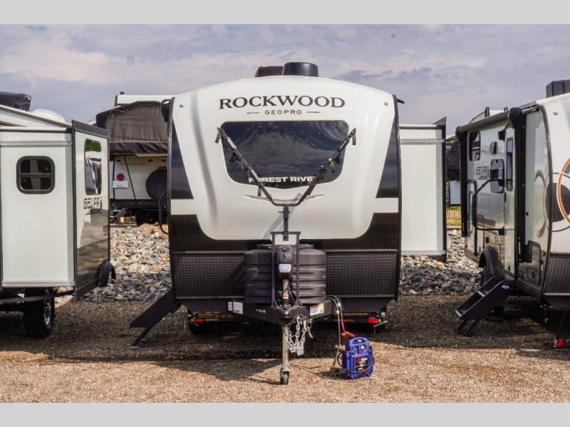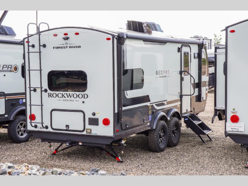 With any Rockwood GEO Pro travel trailer by Forest River you will enjoy easy towing, durable construction, and off-road capabilities with larger 15" tires and a lift kit! Each model is constructed with complete composite wall construction for added strength and durability, and the torsion axle, Rubber-Ryde suspension will make towing easier than ever. Inside, you'll find sleek roller shades for added privacy, a 12V refrigerator and a microwave, plus a 20,000 BTU furnace to keep you warm during the colder camping months.