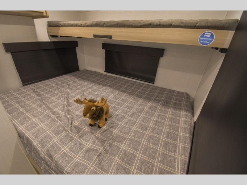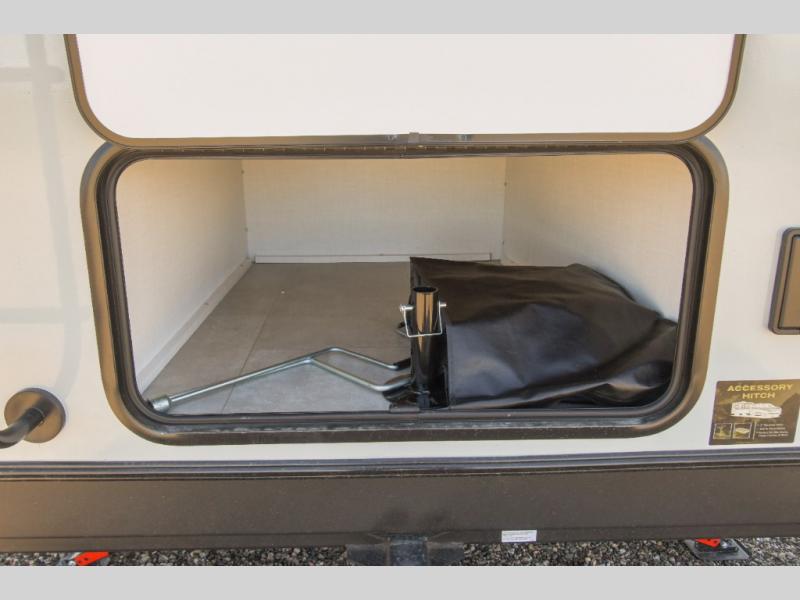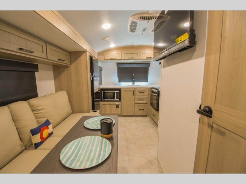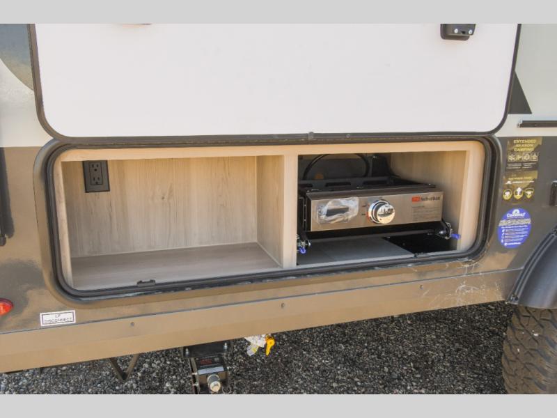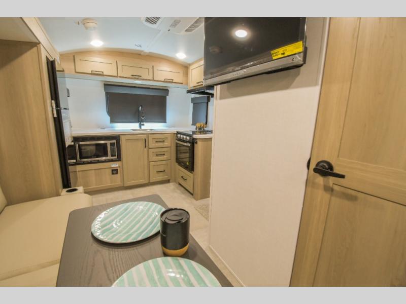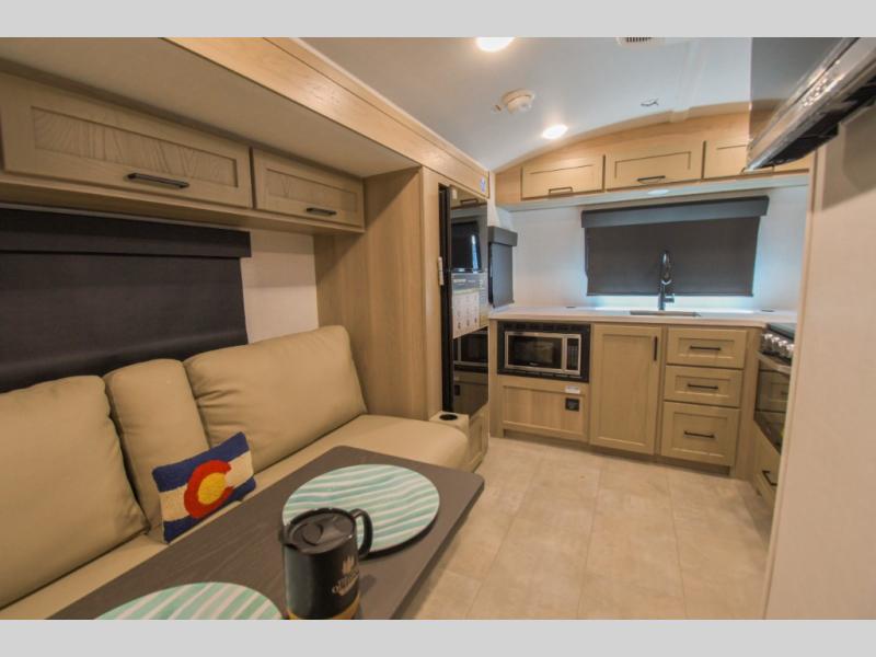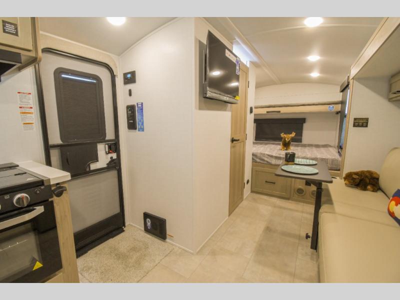 Are you looking for a lightweight trailer with at-home comforts? Take a look at this single slide out unit that can sleep three to four each night. There is a queen-size bed in the back with a 26" x 80" flip-up bunk for cozy sleeping space, a 72" sofa with cupholders to relax on, plus a 32" 12V TV for movie nights! The front kitchen includes a 12V refrigerator to store food, plus a microwave oven and a gas oven to cook meals each day.