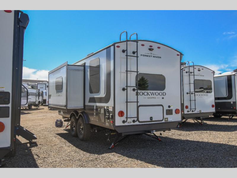 With any Rockwood GEO Pro travel trailer by Forest River you will enjoy easy towing, durable construction, and off-road capabilities with larger 15" tires and a lift kit! Each model is constructed with complete composite wall construction for added strength and durability, and the torsion axle, Rubber-Ryde suspension will make towing easier than ever. Inside, you'll find sleek roller shades for added privacy, a 12V refrigerator and a microwave, plus a 20,000 BTU furnace to keep you warm during the colder camping months.