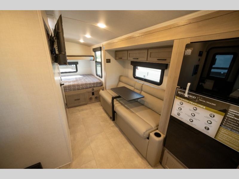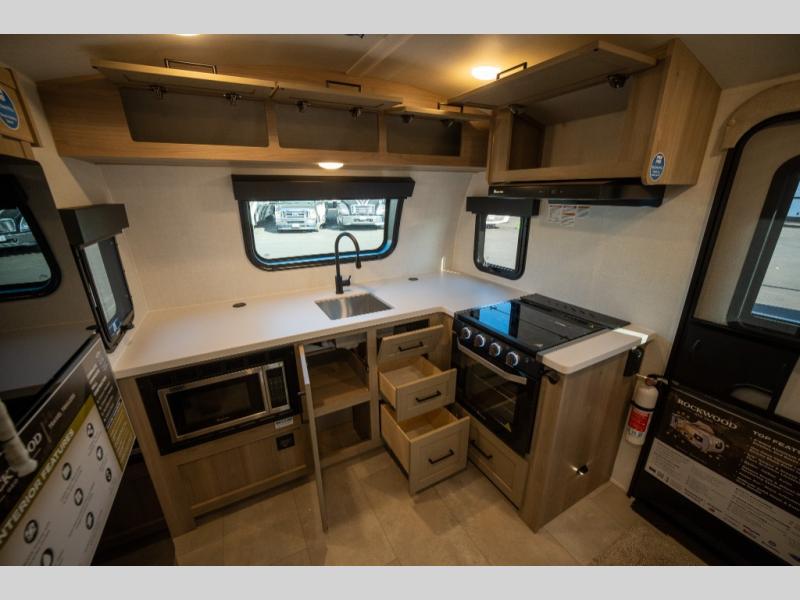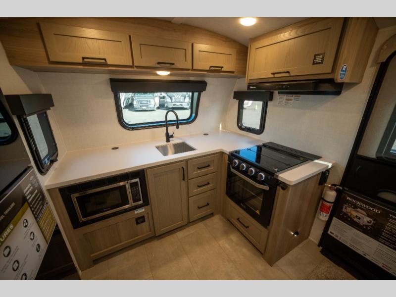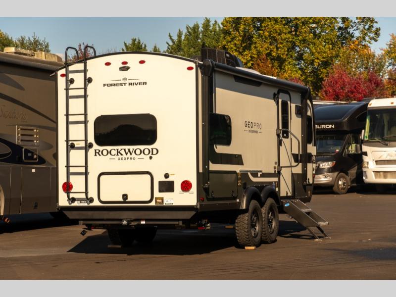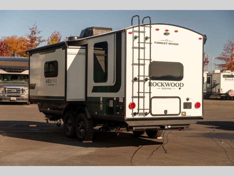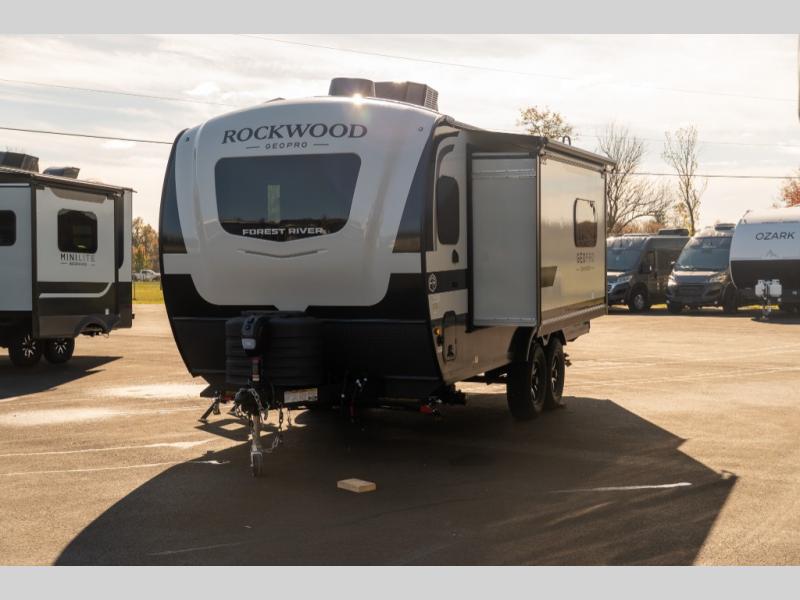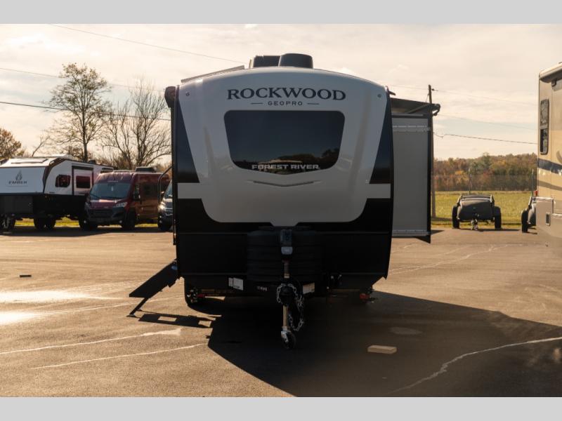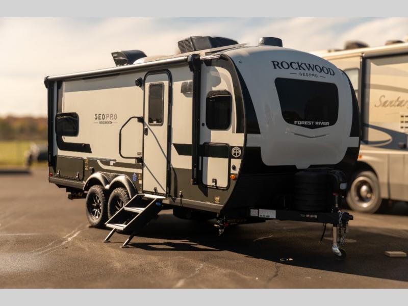 With any Rockwood GEO Pro travel trailer by Forest River you will enjoy easy towing, durable construction, and off-road capabilities with larger laminated roof! Each model is constructed with complete composite wall construction for added strength and durability, and Dexter® axles that will make towing easier than ever. Inside, you'll find sleek back up camera prep for added security, a refrigerator and a microwave, plus many other interior amenities that will make you feel at home on the road.