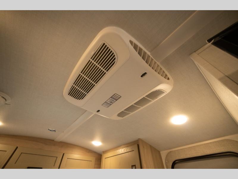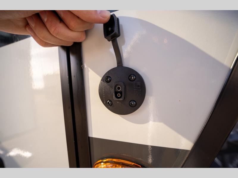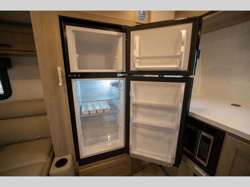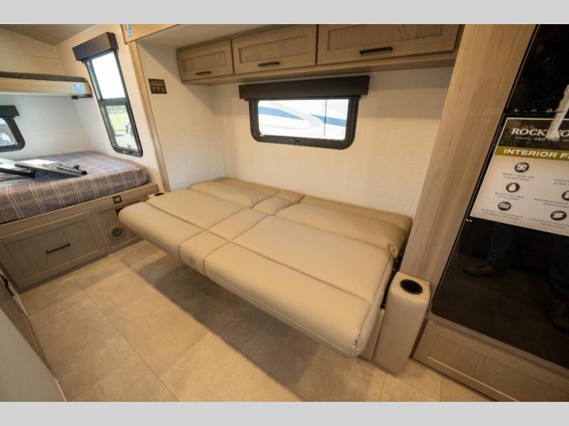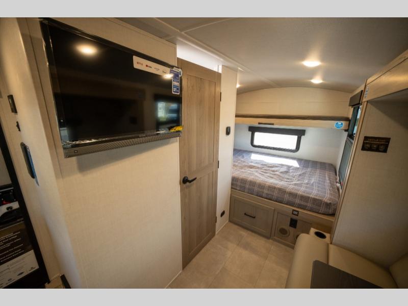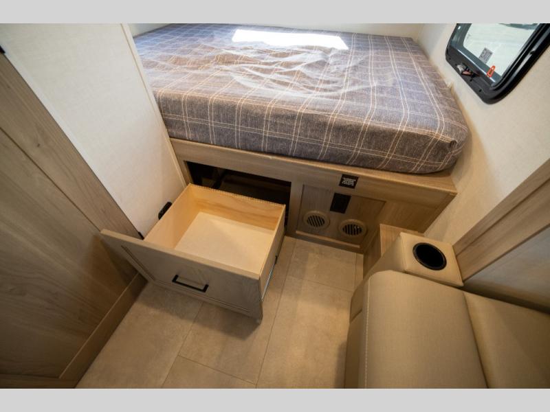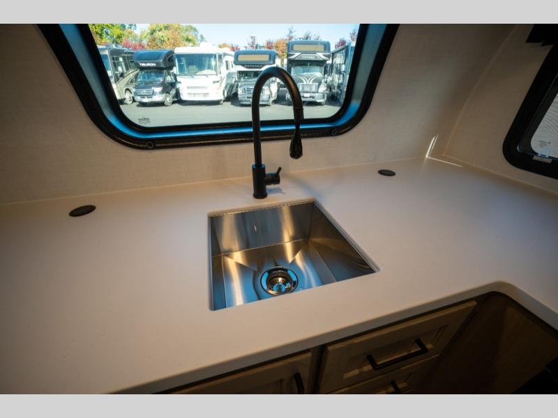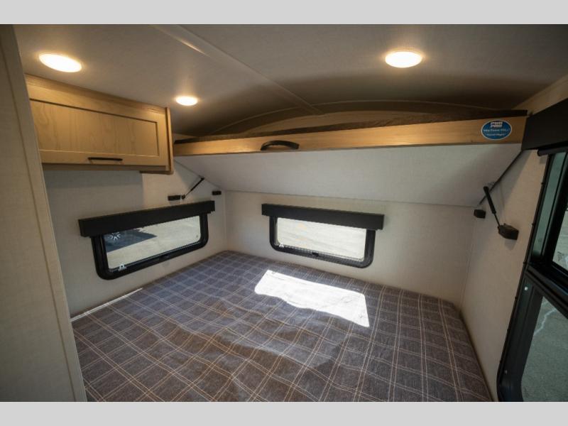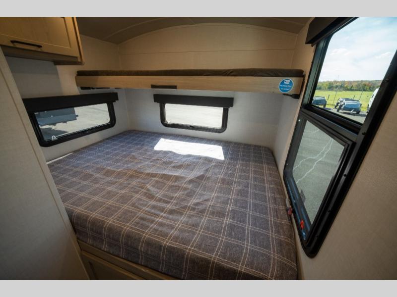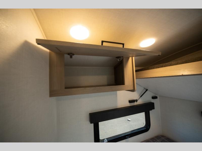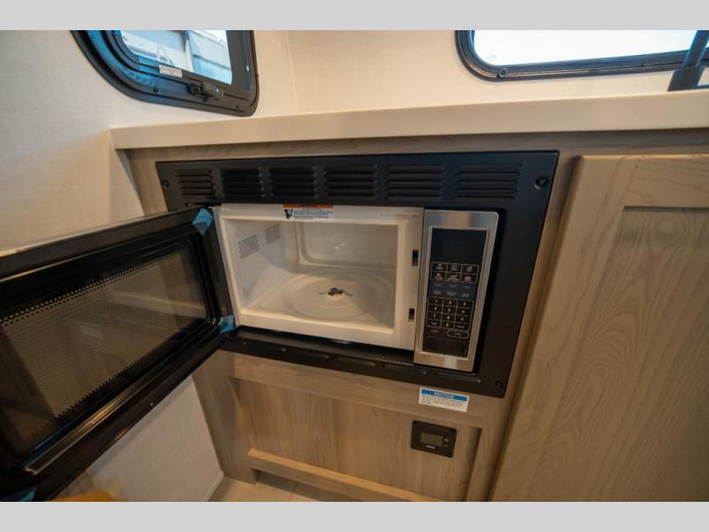 Are you looking for a lightweight trailer with at-home comforts? Take a look at this single slide out unit that can sleep three to four each night. There is a queen-size bed in the back with a 26" x 80" flip-up bunk for cozy sleeping space, a 72" sofa with cupholders to relax on, plus a 12V TV for movie nights! The front kitchen includes a 12V refrigerator to store food, plus a microwave oven and a gas oven to cook meals each day.