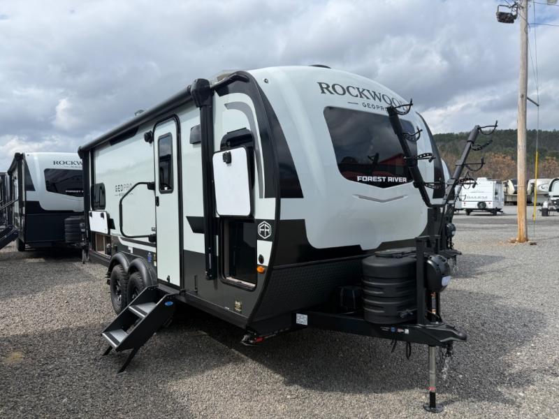 With any Rockwood GEO Pro travel trailer by Forest River you will enjoy easy towing, durable construction, and off-road capabilities with larger laminated roof! Each model is constructed with complete composite wall construction for added strength and durability, and Dexter® axles that will make towing easier than ever. Inside, you'll find sleek back up camera prep for added security, a refrigerator and a microwave, plus many other interior amenities that will make you feel at home on the road.