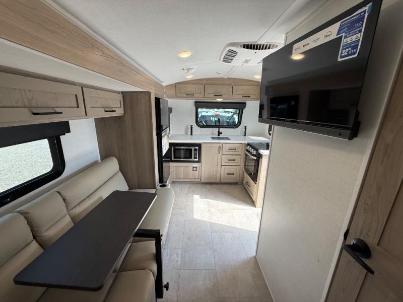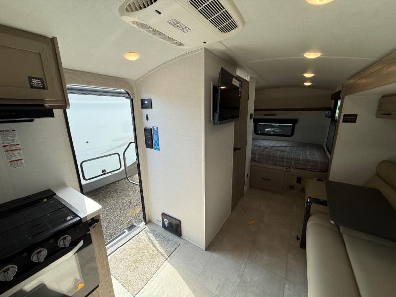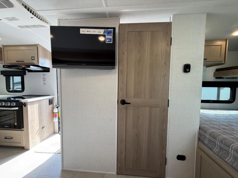 Are you looking for a lightweight trailer with at-home comforts? Take a look at this single slide out unit that can sleep three to four each night. There is a queen-size bed in the back with a 26" x 80" flip-up bunk for cozy sleeping space, a 72" sofa with cupholders to relax on, plus a 12V TV for movie nights! The front kitchen includes a 12V refrigerator to store food, plus a microwave oven and a gas oven to cook meals each day.