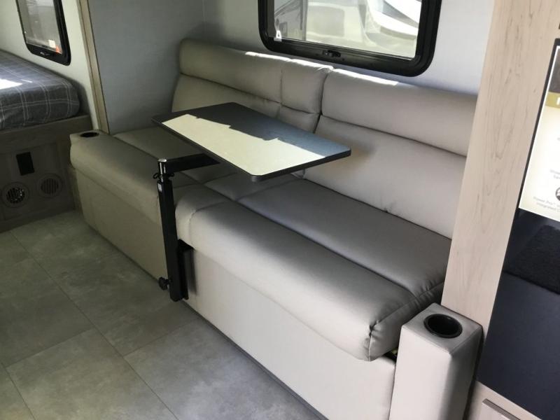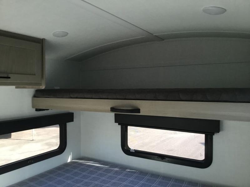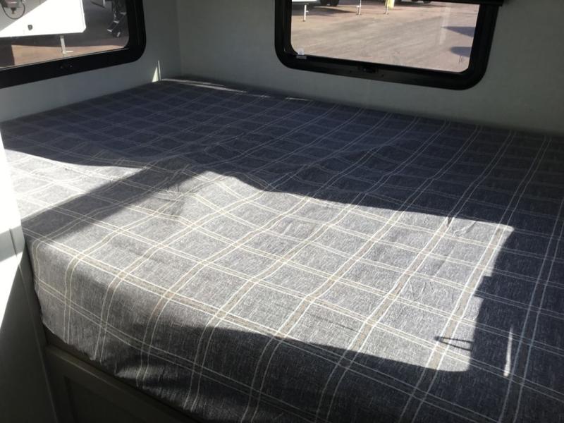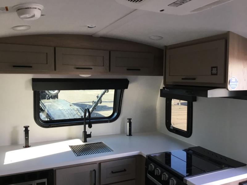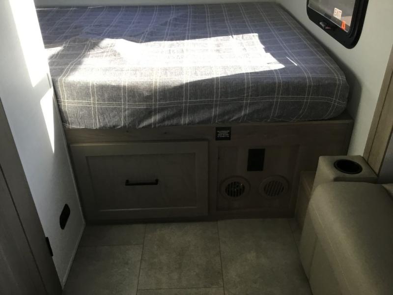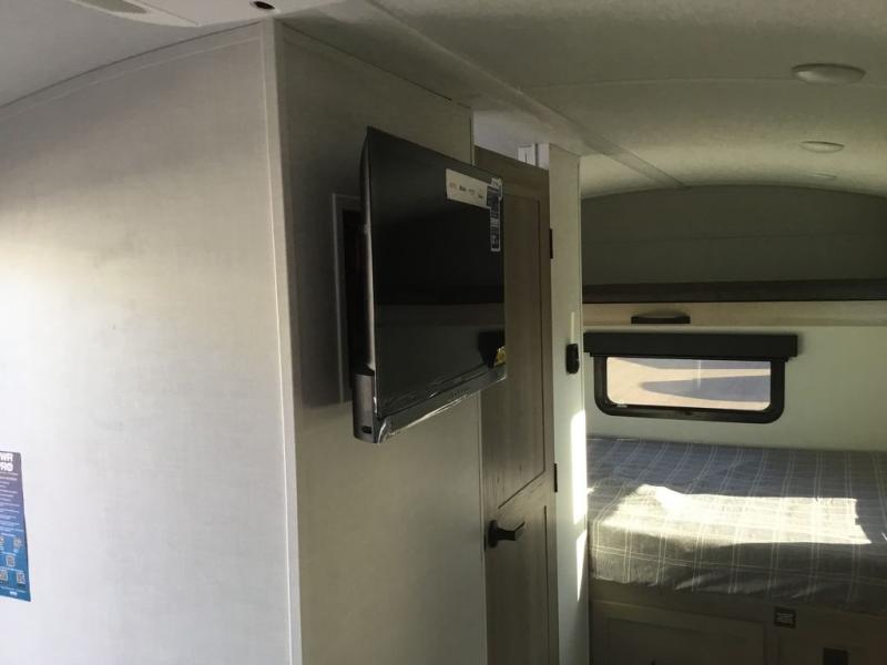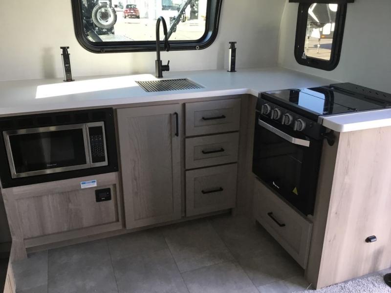 Are you looking for a lightweight trailer with at-home comforts? Take a look at this single slide out unit that can sleep three to four each night. There is a queen-size bed in the back with a 26" x 80" flip-up bunk for cozy sleeping space, a 72" sofa with cupholders to relax on, plus a 12V TV for movie nights! The front kitchen includes a 12V refrigerator to store food, plus a microwave oven and a gas oven to cook meals each day.