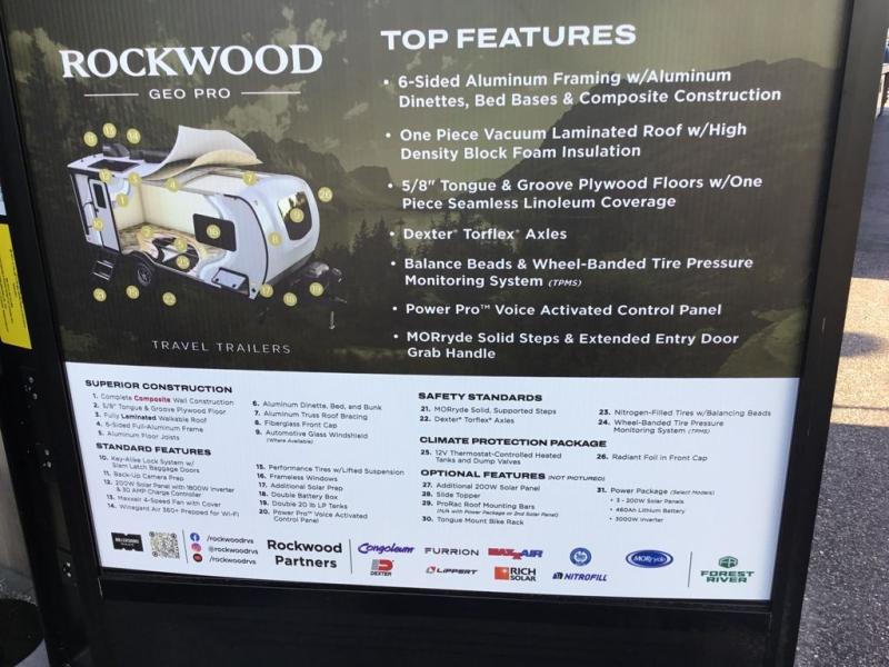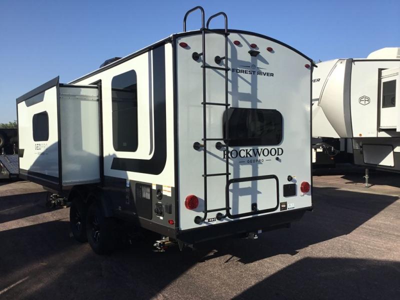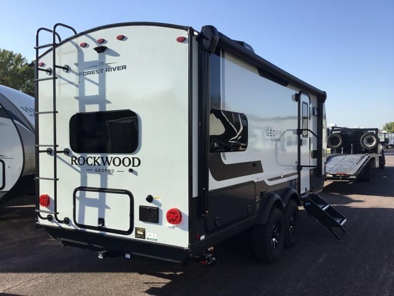 With any Rockwood GEO Pro travel trailer by Forest River you will enjoy easy towing, durable construction, and off-road capabilities with larger laminated roof! Each model is constructed with complete composite wall construction for added strength and durability, and Dexter® axles that will make towing easier than ever. Inside, you'll find sleek back up camera prep for added security, a refrigerator and a microwave, plus many other interior amenities that will make you feel at home on the road.
